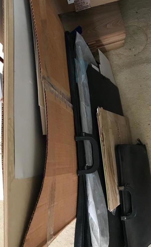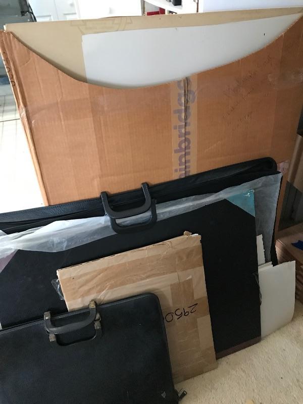 Over 100 sheets of 22“ x 30“ high quality acid free loose sheets of paper a large amount of sketch board and backing material large amount of illustration boards or sizes and colors and mix of other paper and boards and canvas material over 40 sheets of 26“ x 40“ paper from Yupo Company, & 2 portfolio bags