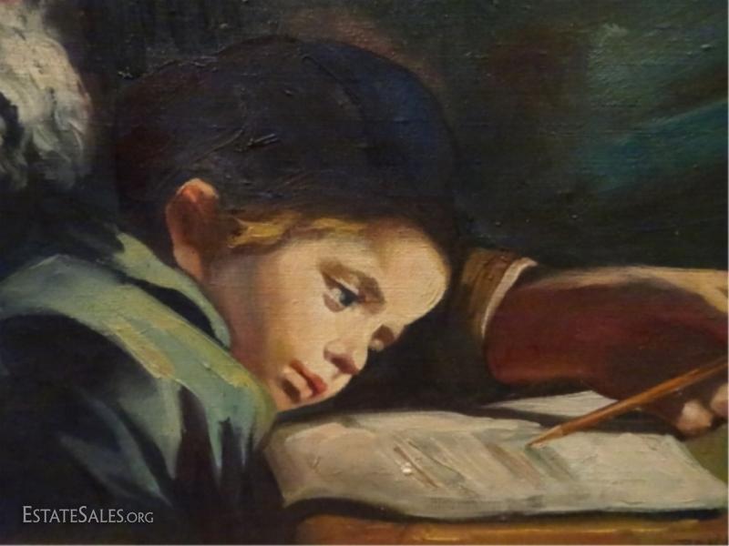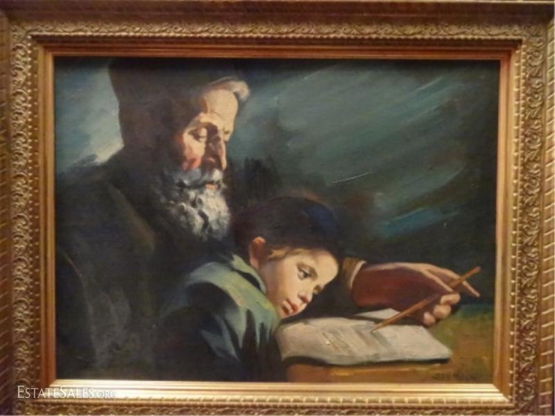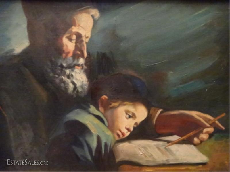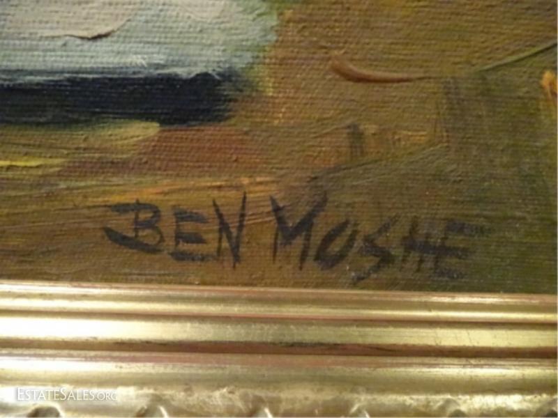 LOT 125A: BEN MOSHE SIGNED OIL ON CANVAS PAINTING, MAN AND CHILD, SIGNED BEN MOSHE LOWER RIGHT, VERY GOOD CONDITION, FRAMED SIZE 27.5"W X 22"H, SKU127