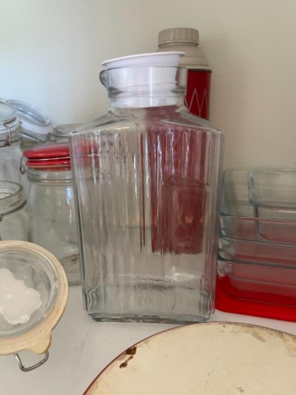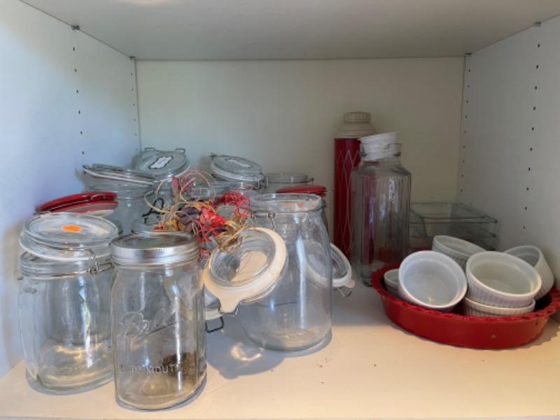 Lot 125K. Collection of hermetically sealed jars, vintage thermos, ramekins, pottery pie plate, Anchor Hocking juice jars, Pyrex food savers