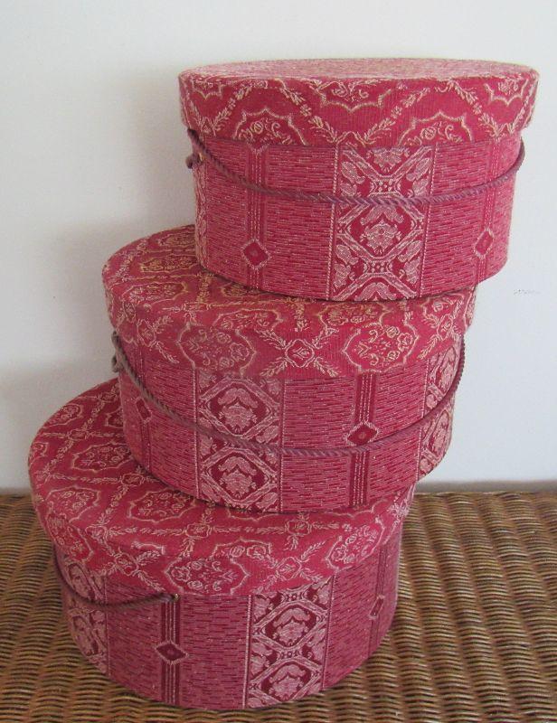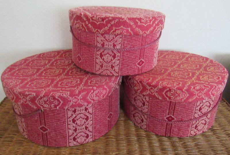 Lot 126-Vintage Stacking decorative cloth fabric hat boxes L,M,S