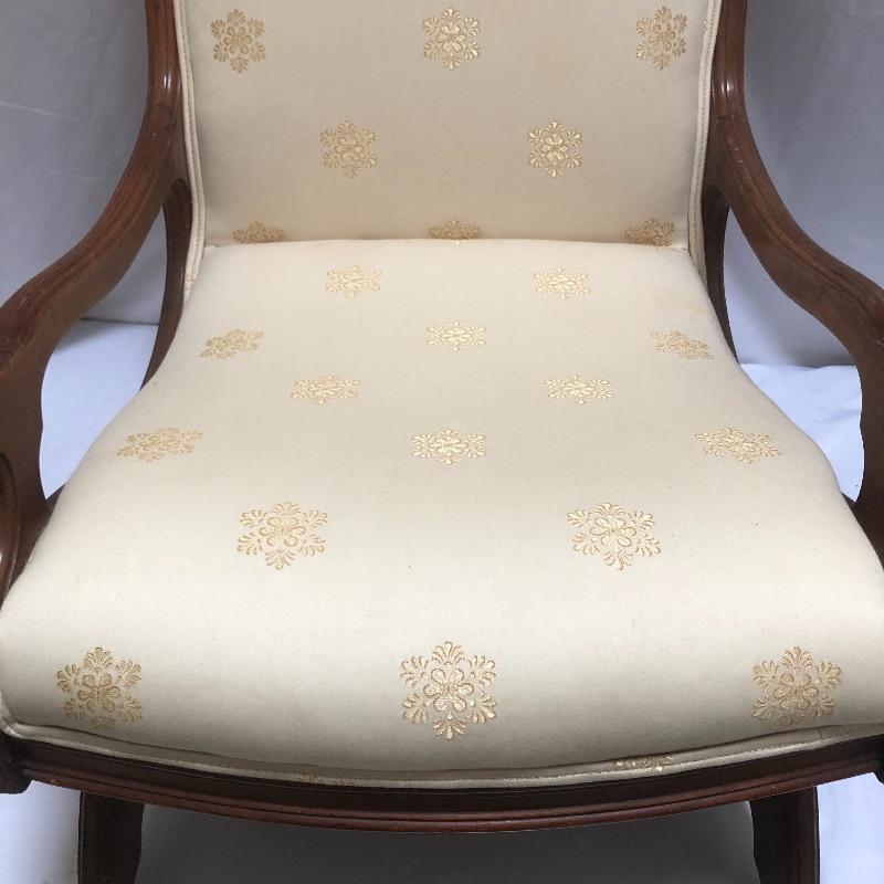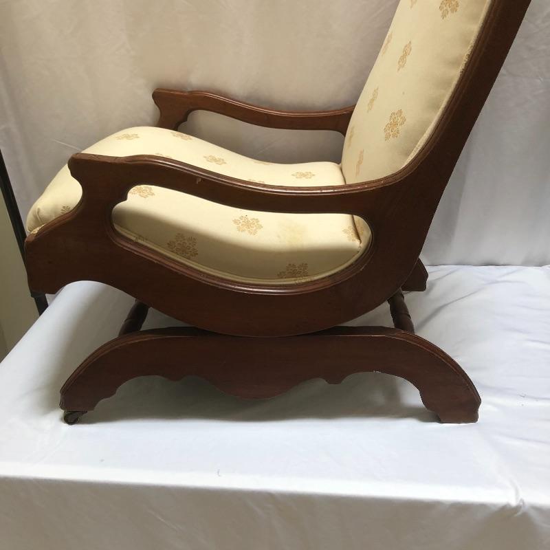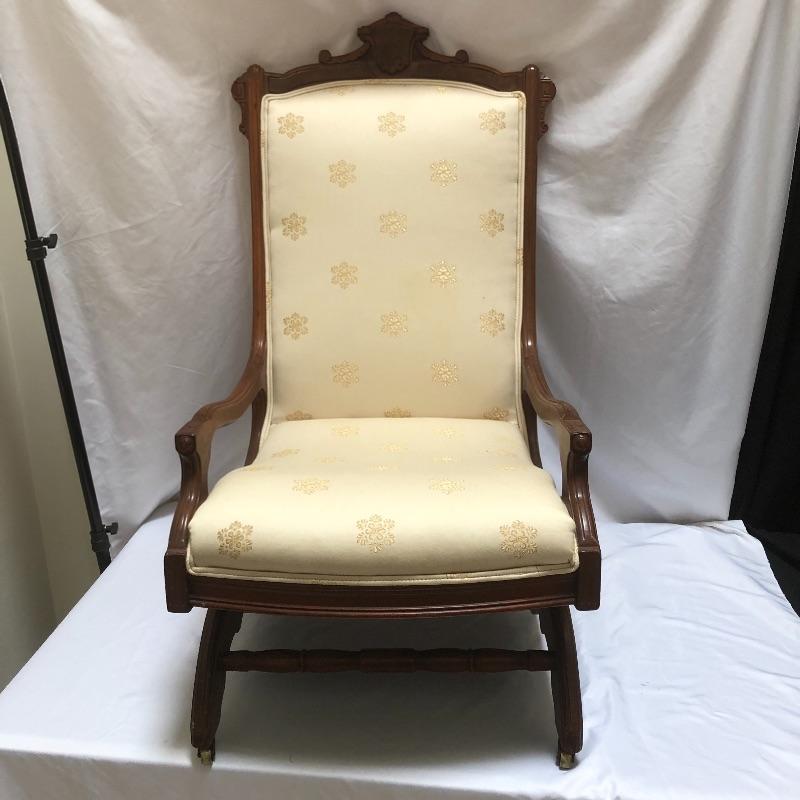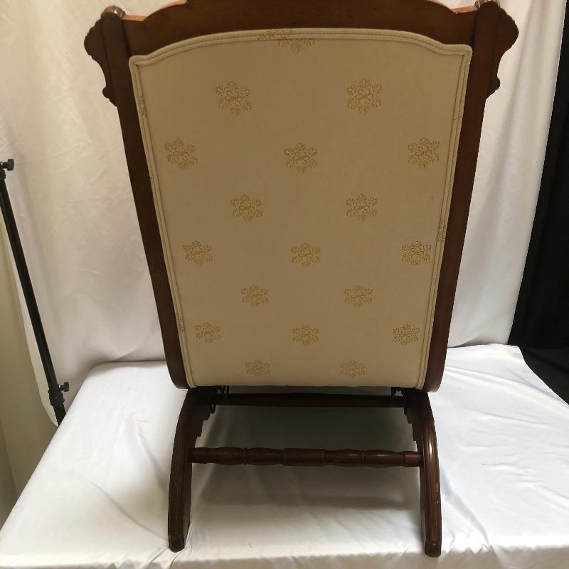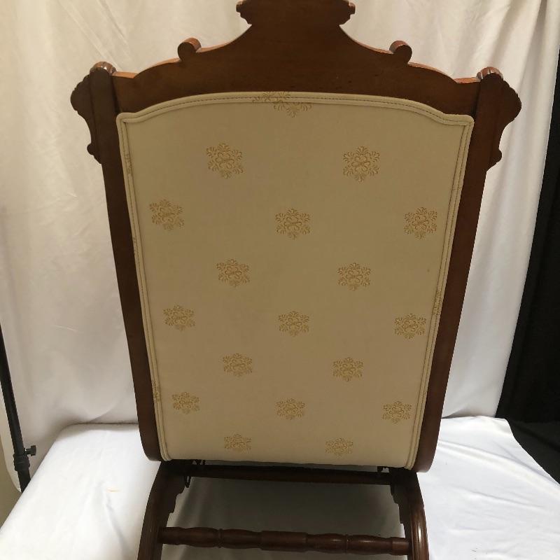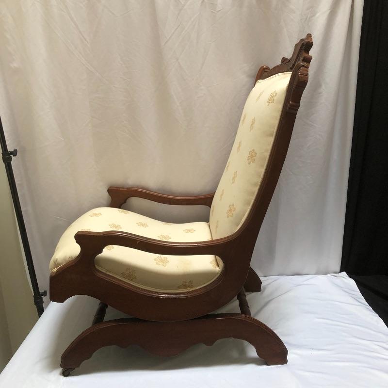 This unique wooden framed padded rocker will be a great place to sit back and relax on. Chair has casters on front with a ivory colored fabric with a gold pattern. Chair measures 19” x 28.5” x 40” with a seat height of 15.5”.