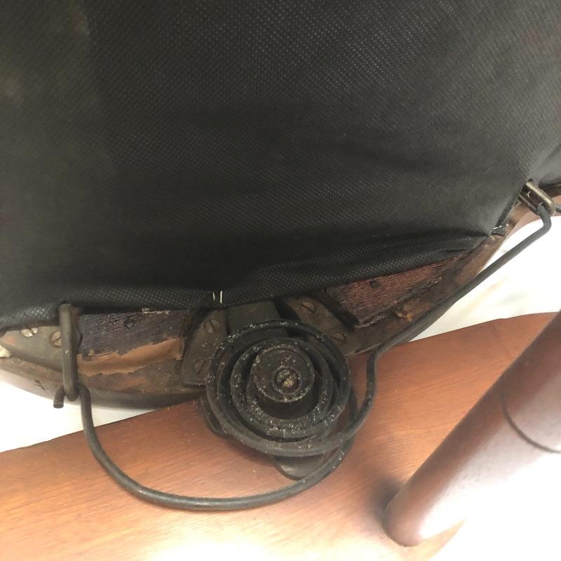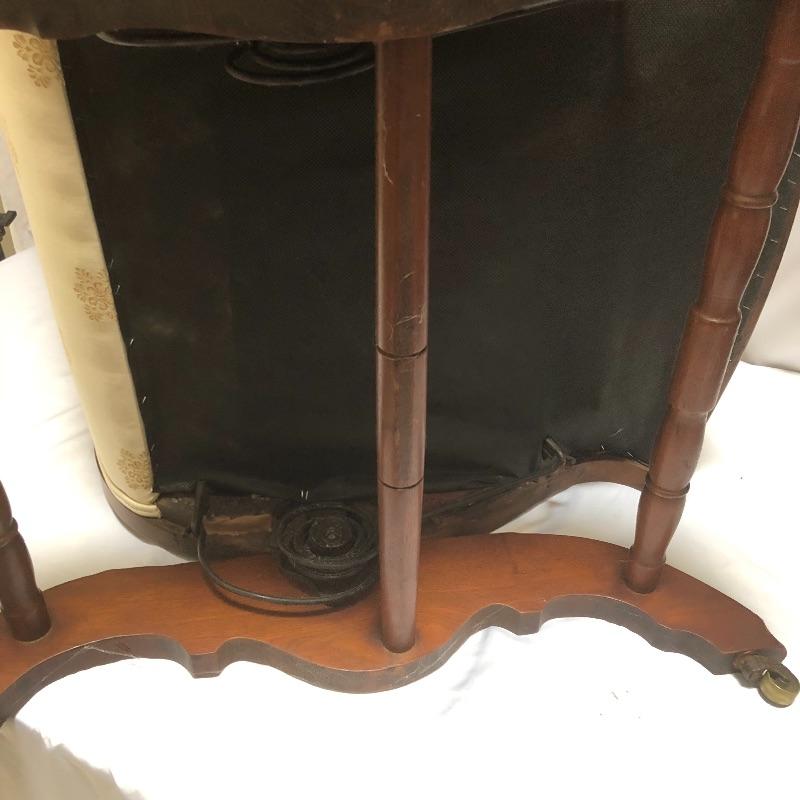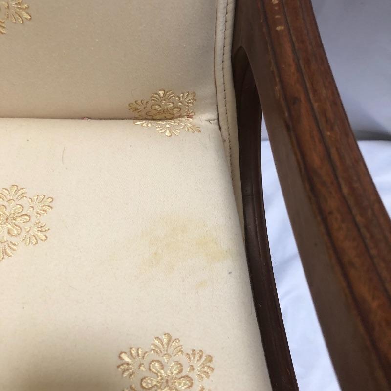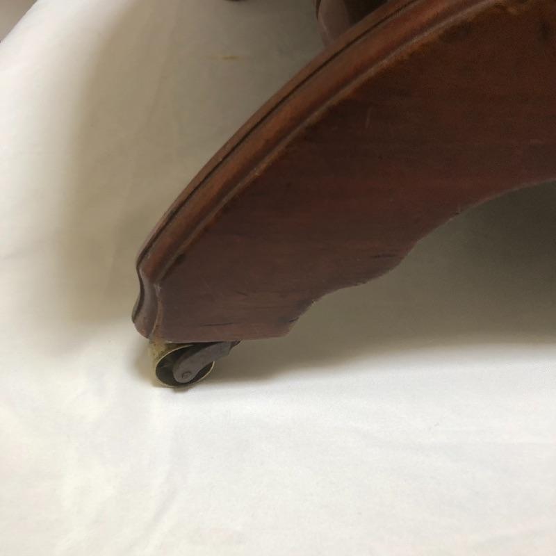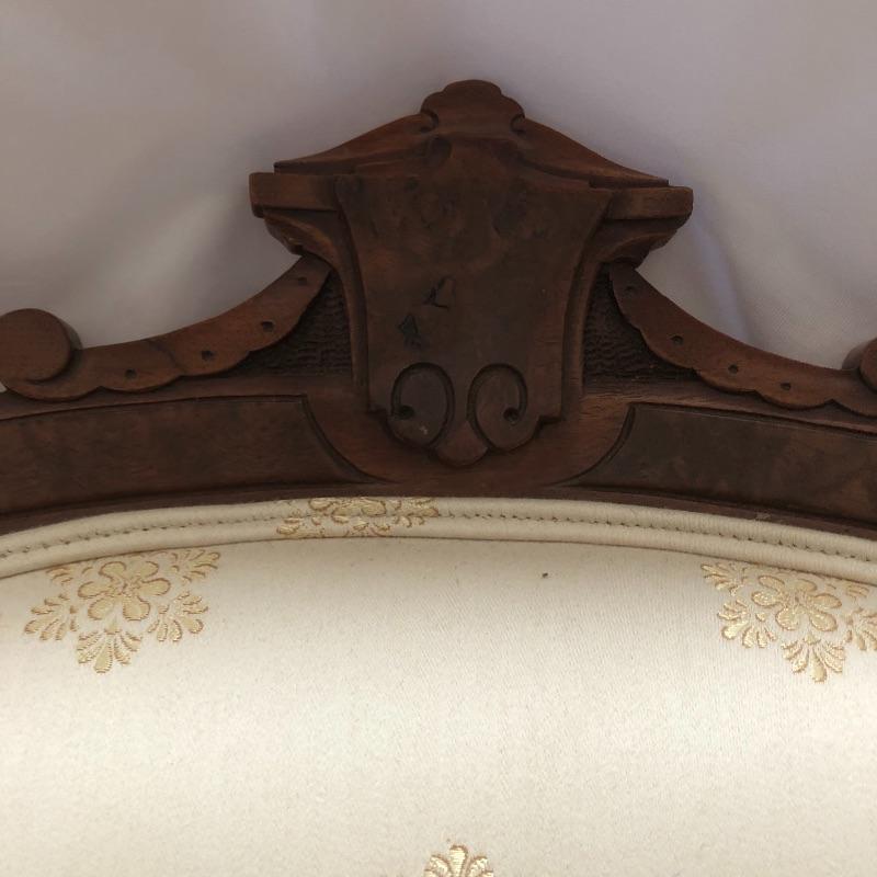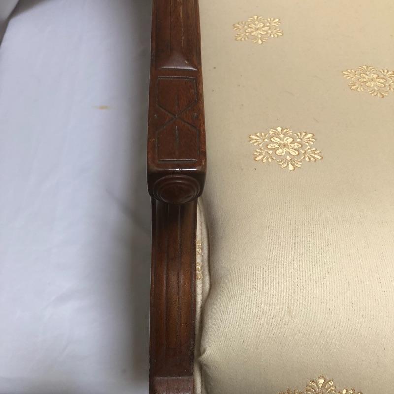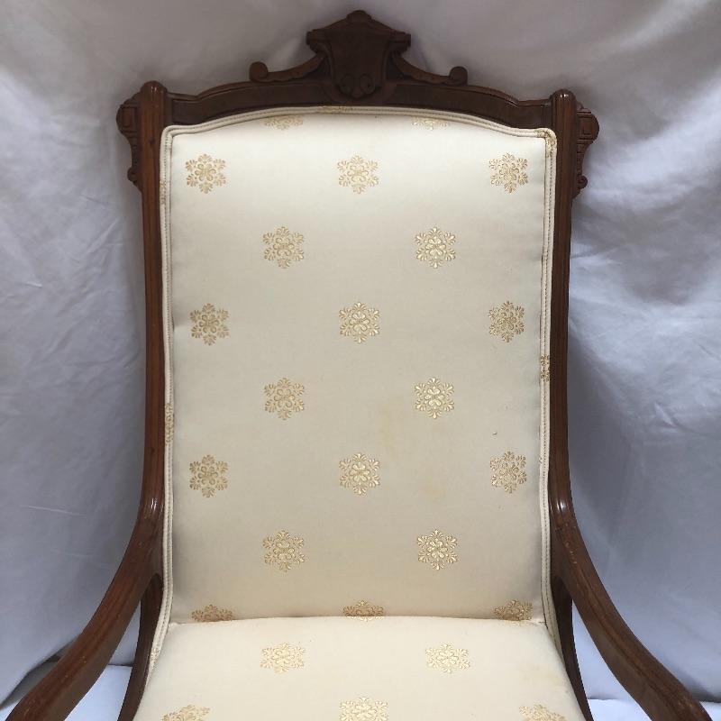 This unique wooden framed padded rocker will be a great place to sit back and relax on. Chair has casters on front with a ivory colored fabric with a gold pattern. Chair measures 19” x 28.5” x 40” with a seat height of 15.5”.