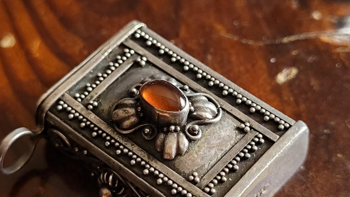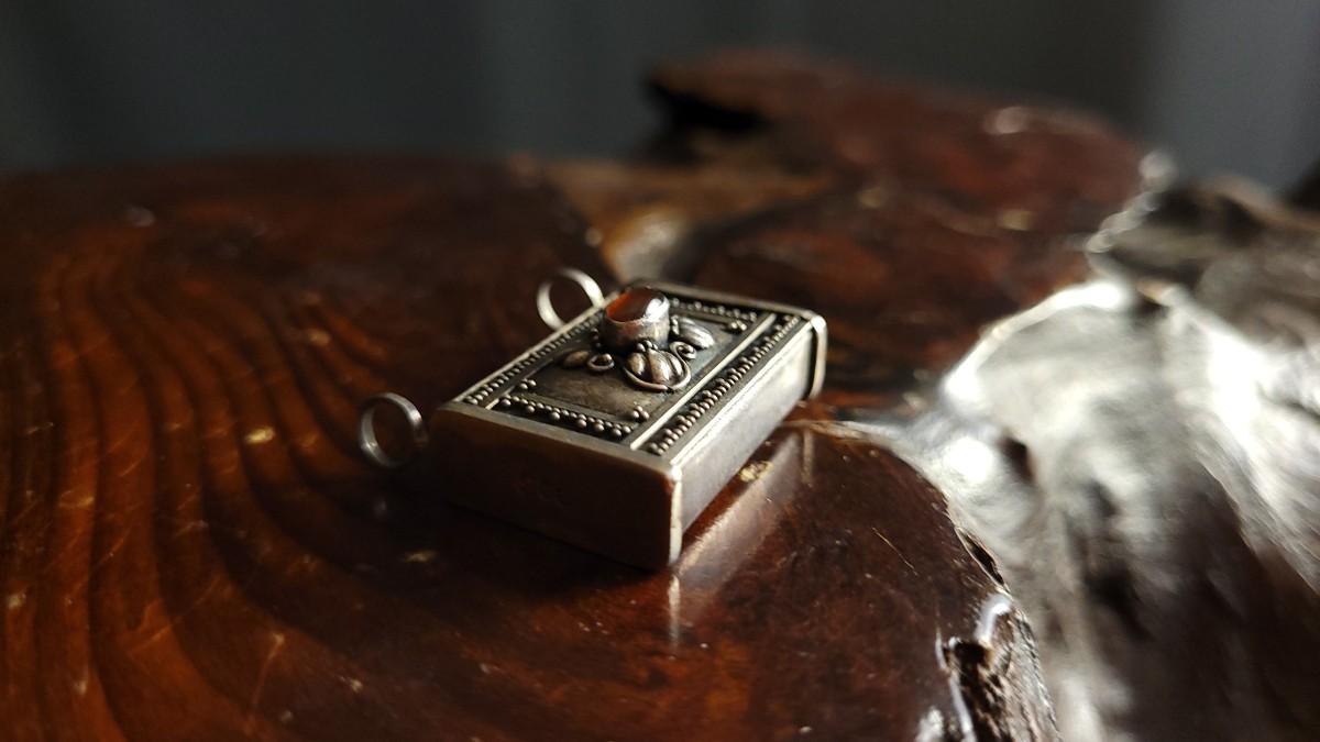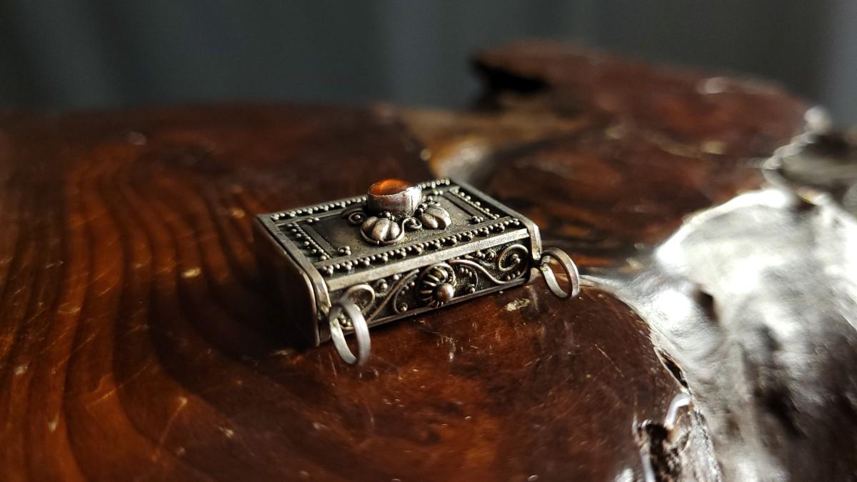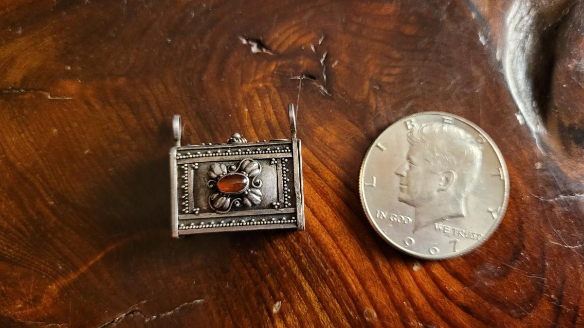 This lot features a beautiful Vintage Ornate handmade Sterling Silver Trinket Box w/ Jewel Accent Necklace Pendant. This pendant is in wonderful condition for age and is unpolished. A Half Dollar has been added to one of the photos for scale (is not included inthe auction).