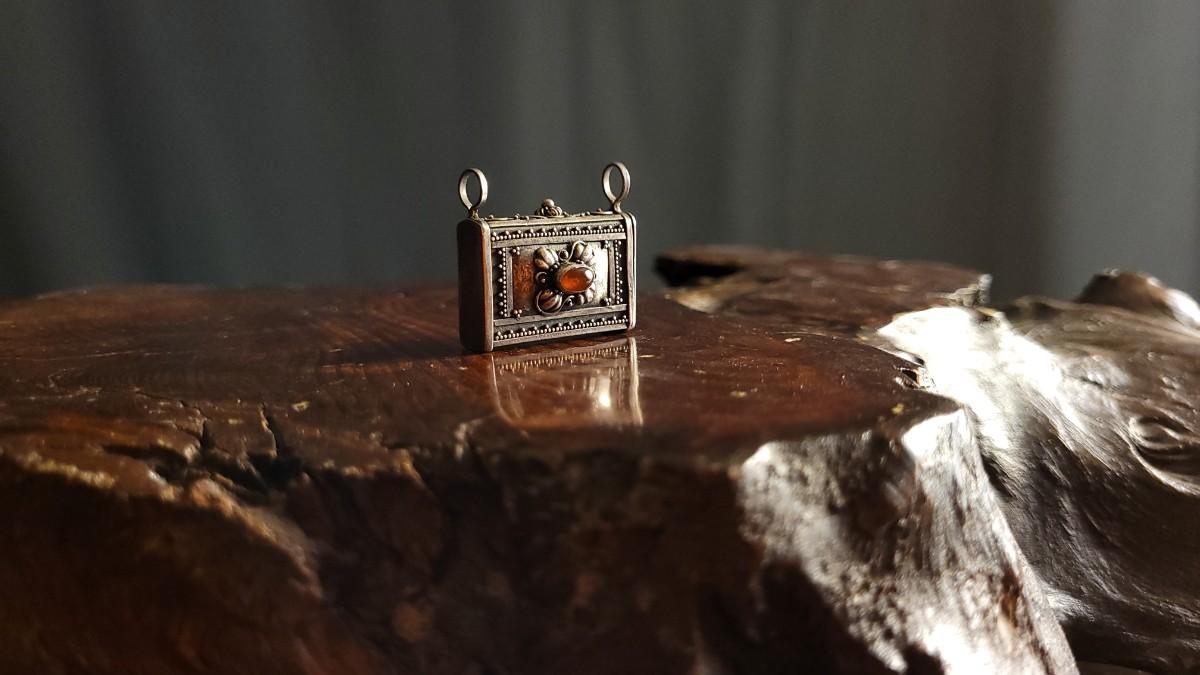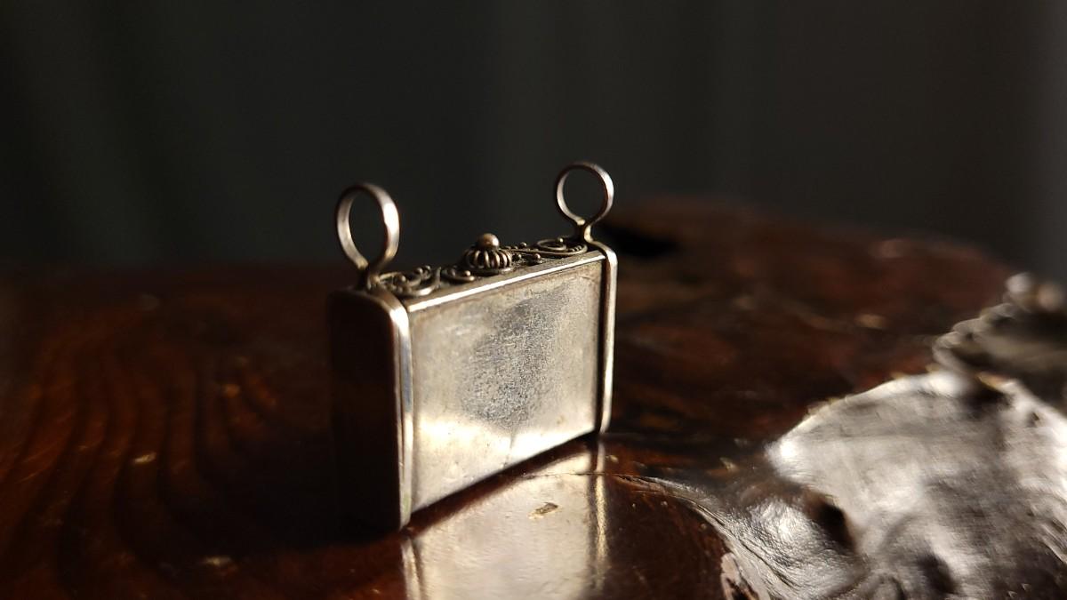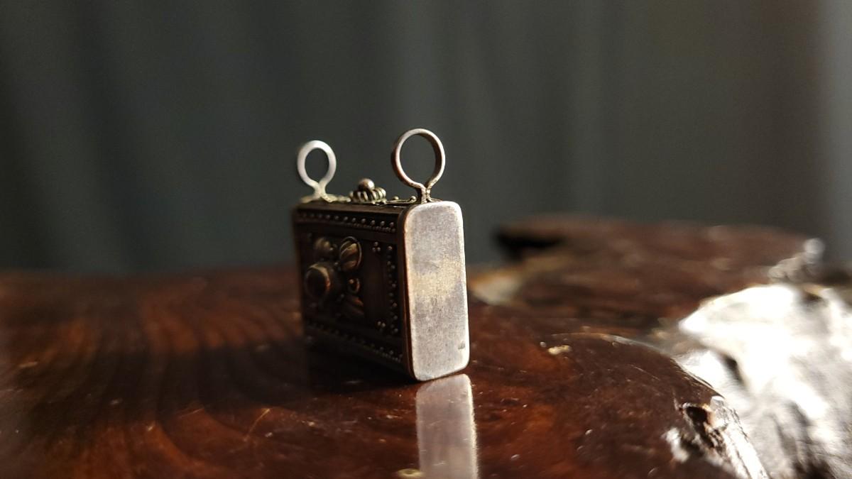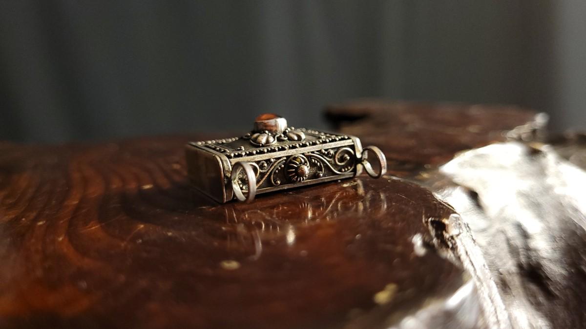 This lot features a beautiful Vintage Ornate handmade Sterling Silver Trinket Box w/ Jewel Accent Necklace Pendant. This pendant is in wonderful condition for age and is unpolished. A Half Dollar has been added to one of the photos for scale (is not included inthe auction).