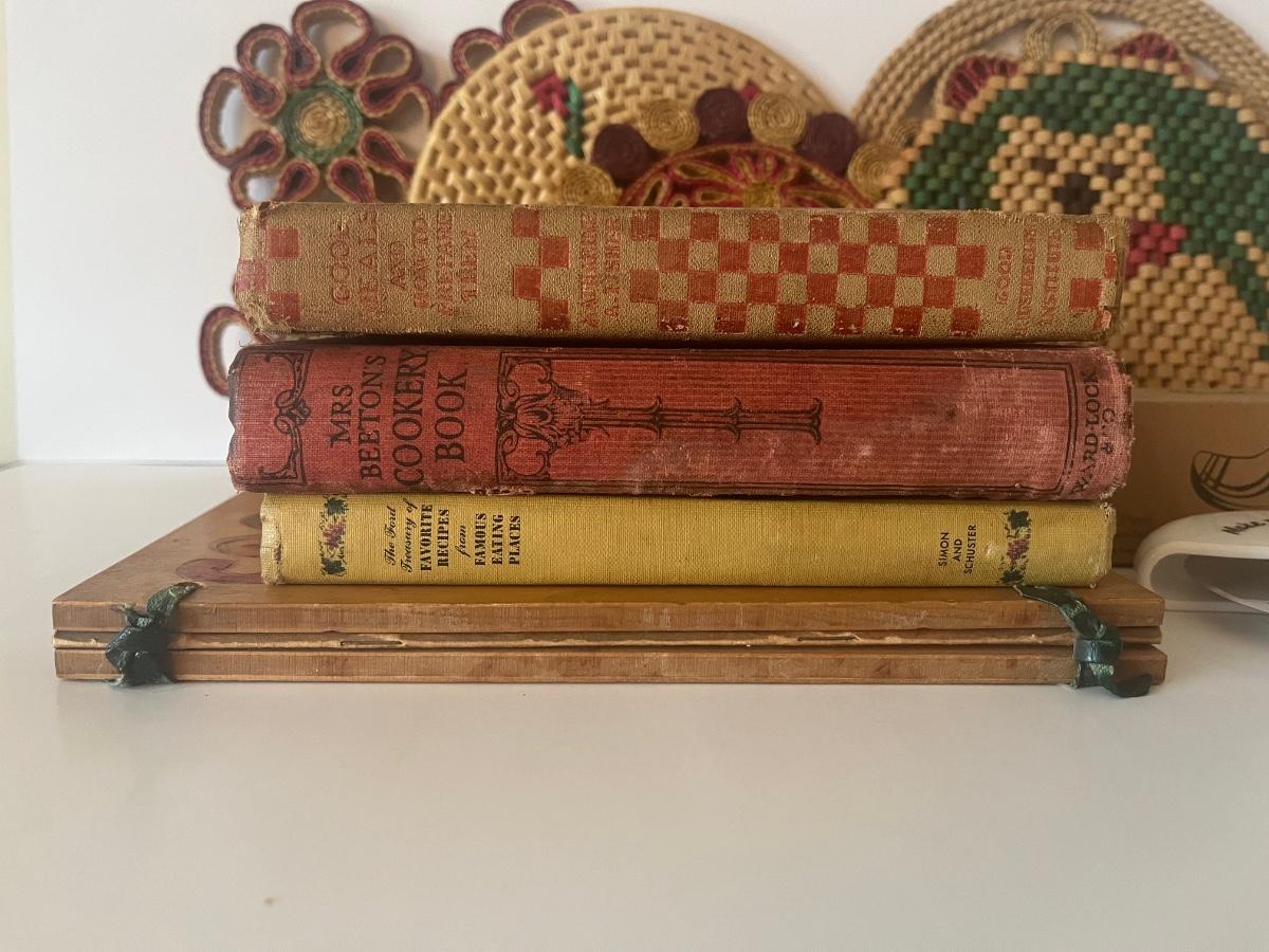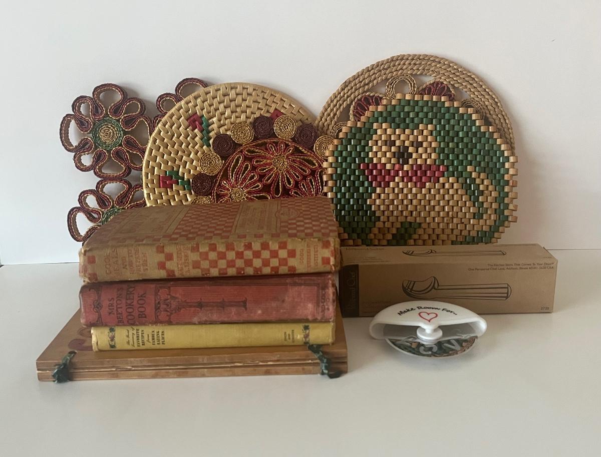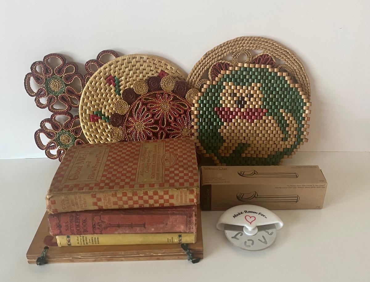 Lot 126: Vintage Cookbooks, Pampered Chef, Wicker Trivets and More