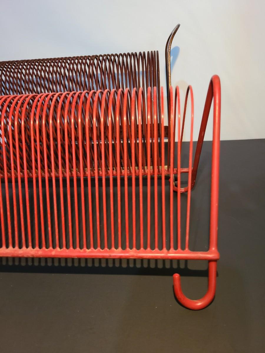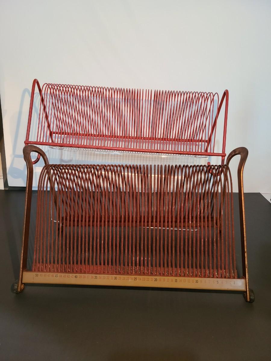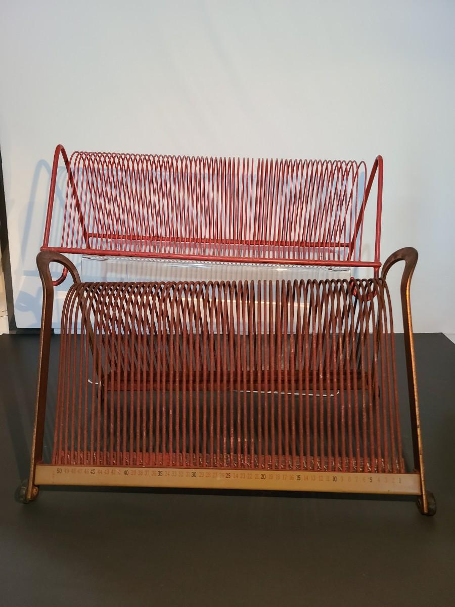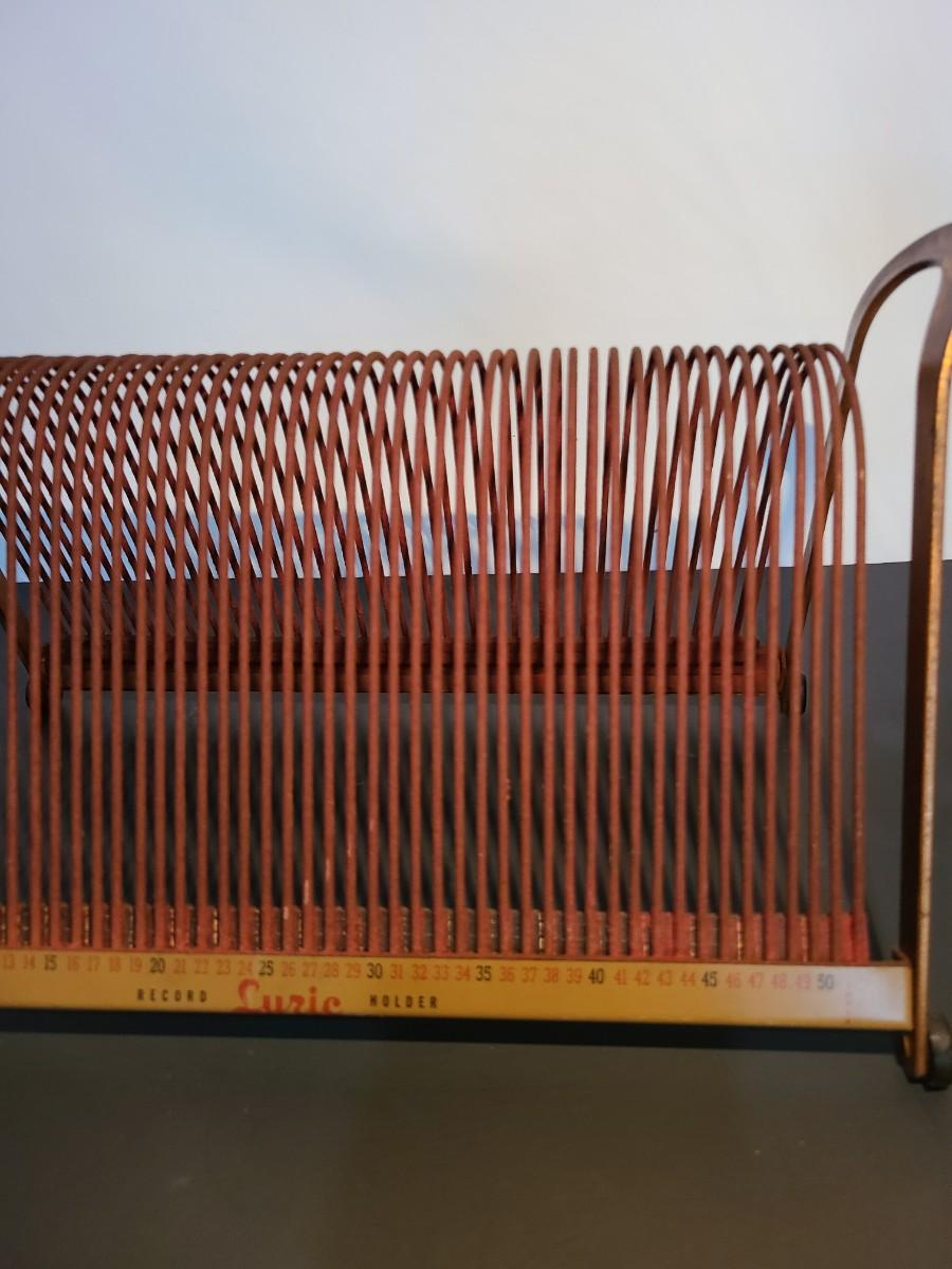 Vintage record hders. Both show wear from age and use. The red one is great as found, the metal Luric shows some age to metal but could be painted a pop of color too. Please see pictures for condition and measurements.
