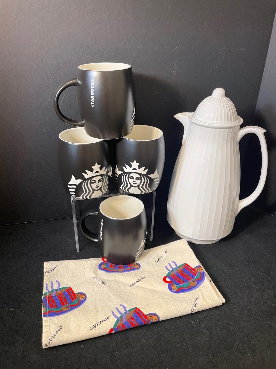Includes 4 Starbucks black coffee mugs, thermal carafe and a dish towel.