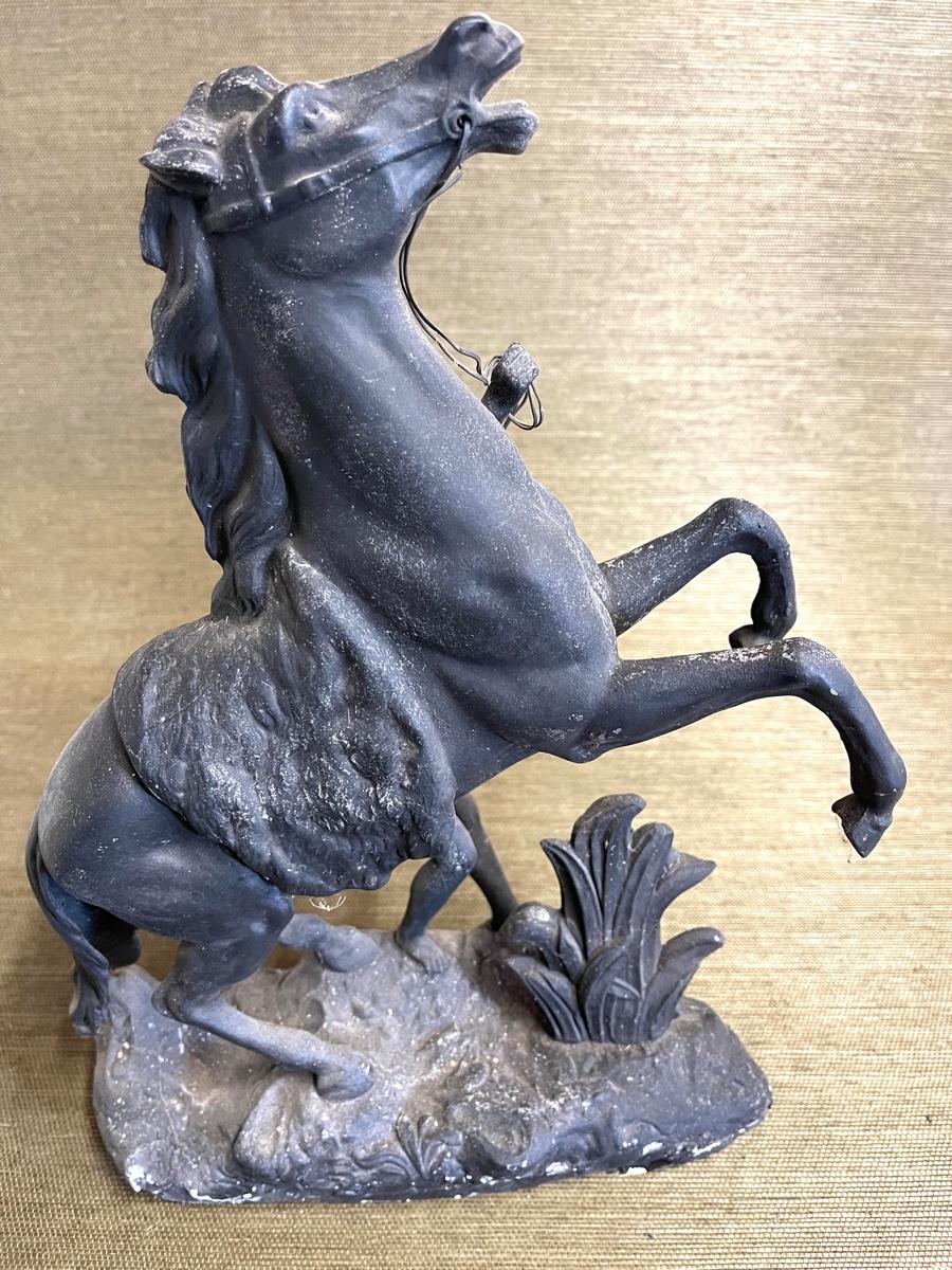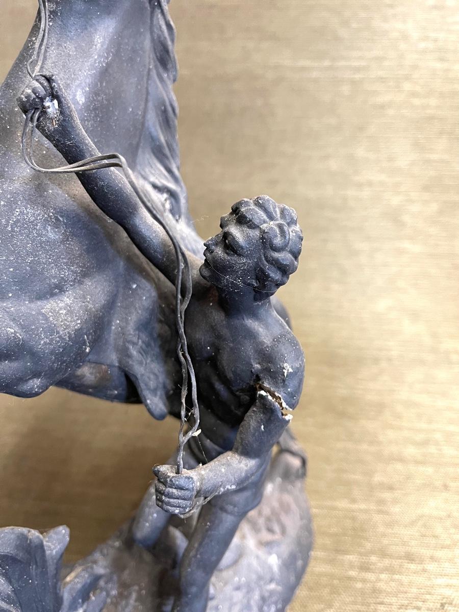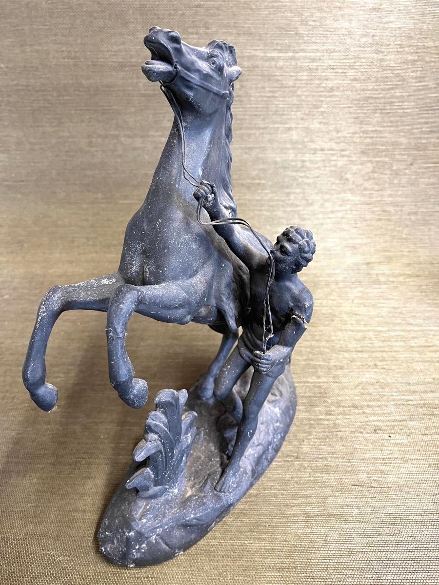 LOT 128 Antique Plaster Figurine Horse and Man. We have three similar items and it was suggested to us that perhaps these were prototypes of a large metal sculpture or statue. The first two are metal and the third is plaster. This item is the PLASTER figurine. Please view in person to see the condition of this item. This item is part of the David-Pleydell-Bouverie Estate at Bouverie Ranch in Glen Ellen. This item can be viewed at our Green + Cate Showroom in Sebastopol from July 15th - July 18th between the hours of 9am-5pm. For the benefit of the Bouverie Preserve of Audubon Canyon Ranch.