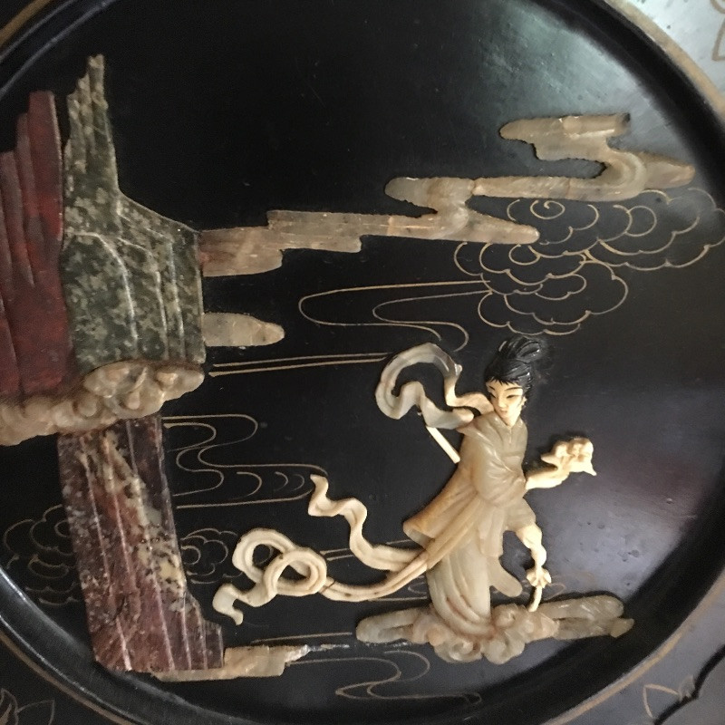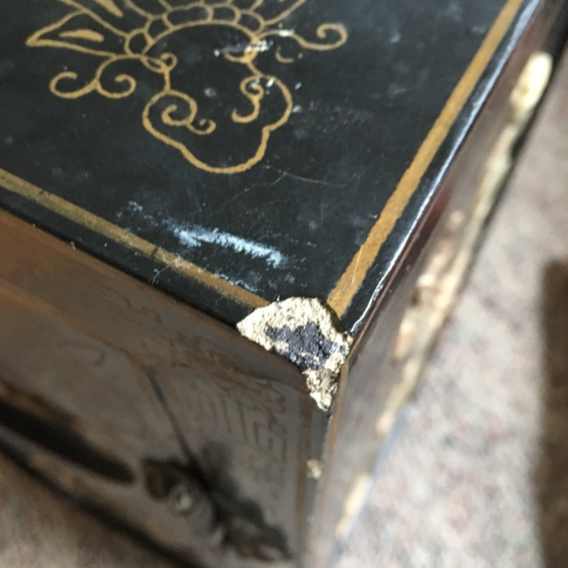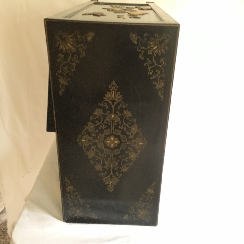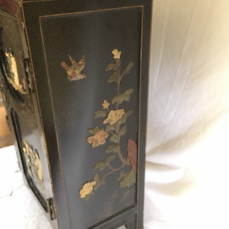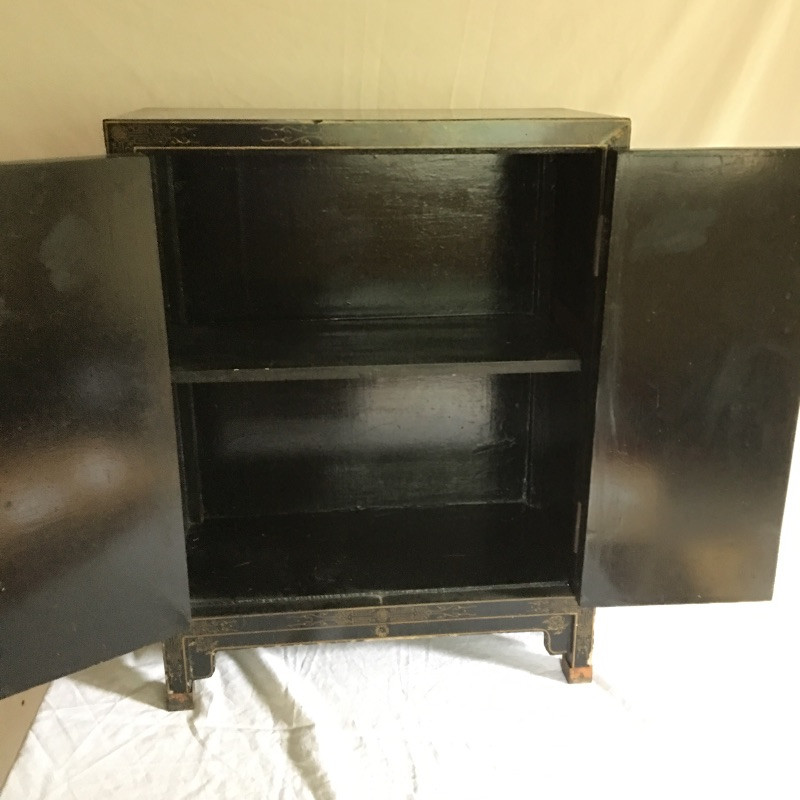 Asian cabinet with intricate designs on front and sides - see pictures. Beautiful cabinet has a few nicks and scratches, but is still a very nice piece. Cabinet measures 11.25” x 23” x 30”.
