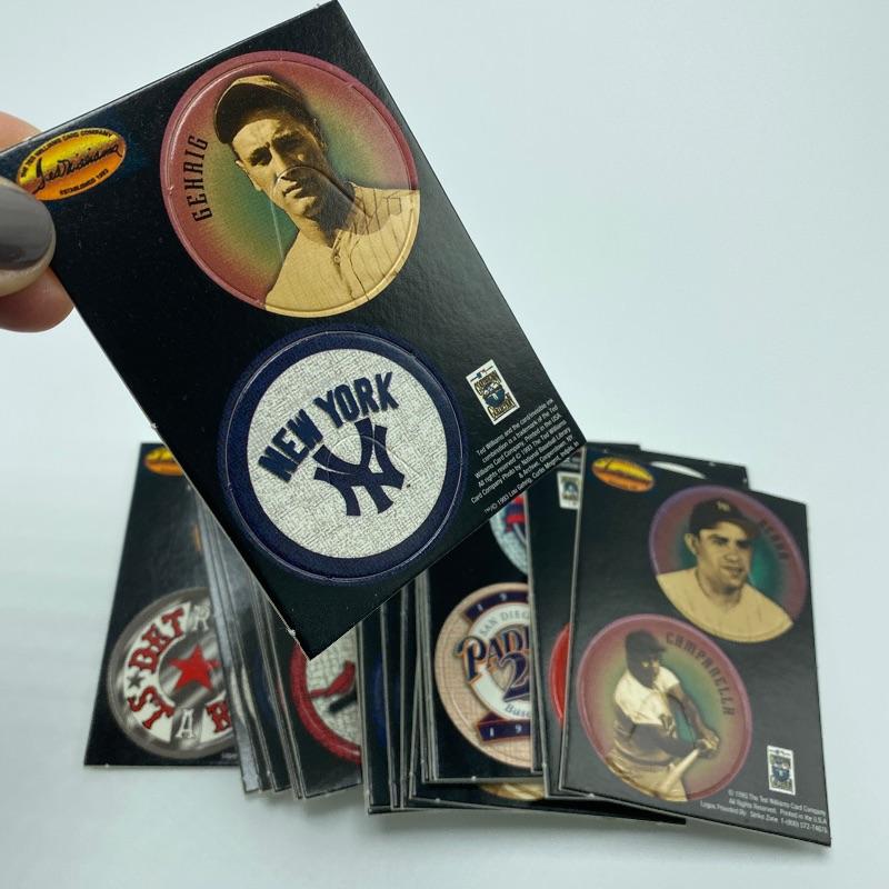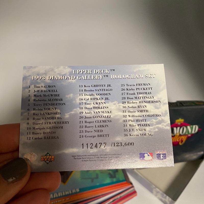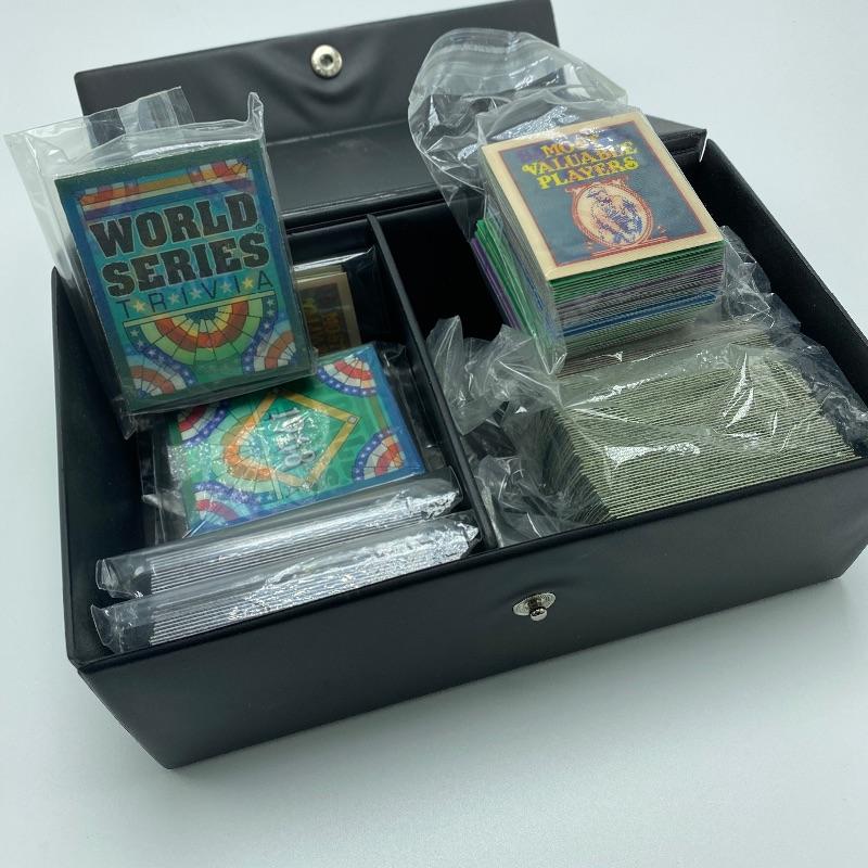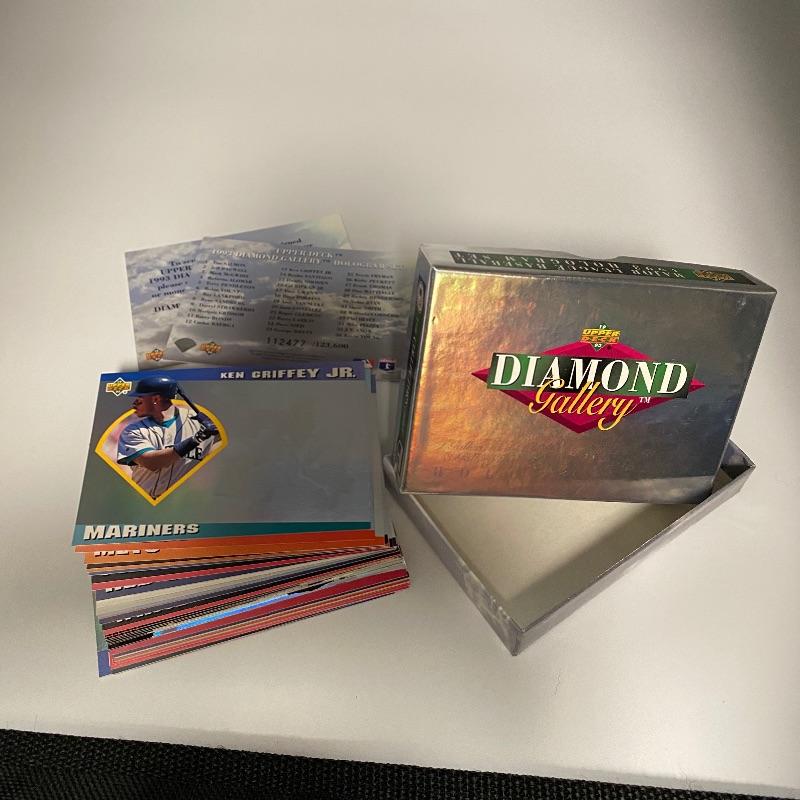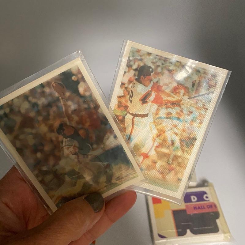 Super sweet sets of baseball puzzle cards, hologram cards, studio cards round medallion pieces, trivia cards and mini stat cards. There is a black case with mini world series and other trivia holograph cards that's fun! There are a lot of cards with lenticular print with athlete in two photos on same card. And don't miss the Diamond Gallery Hologram Set!