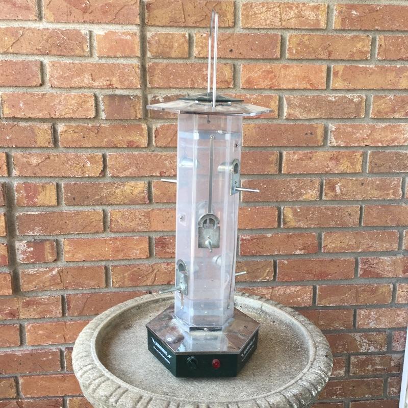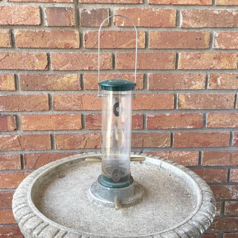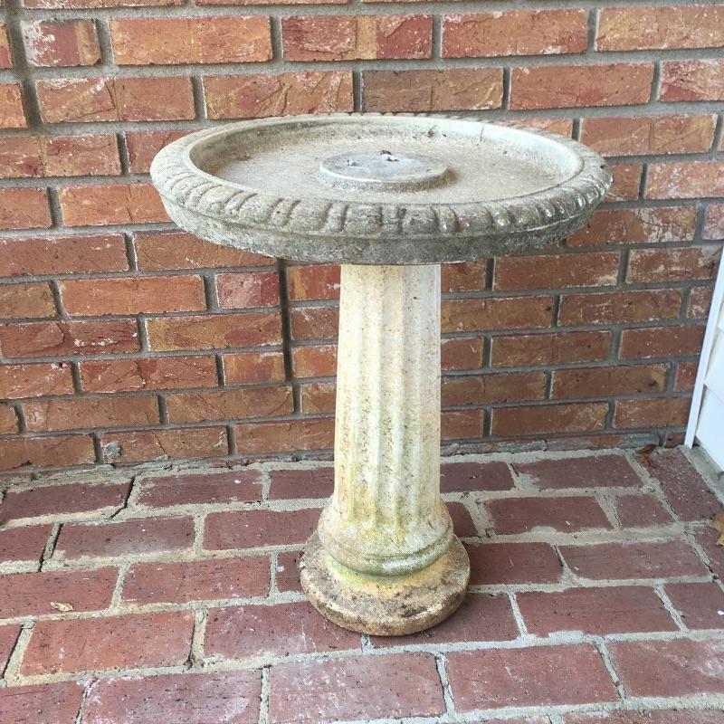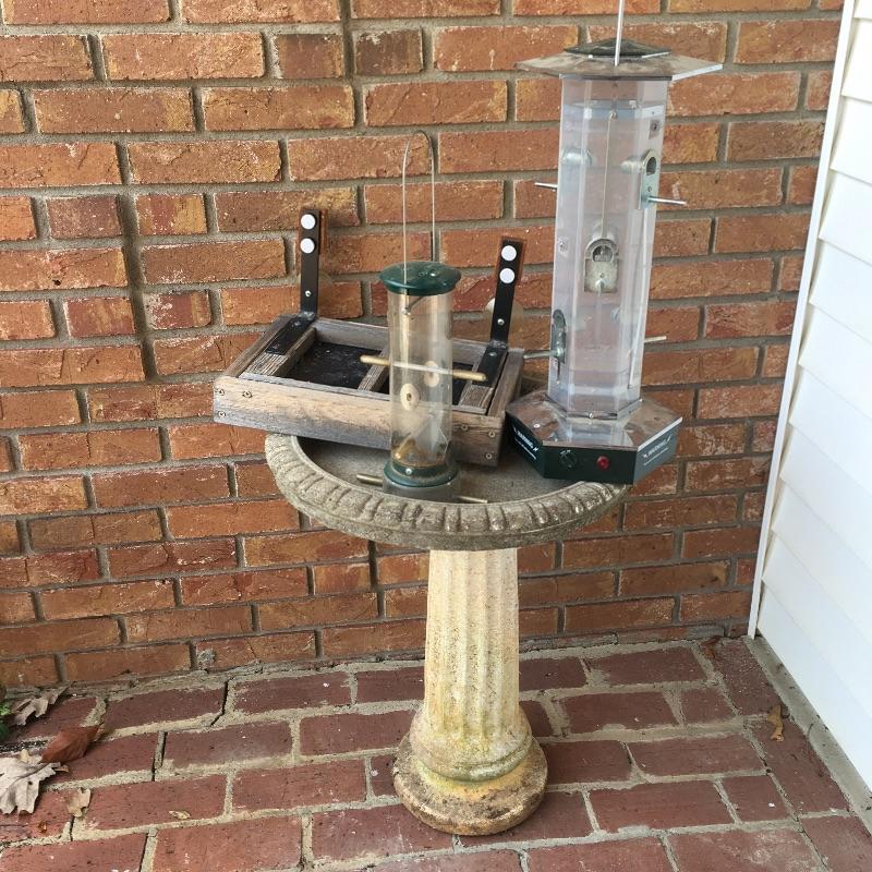 Lot includes bird bath that measures 18.5”D x 23” tall, two hanging bird feeders and one window feeder. One hanging feeder has squirrel deterrent that was not tested as it has no batteries. Keep all your birds clean and fat this winter with this great lot.