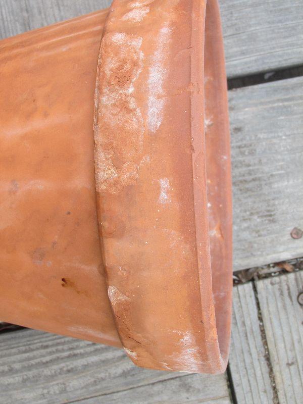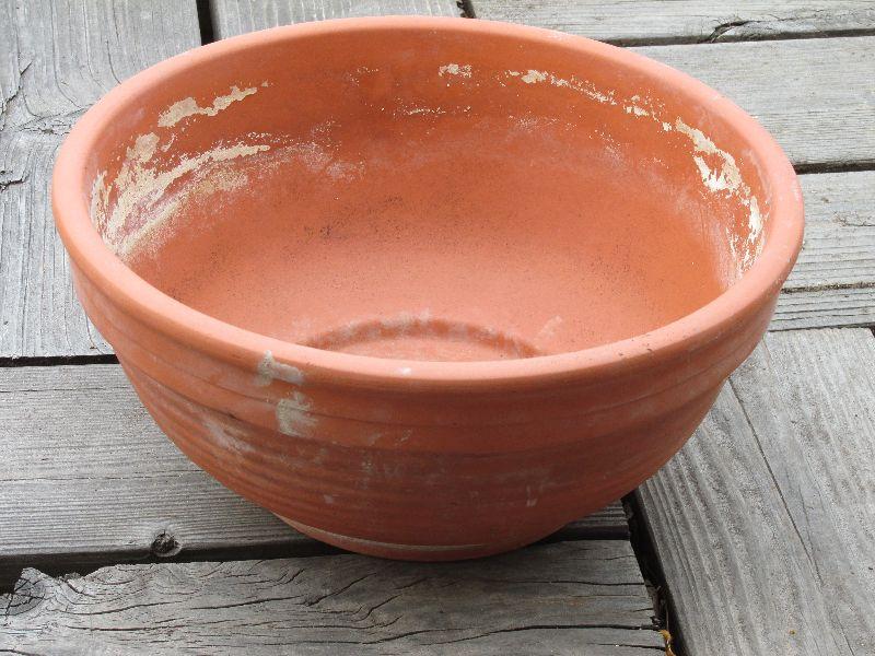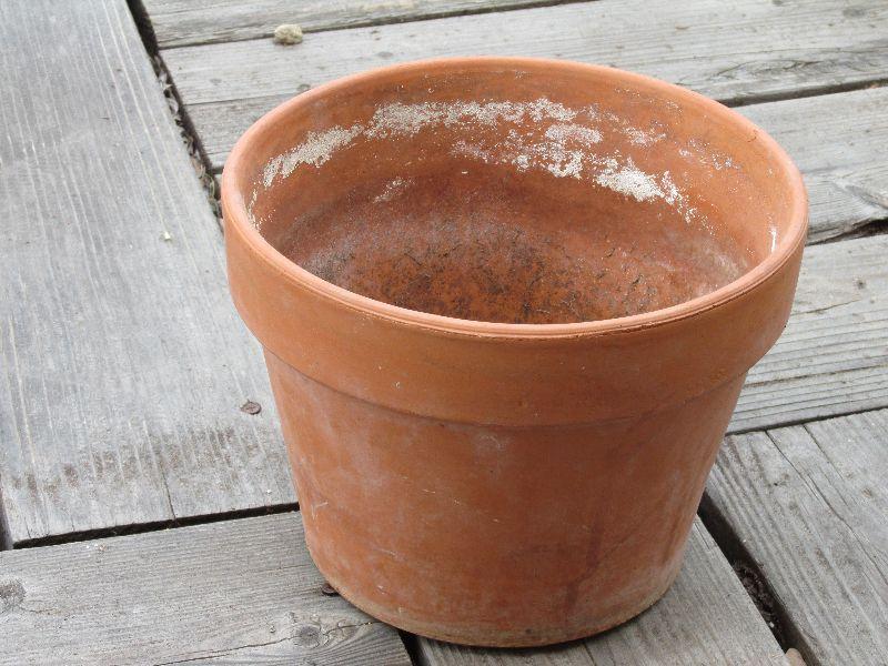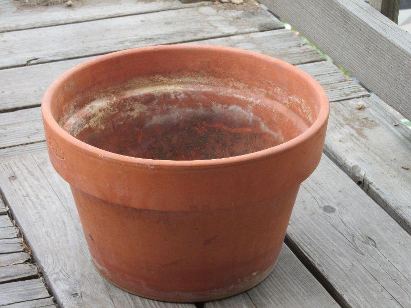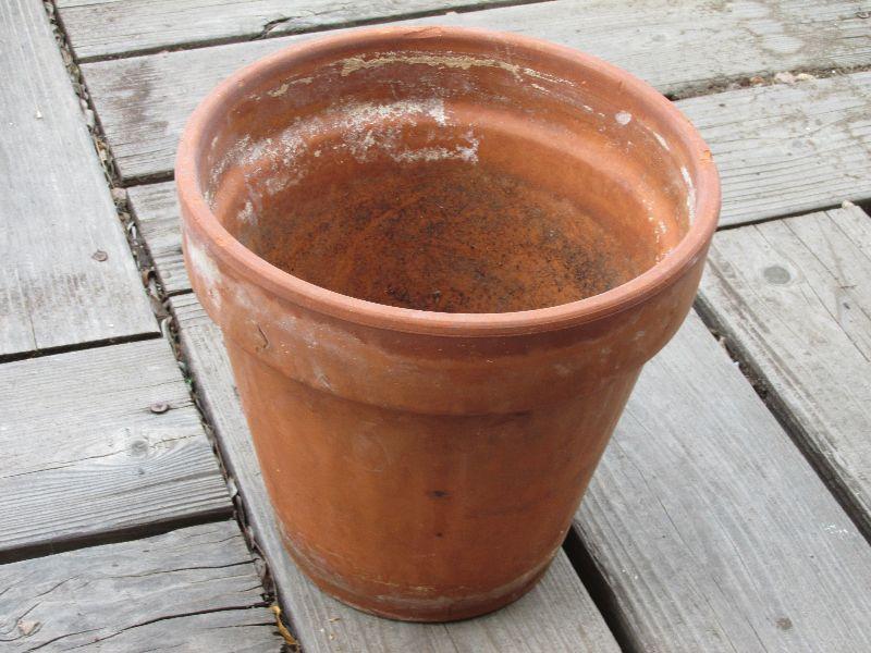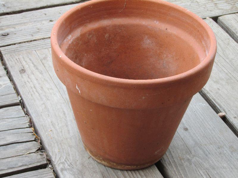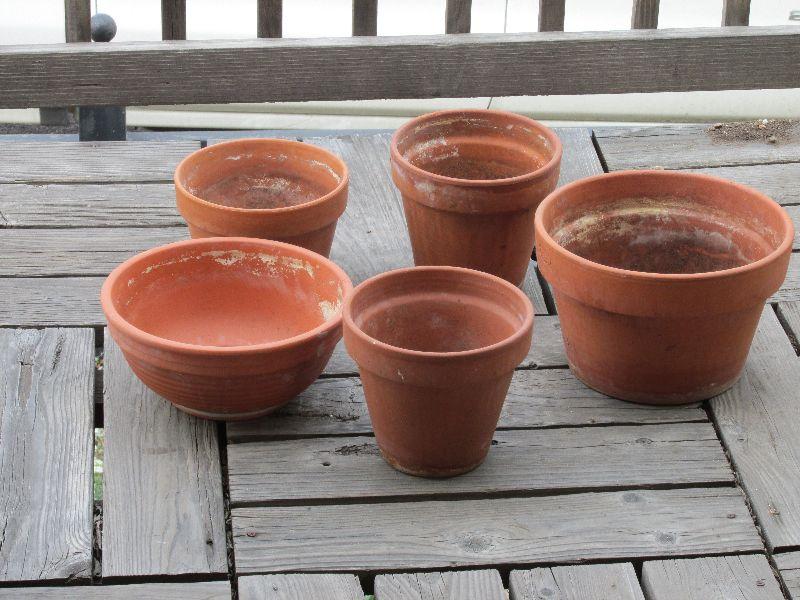Set of Five Basic Brown Pots. Two are the same size, the other three are of differing sizes and shapes. All the pots are used and have water stains as a result.