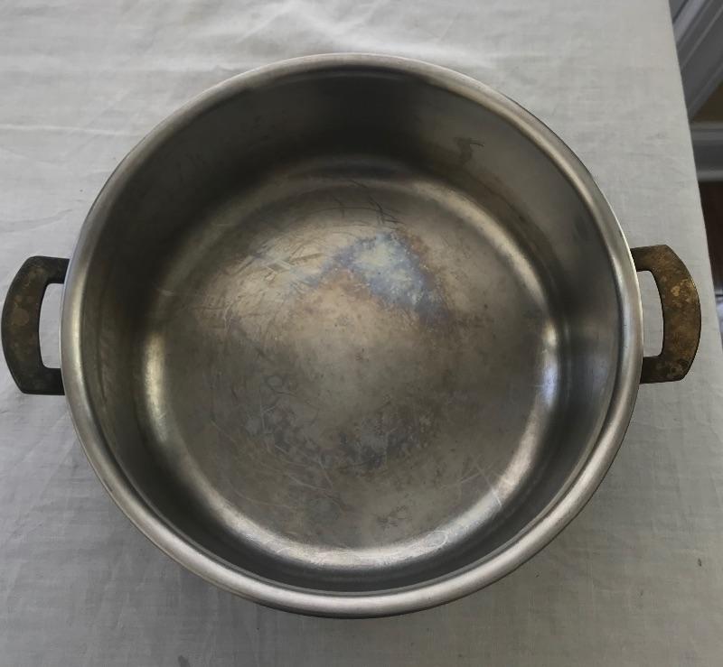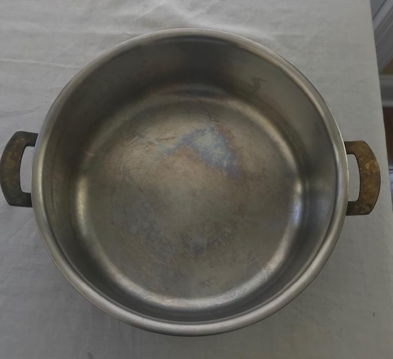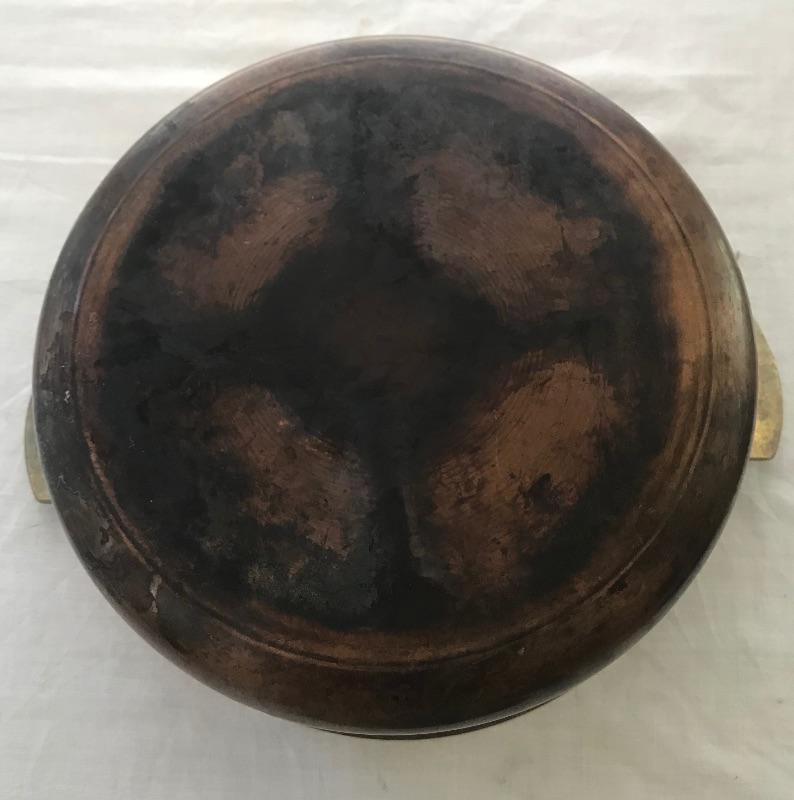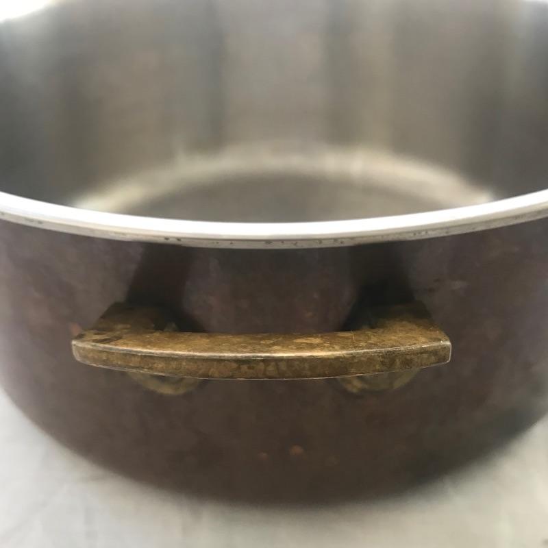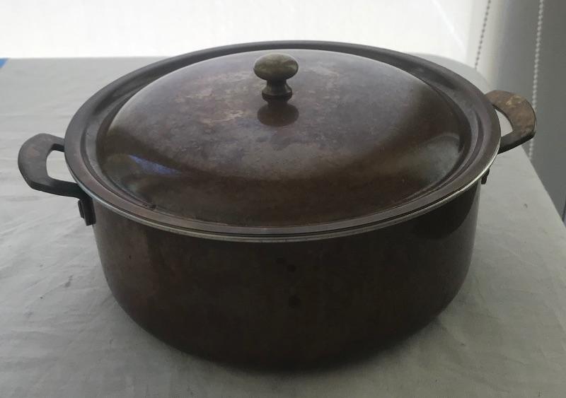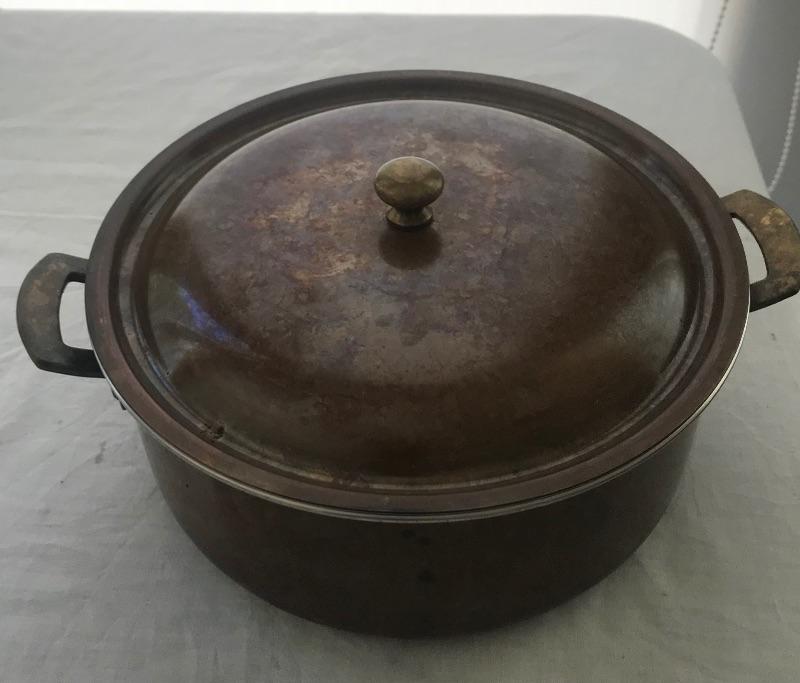Copper pot with lid and brass handles. Measures 9-1/2” in diameter and 4” deep.