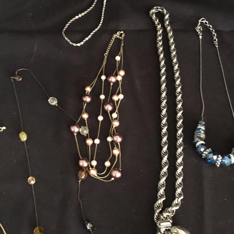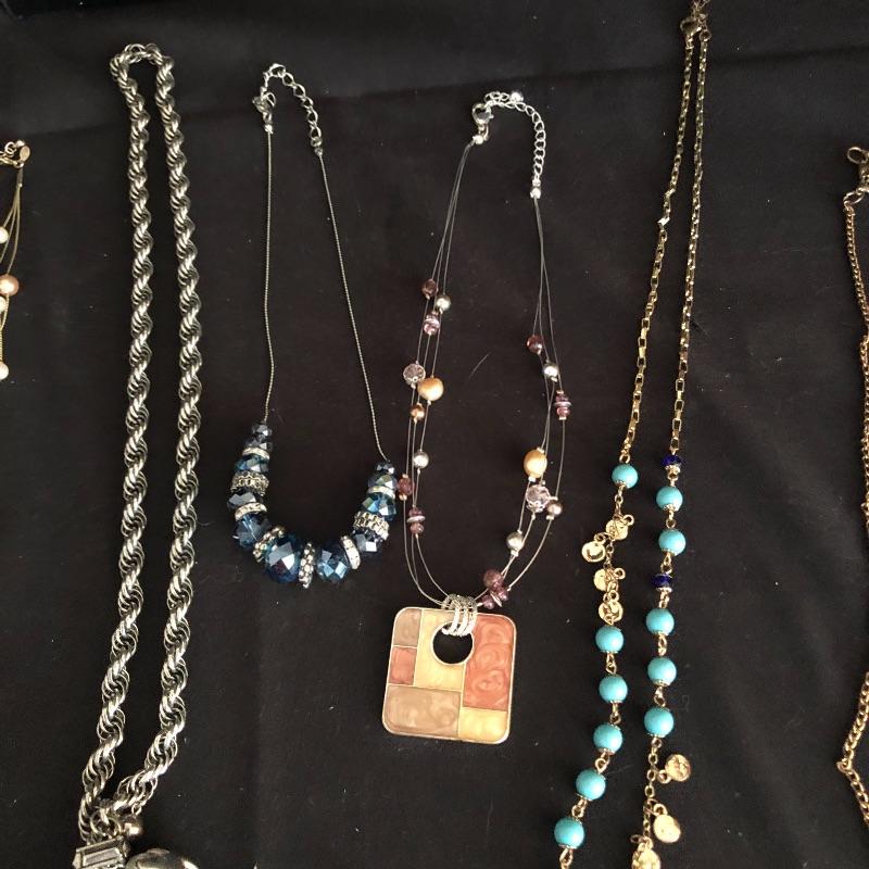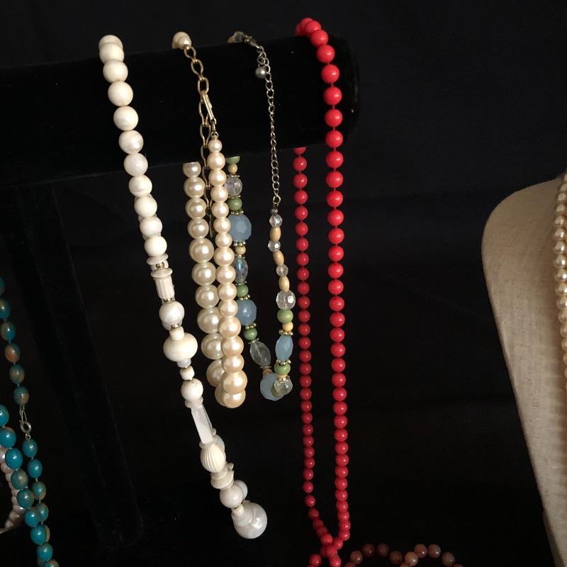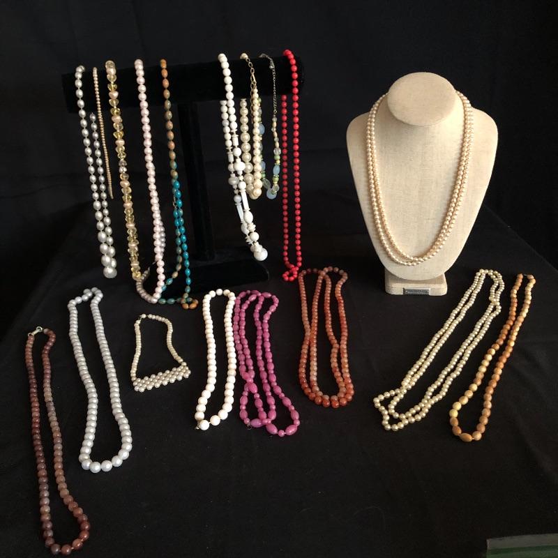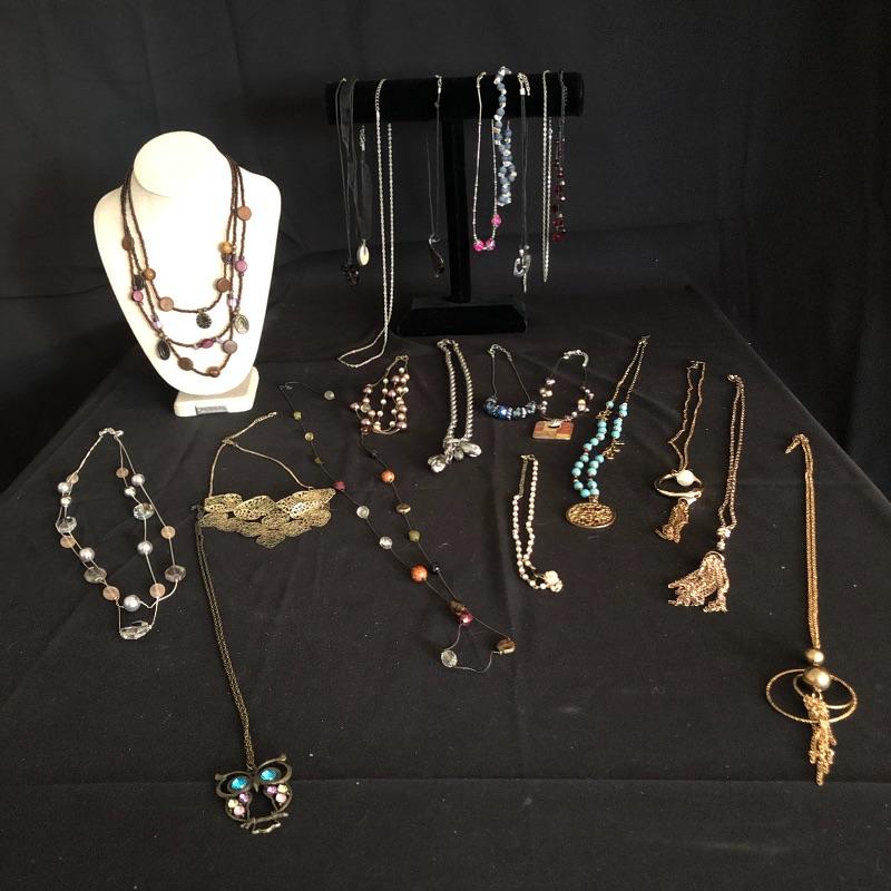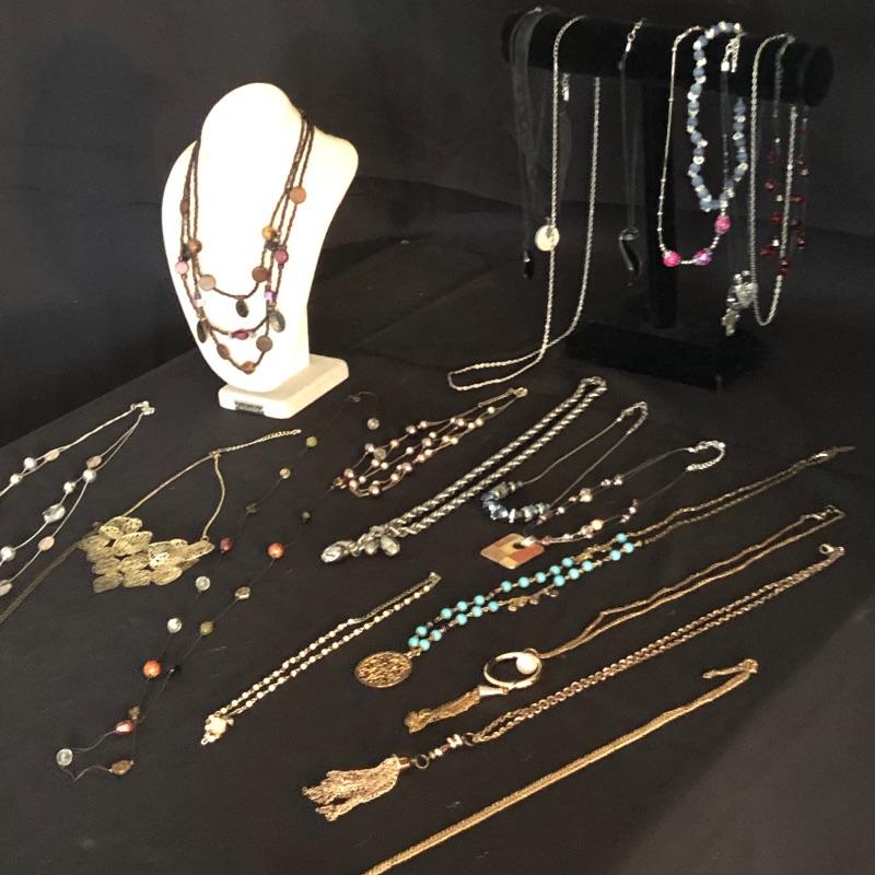 This is a huge lot of jewelry giving you plenty of options to wear. This lot contains eighteen costume jewelry necklaces, twenty three other necklaces, eighteen bracelets and two ankle bracelets. Necklaces vary in length. Shipping Available.