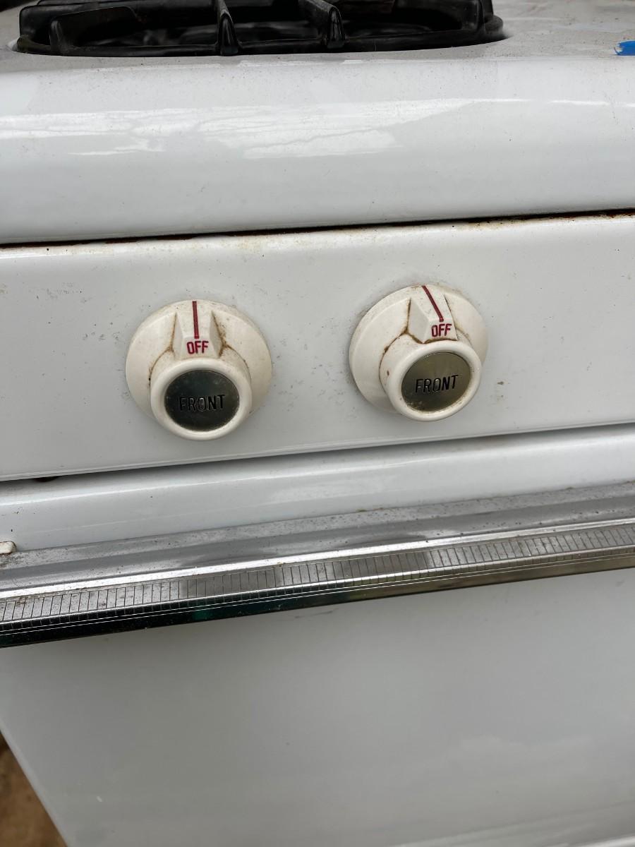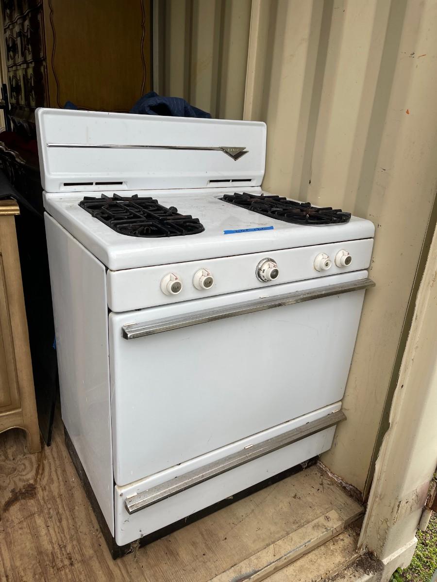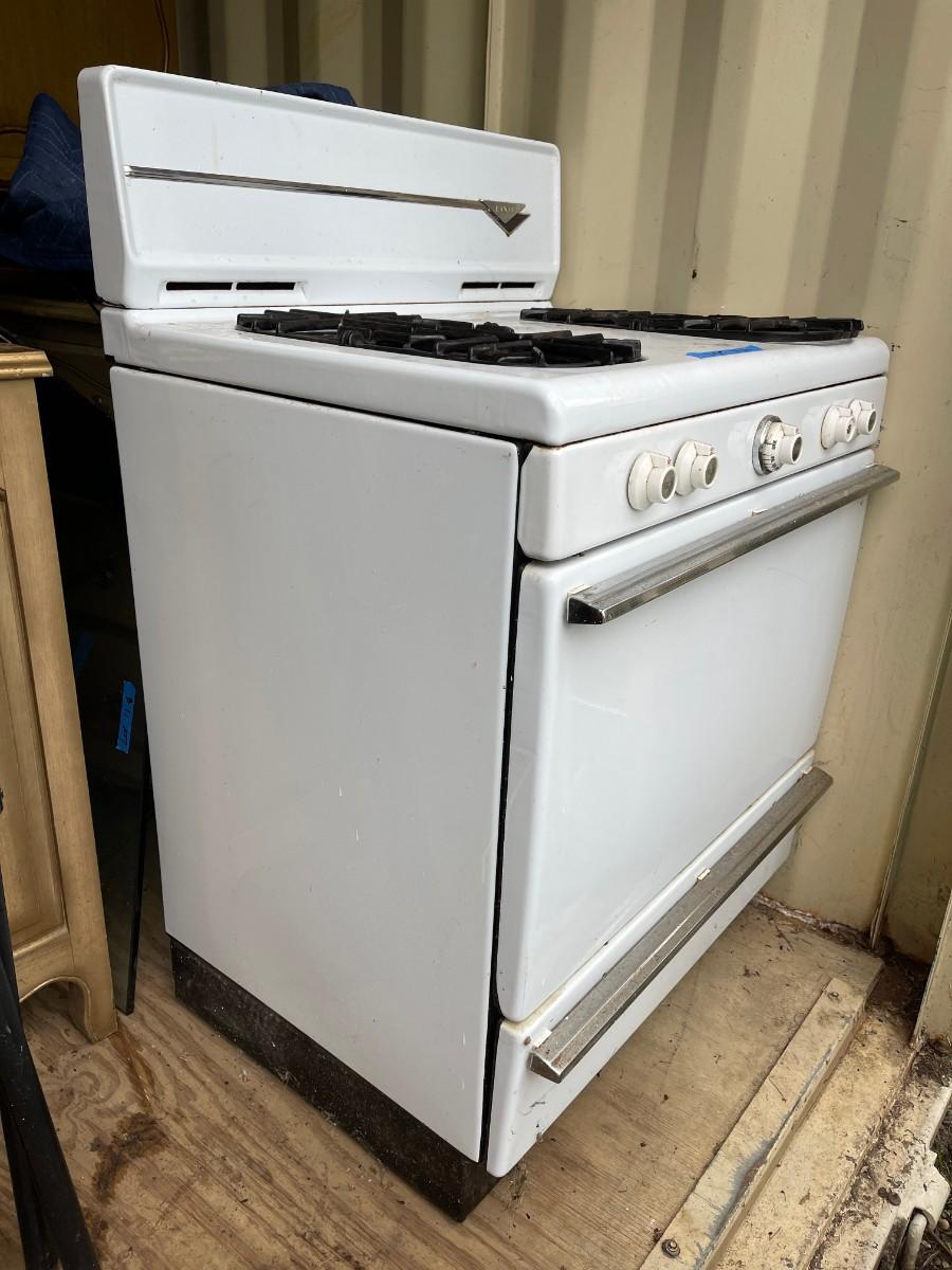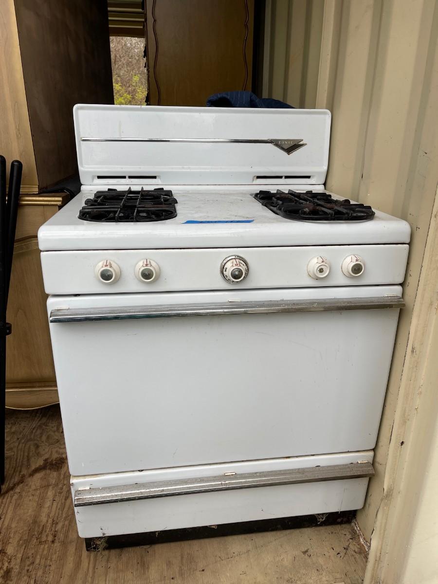 Sturdy vintage gas stove, by Dixie, in white enamel, NOT TESTED.
