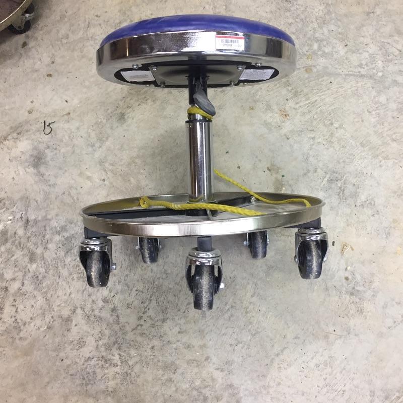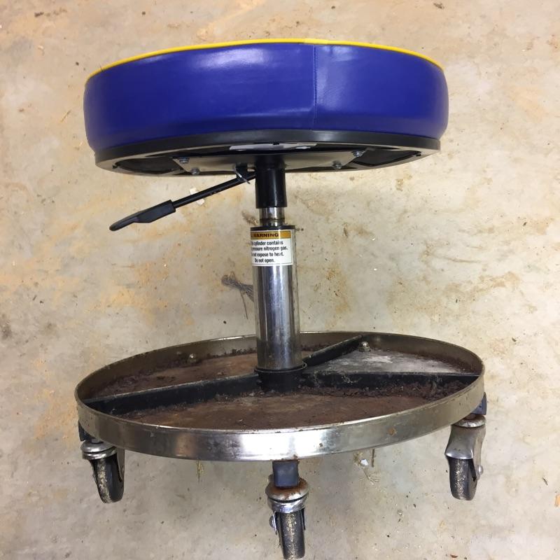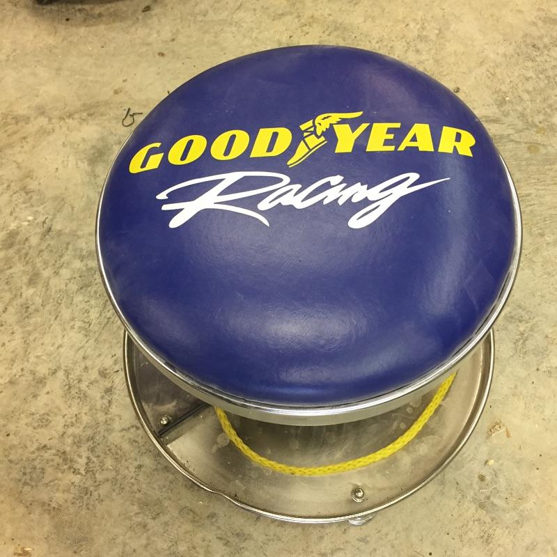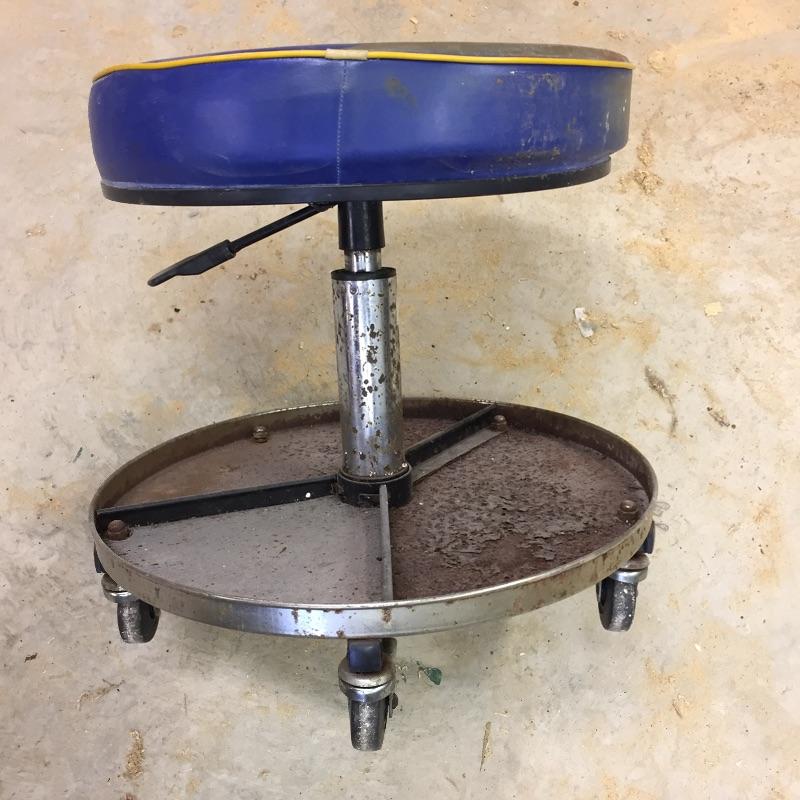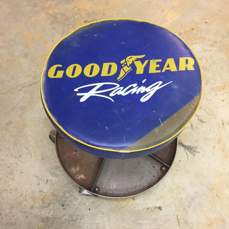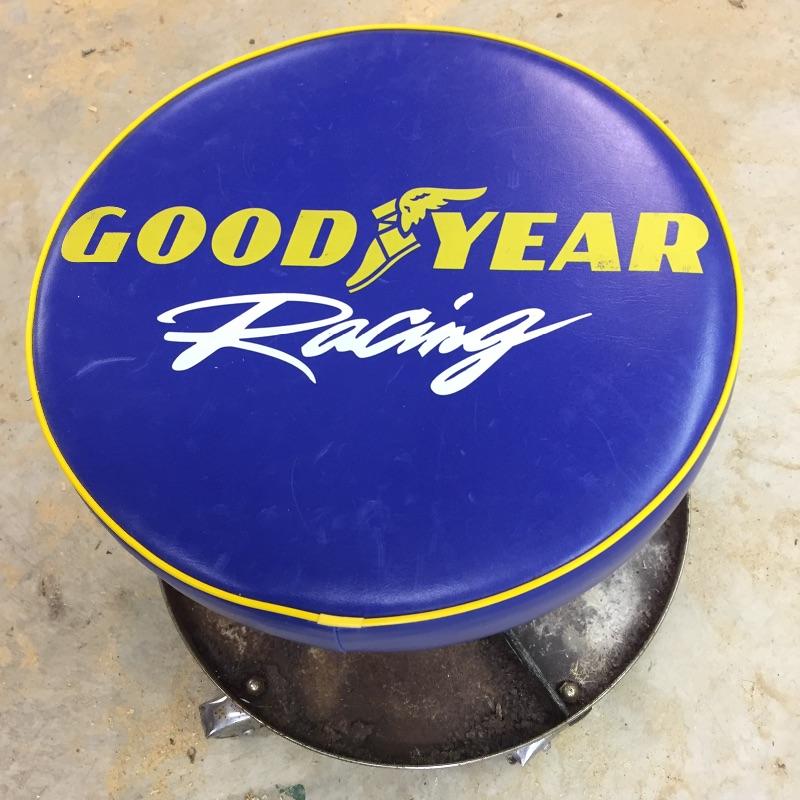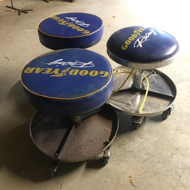 Trio of Goodyear rolling stools. Two have rust on bottoms - see pictures. Great for your shop or garage.
