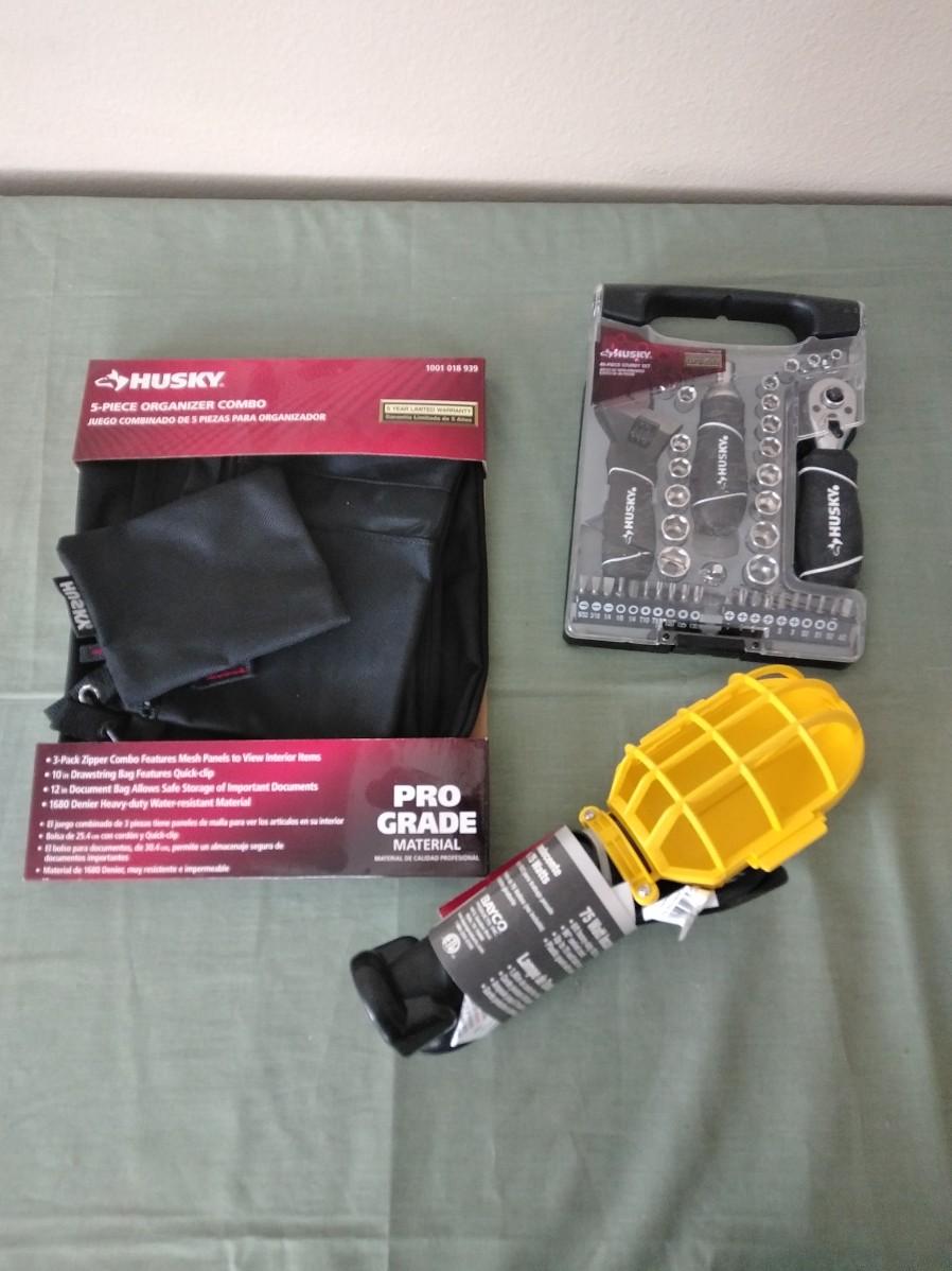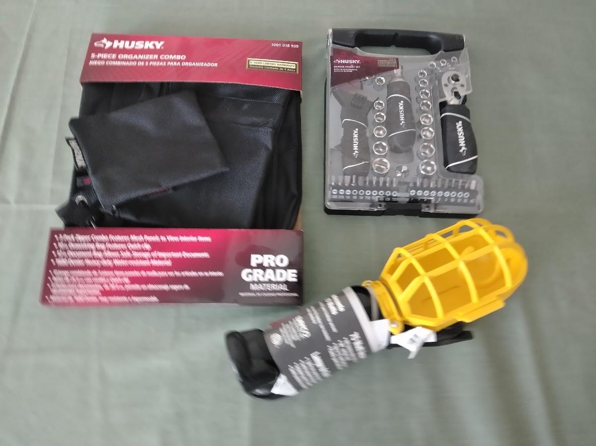 LOT 126 HUSKY POUCH BAGS, TOOL SET AND LIGHT