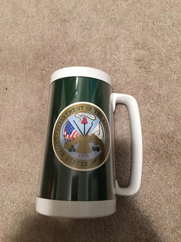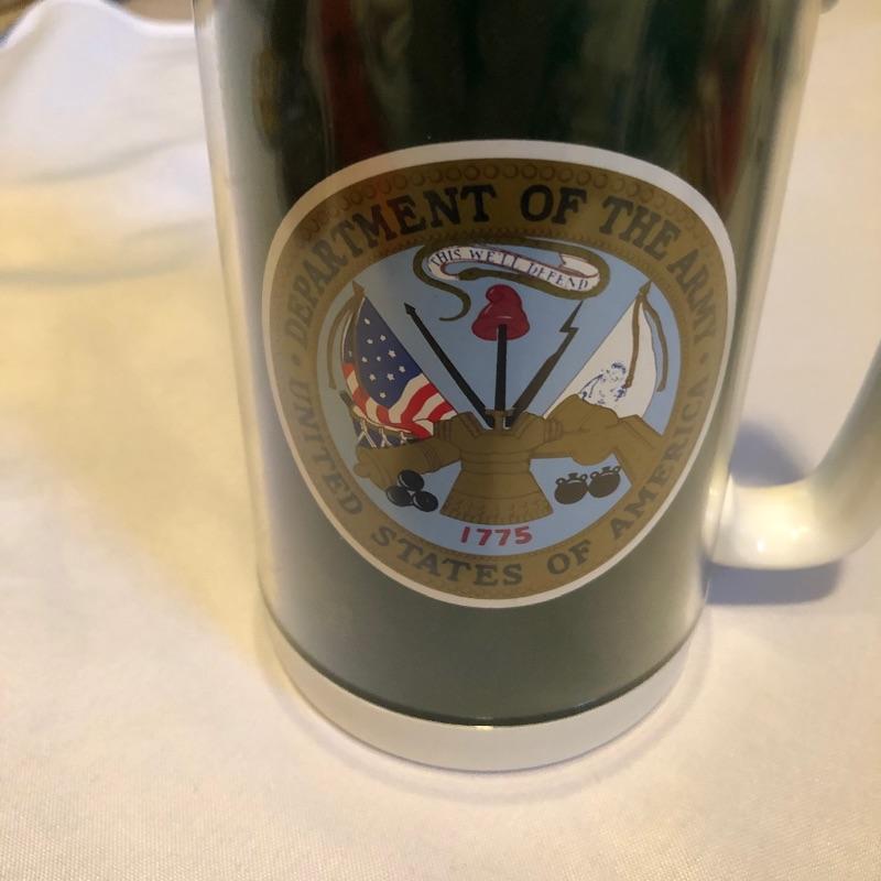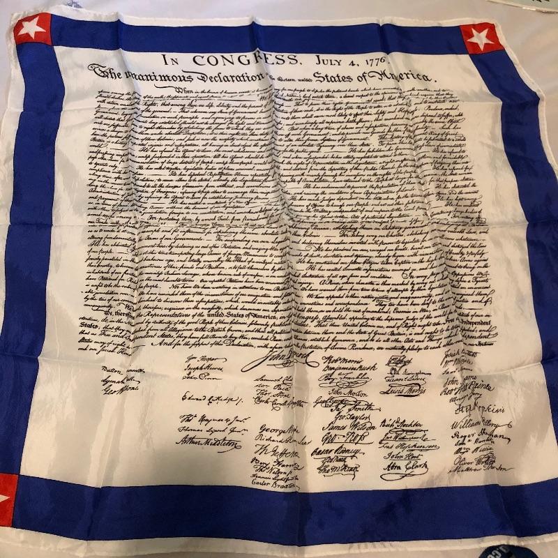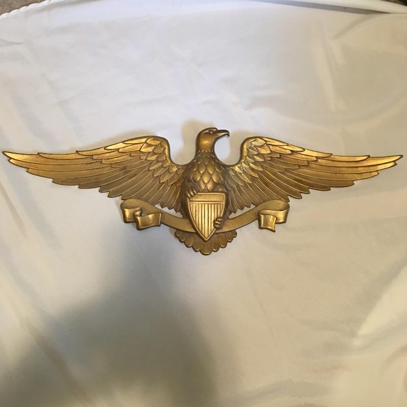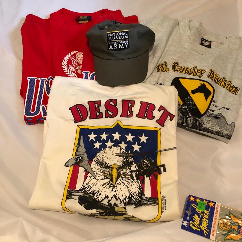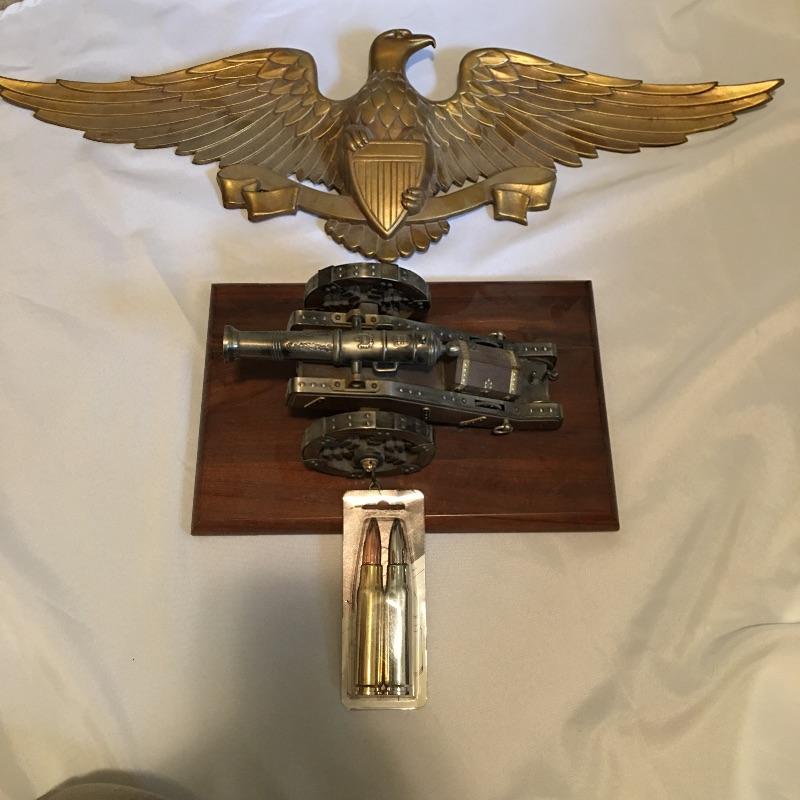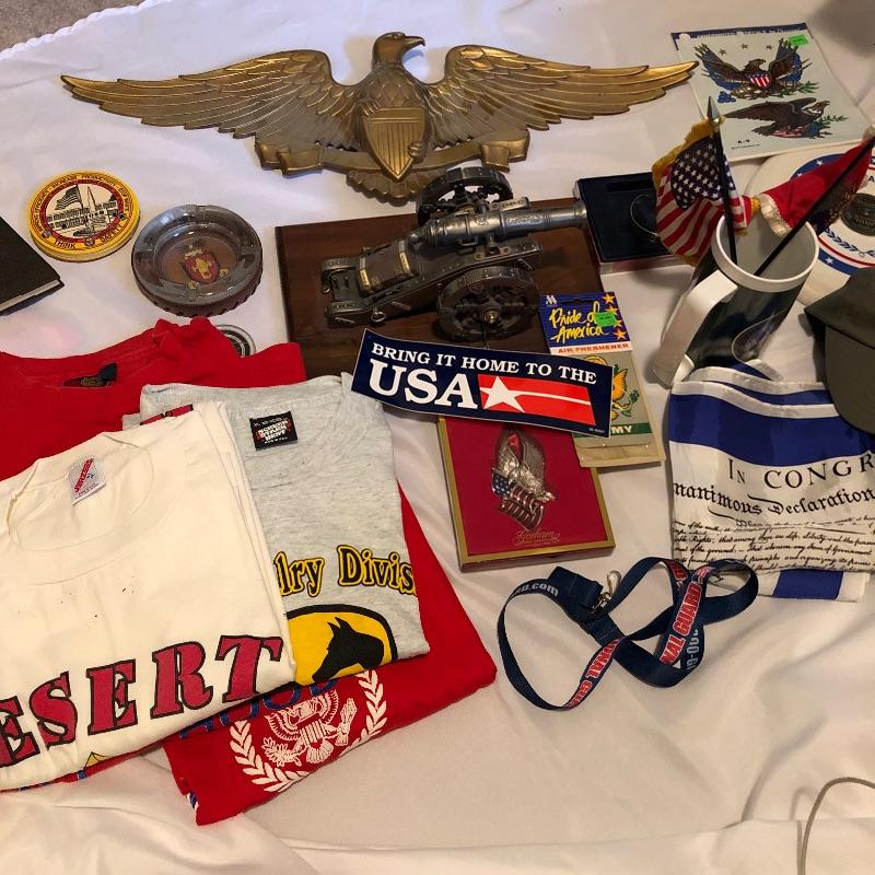 Great lot of military collectibles that includes a cool gold colored Eagle wall mount, an AM radio shaped like a cannon, military t-shirts X Large, baseball cap, a scarf with The Declaration of Independence and much more.