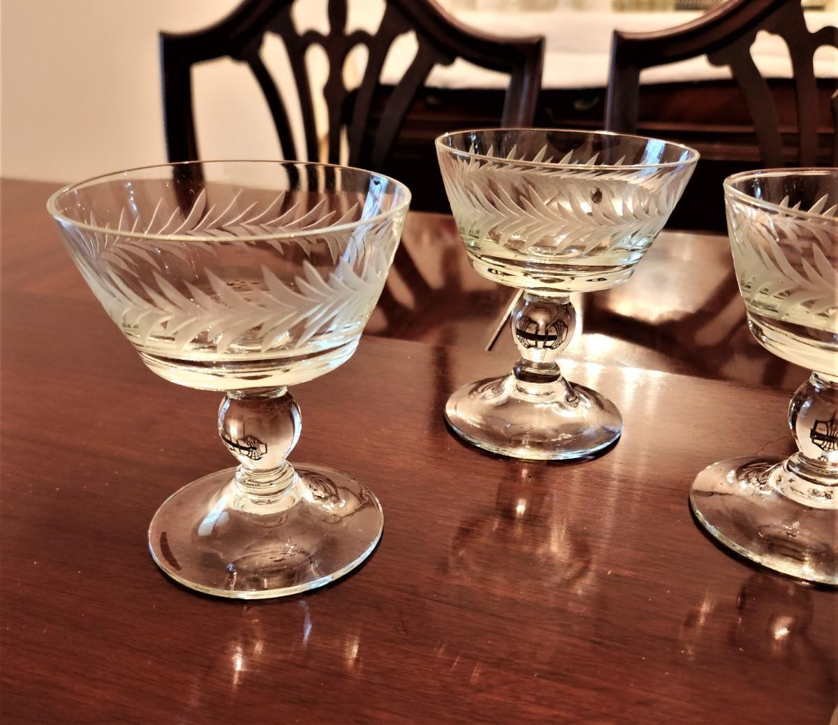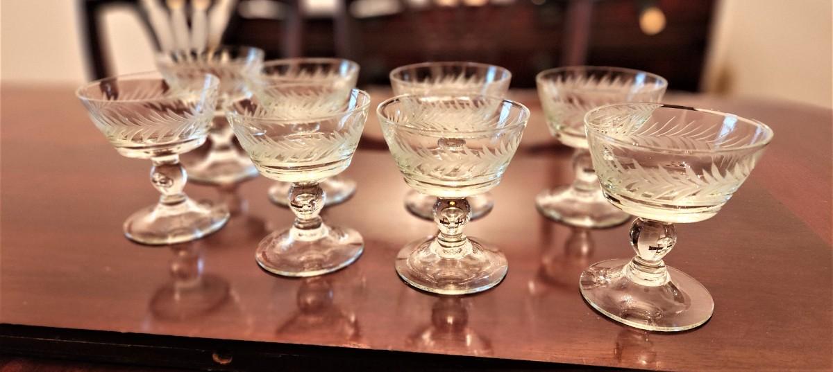 Set of 8 vintage acid-etched sherbet/dessert dishes. We have other pieces in this pattern later in the sale. These are in good condition and stand 4" tall.
