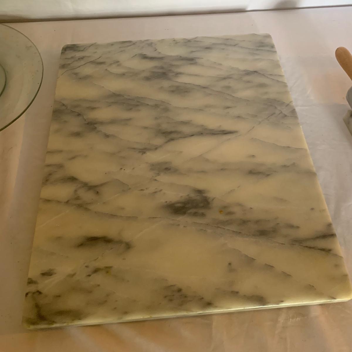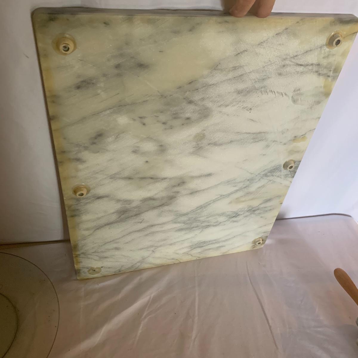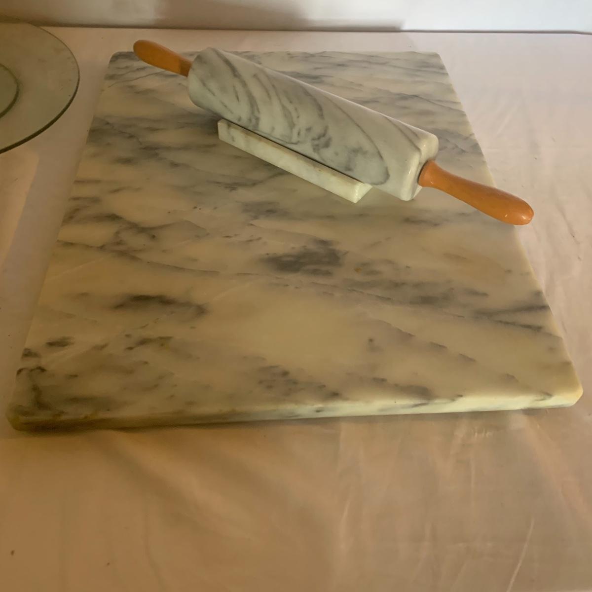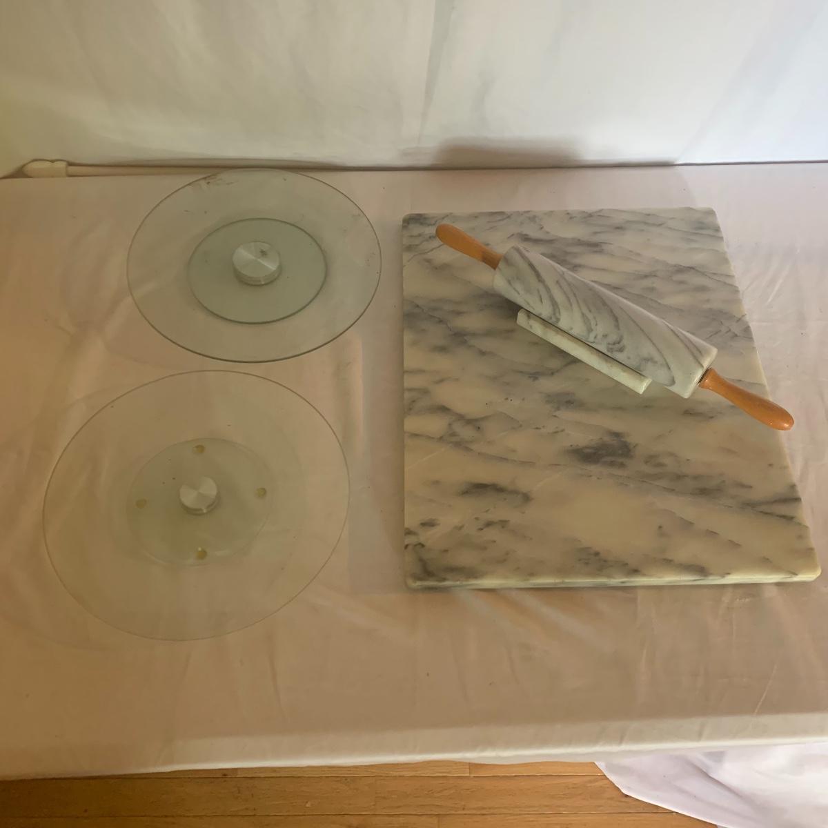 Lot contains one large marble slab measuring 16” x 20” with a matching rolling pin and stand for the pin. The two glass lazy Susan’s are a nice light touch to the lot with each one measuring 12” diameter. There is a bit of grease on the bottom of the marble slab that will clean up easily. Local pick up only.