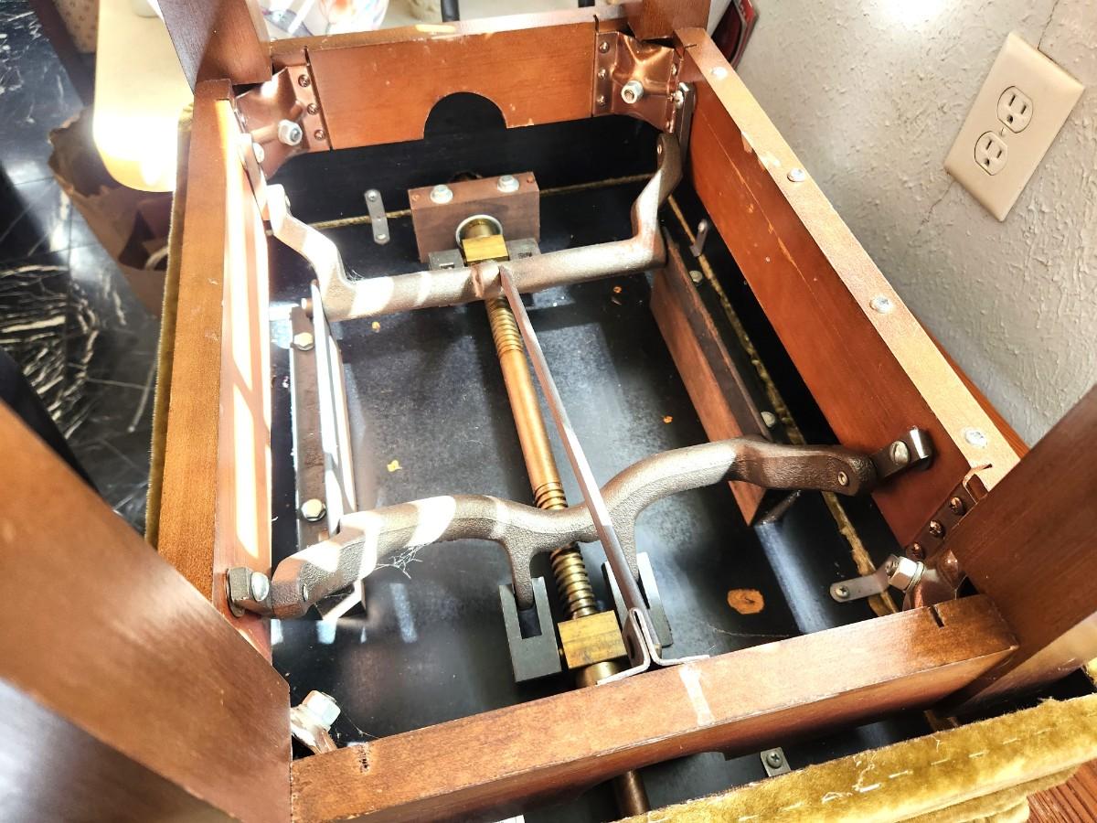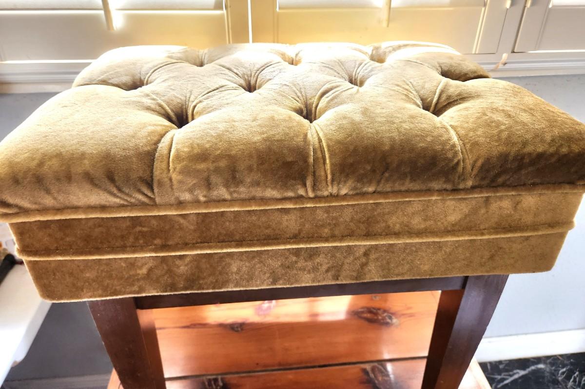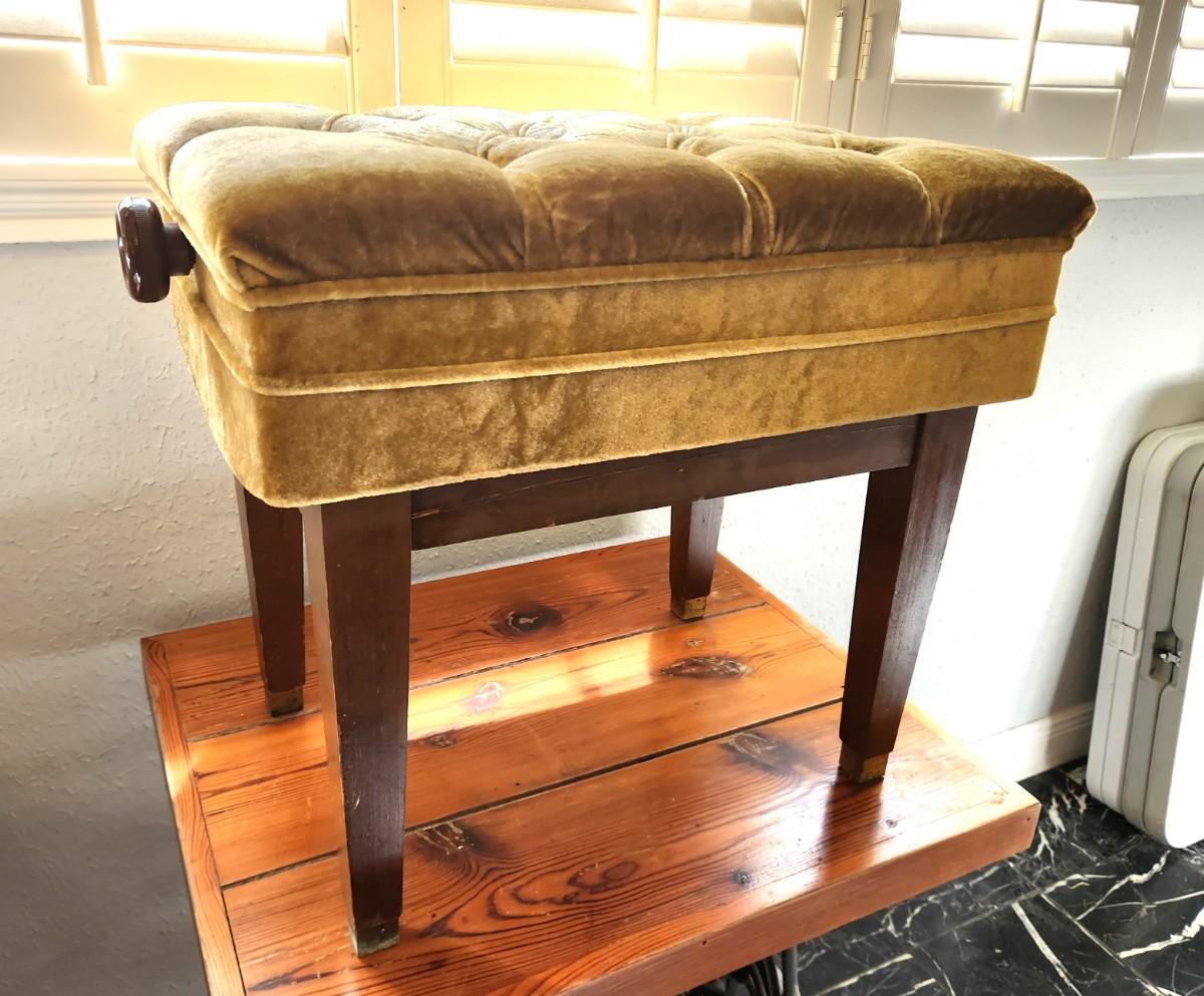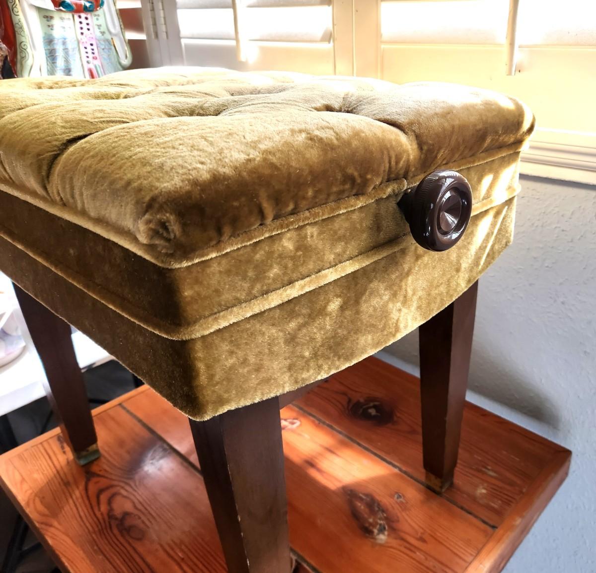 From the Manual Arts Co. (marked) Mid Century Modern Piano Bench - note: 1 side has had a professional repair. Probably reupholstered. Can be adjusted from 19" to 21" tall, 23" long, 16" deep. Interesting mechanical works inside. We've never seen one like it.