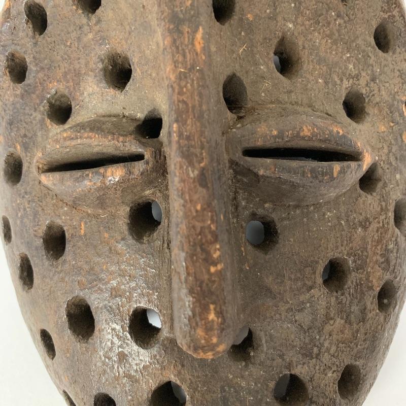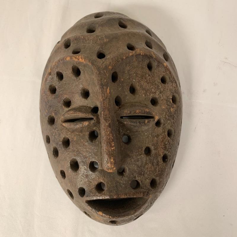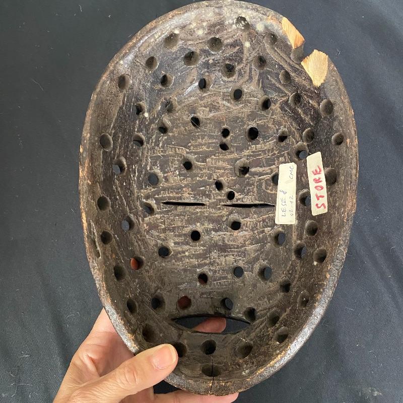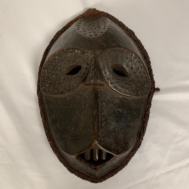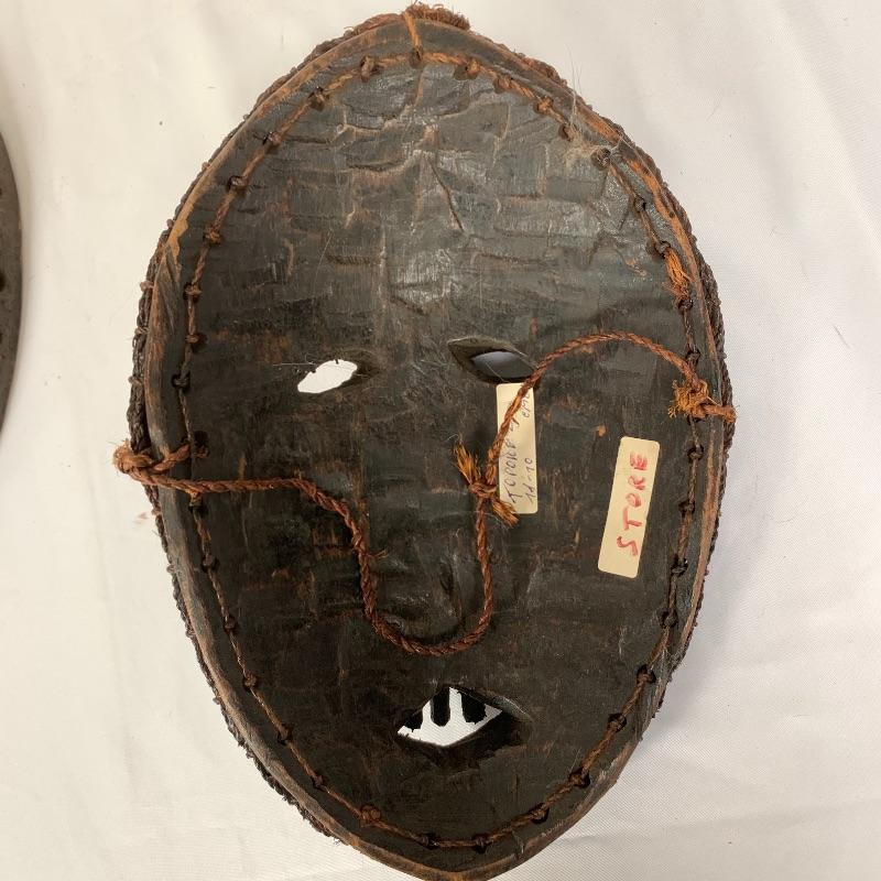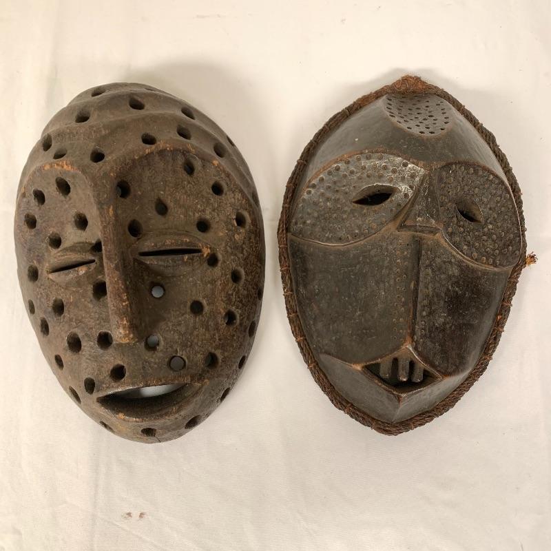 This lot includes two wooden African masks. The mask with little holes in it has a chip on the back side (see picture). It is barely noticeable when looking at it from side or front. The other mask has a rope woven around the rim. They both have stickers on the inside from purchase that can be removed. (see picture). They both measure about 11in x 8in.