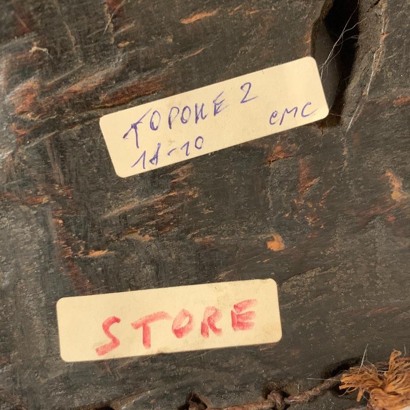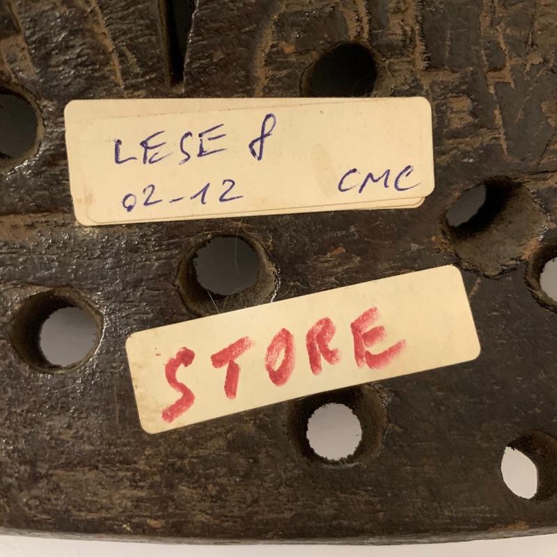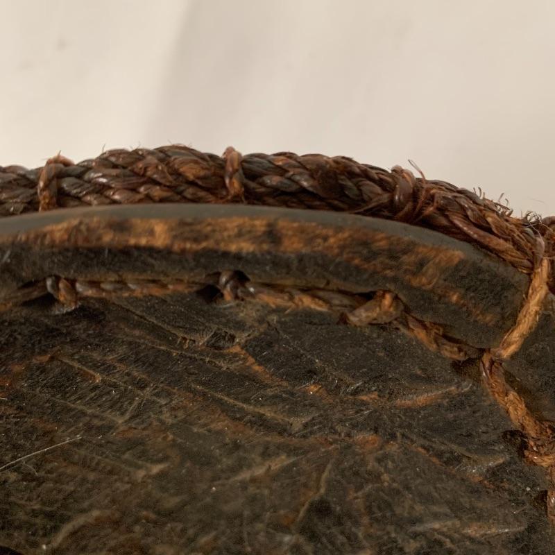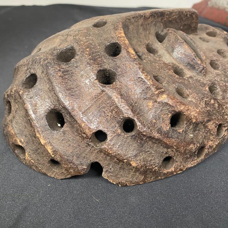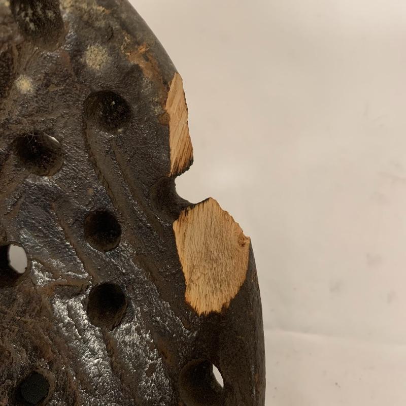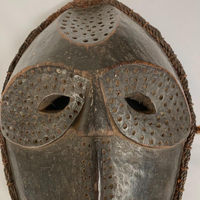 This lot includes two wooden African masks. The mask with little holes in it has a chip on the back side (see picture). It is barely noticeable when looking at it from side or front. The other mask has a rope woven around the rim. They both have stickers on the inside from purchase that can be removed. (see picture). They both measure about 11in x 8in.