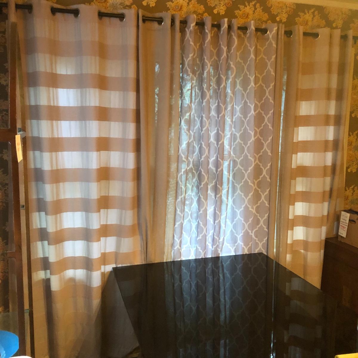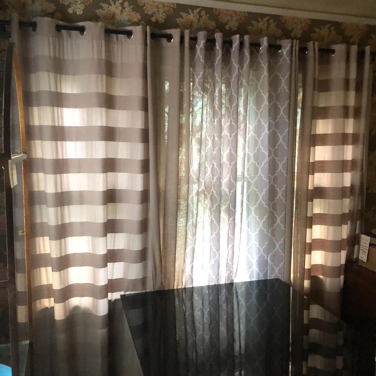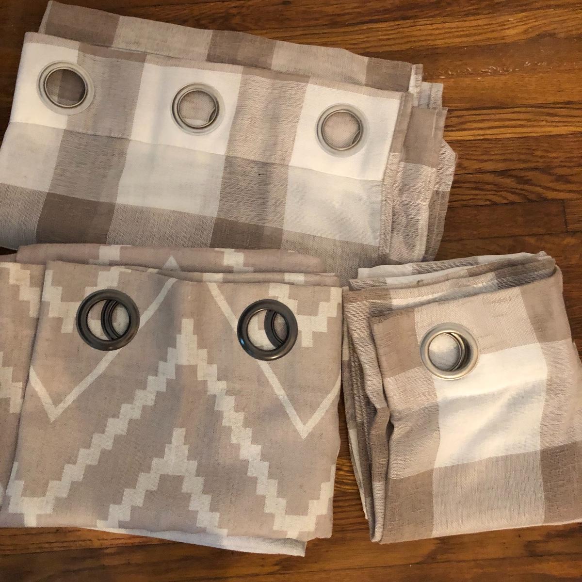 Plenty of window grommet panels in this lot with 10 plus of them and 3 dark brown colored metal curtain rods. A couple of them haven’t been used and are still in their packaging. The panels with metal grommets are in a variety of muted shades of cream, tan and brown that mix and match one another nicely. Curtains measure 54” wide x 84” long with a few that are not as wide at 38” and yet more (main image) that includes two 48” x 96”, two 36” x 108”, one 48” x 84”