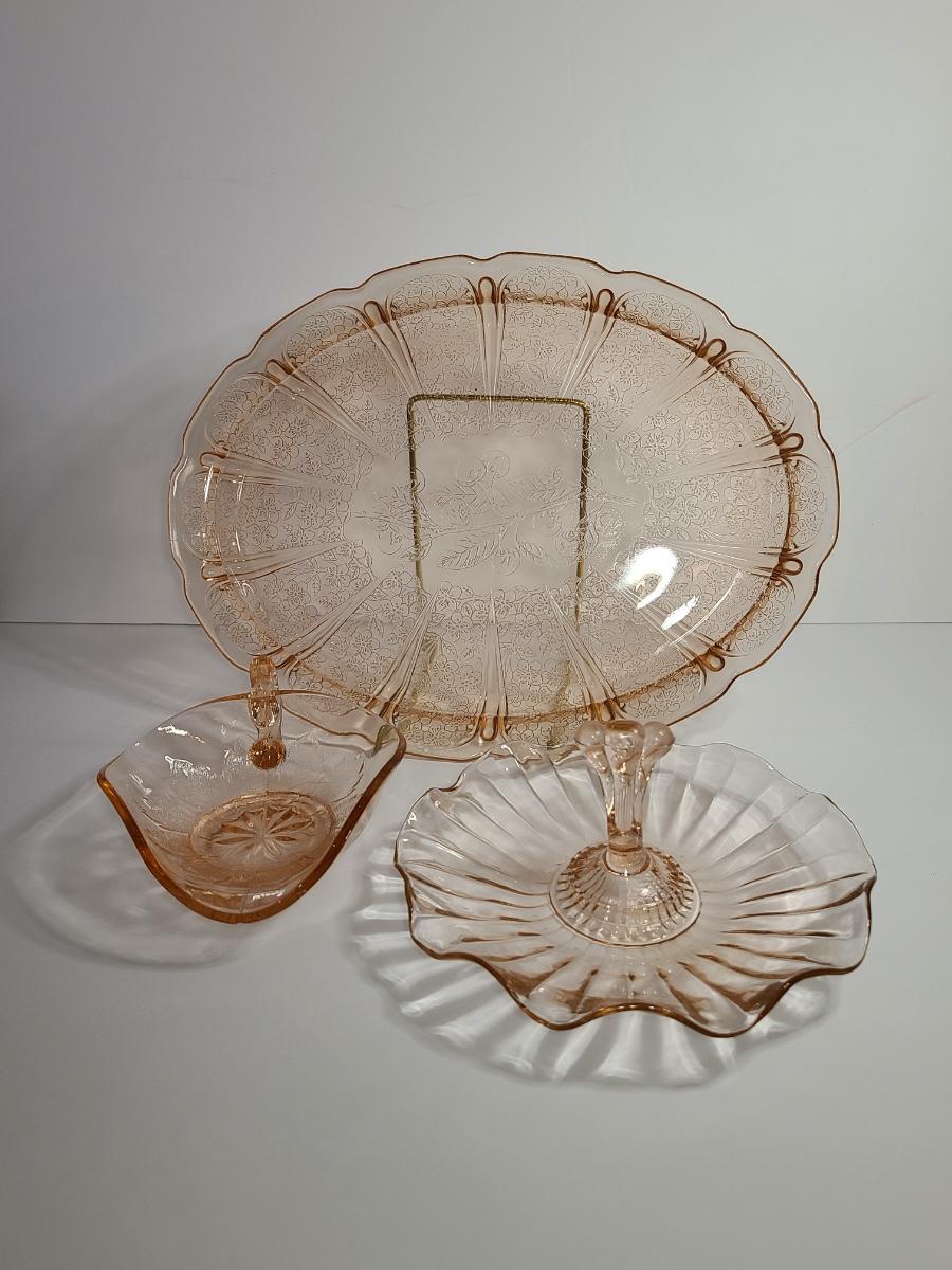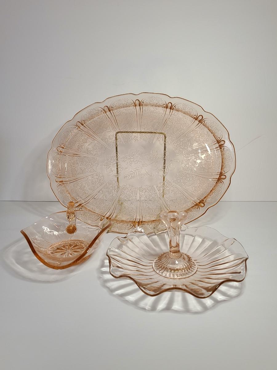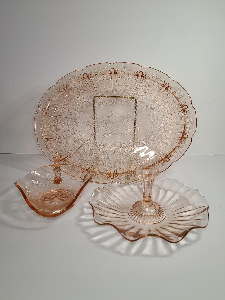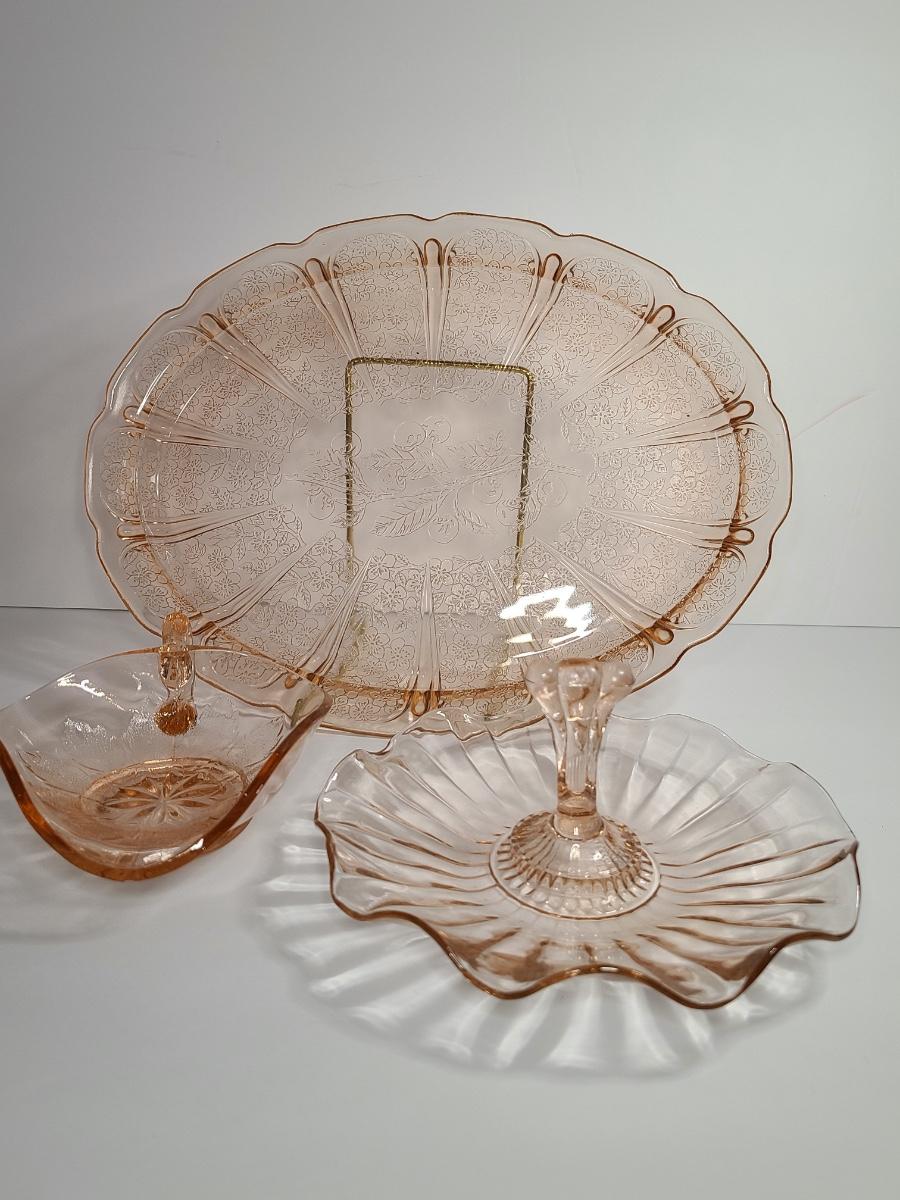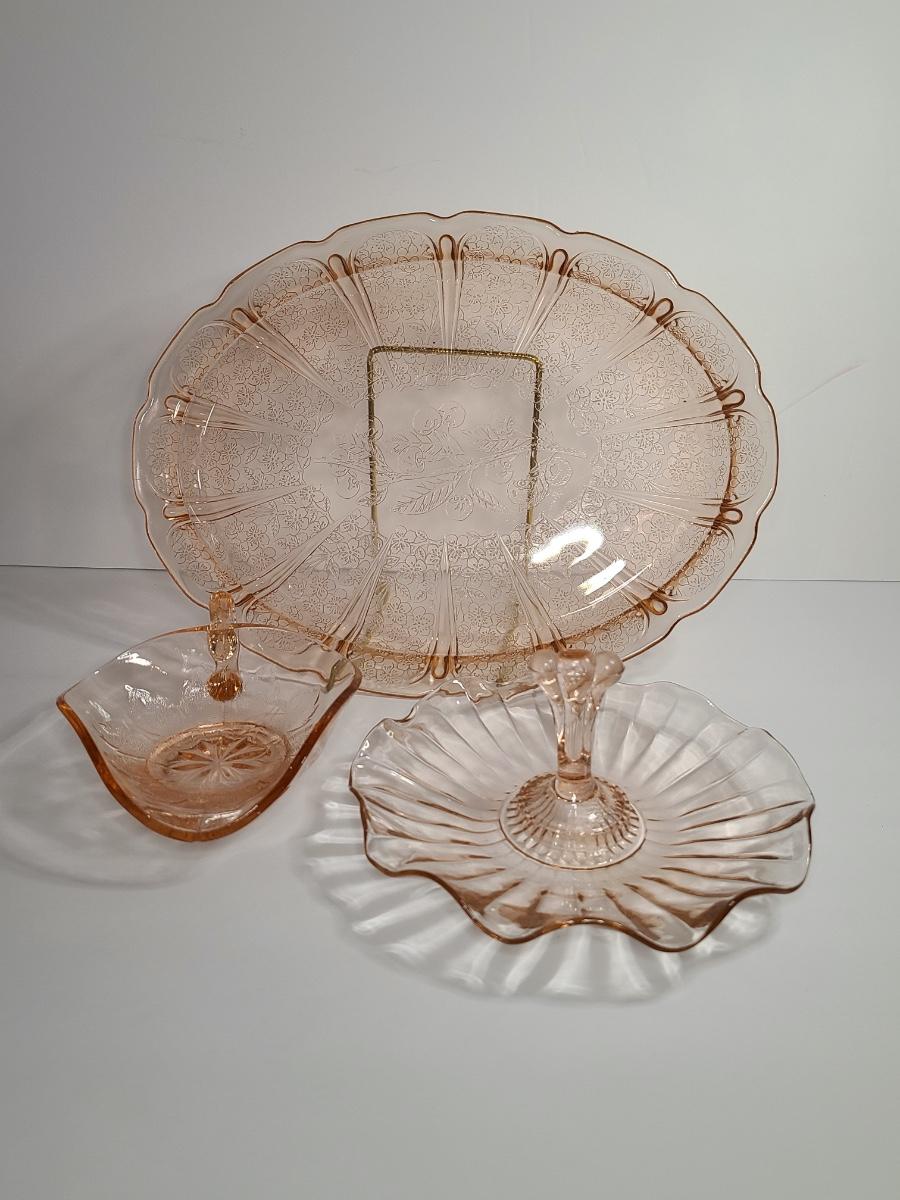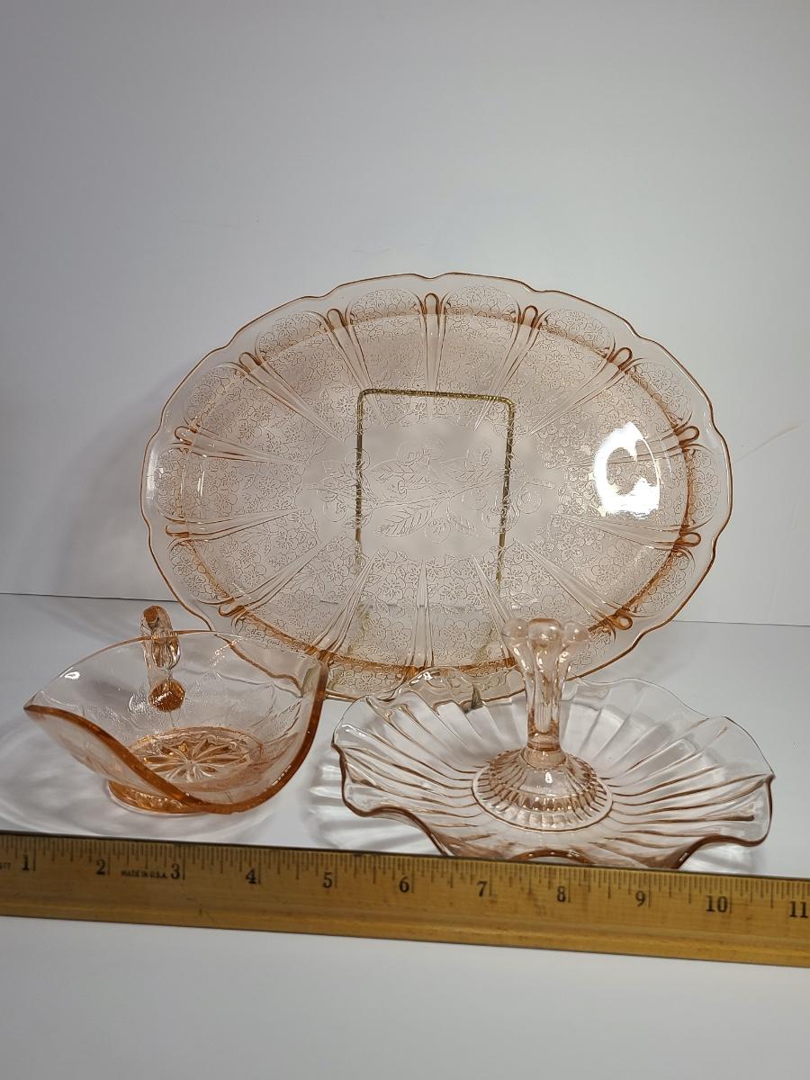 Lot 126: Pink Depression Glass Platter & Candy Dishes