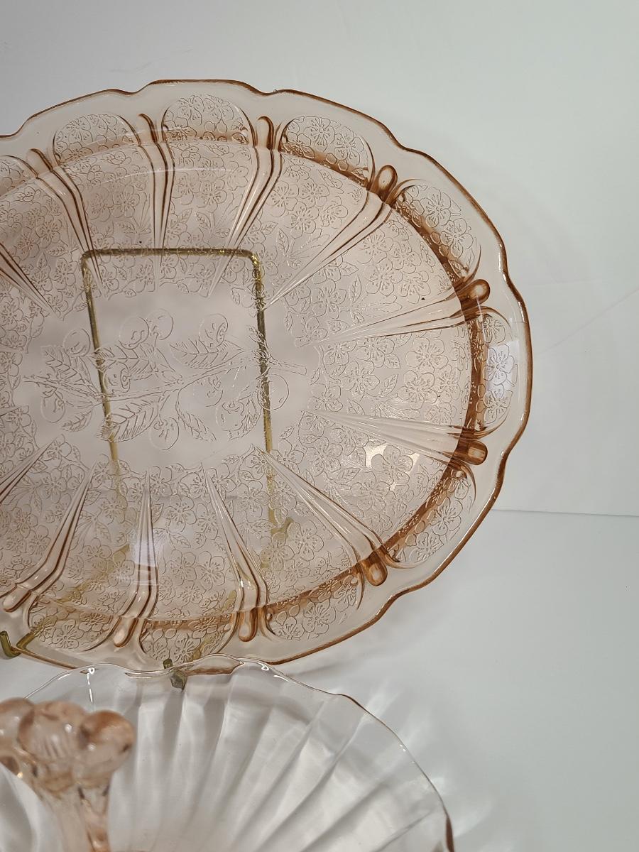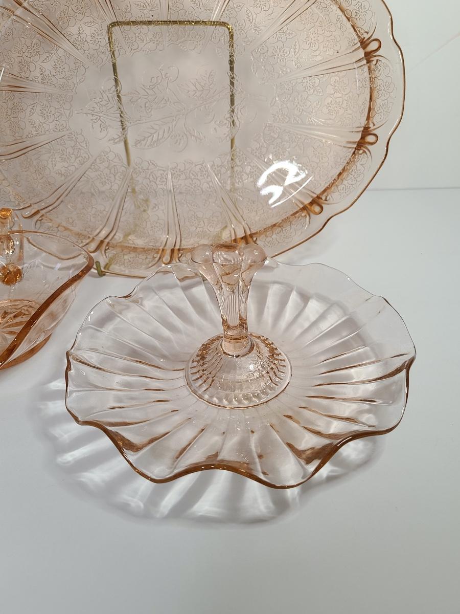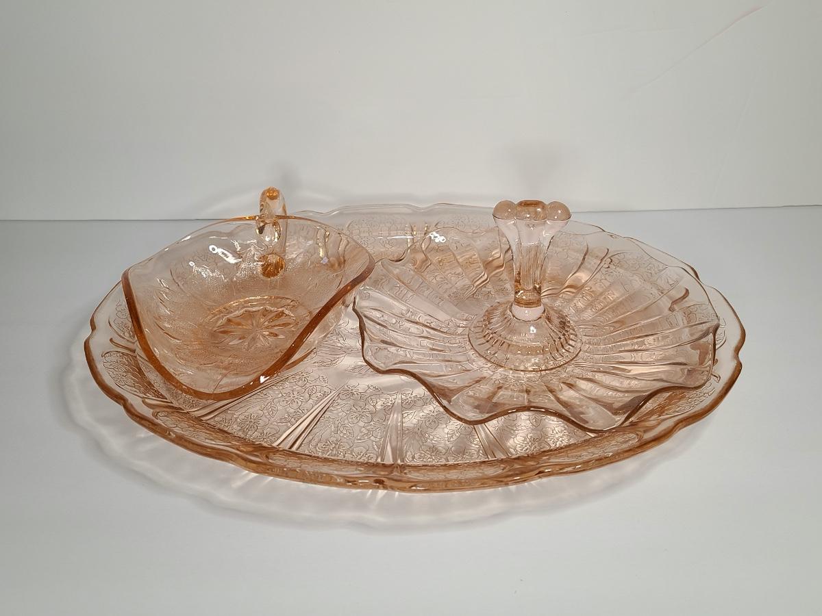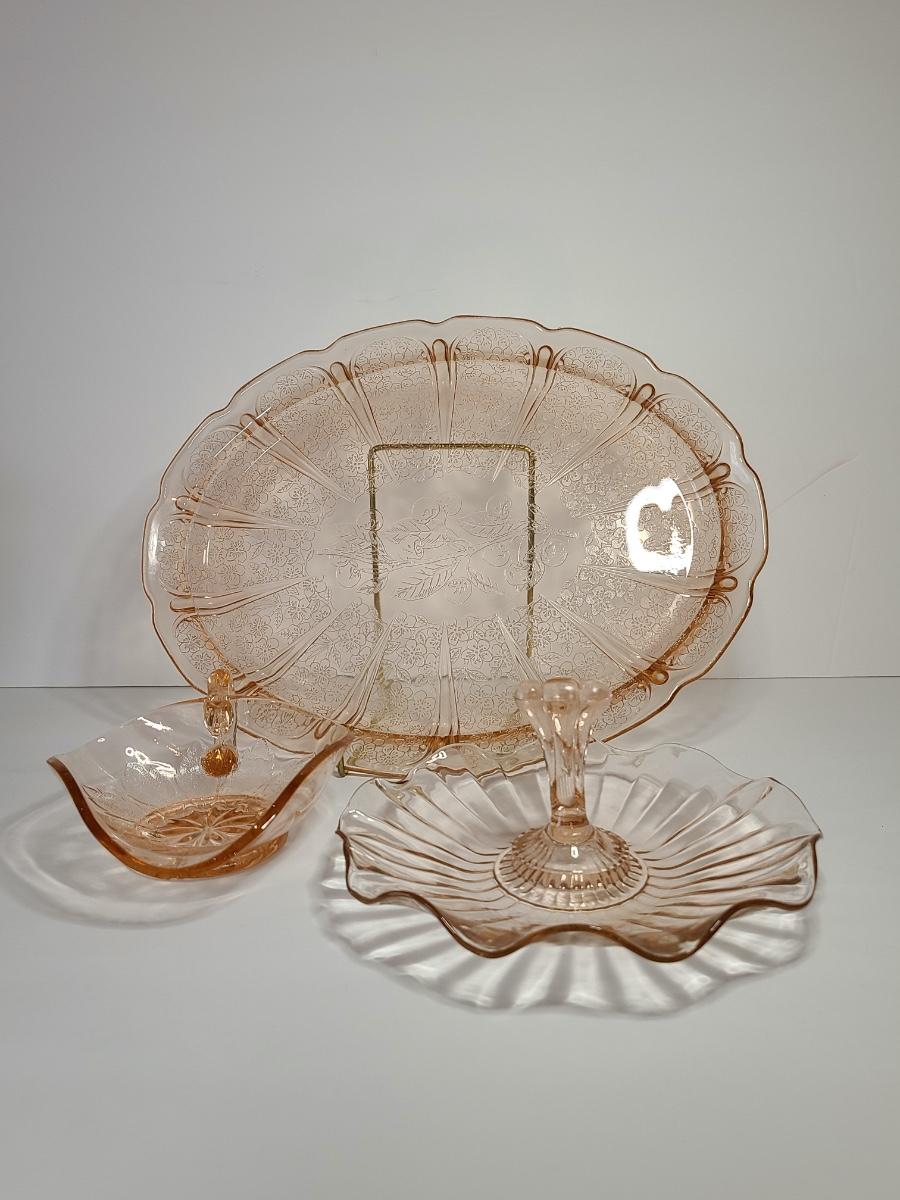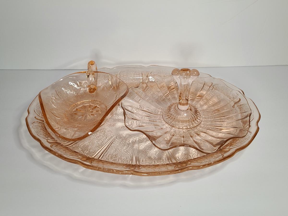 Lot 126: Pink Depression Glass Platter & Candy Dishes