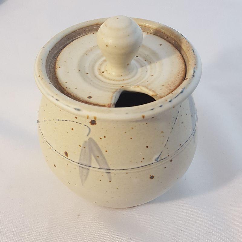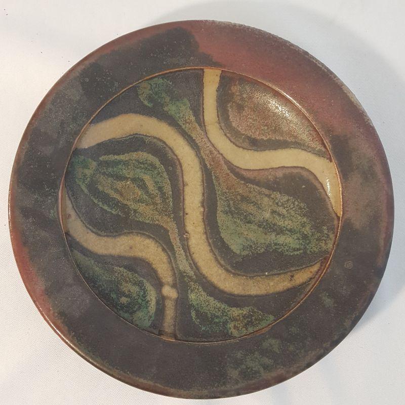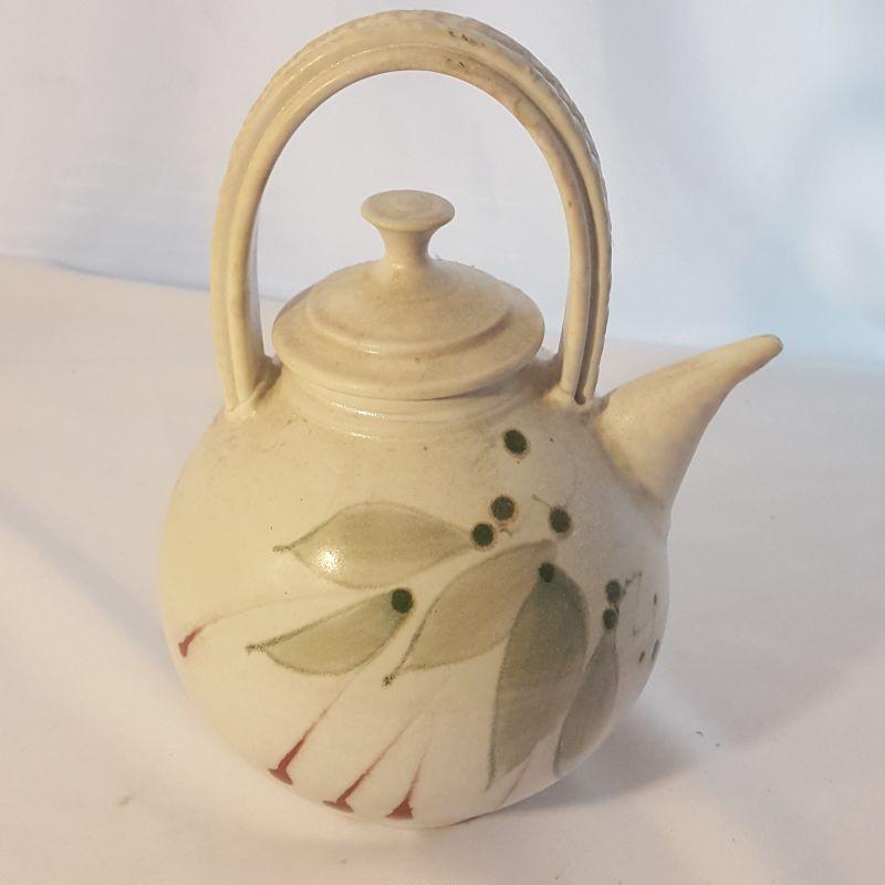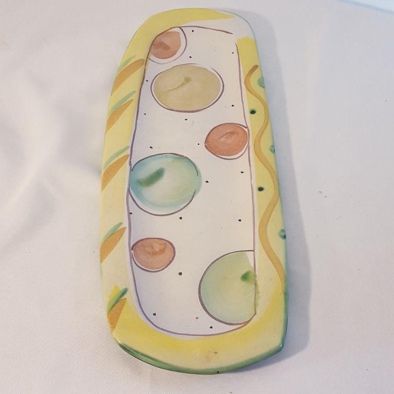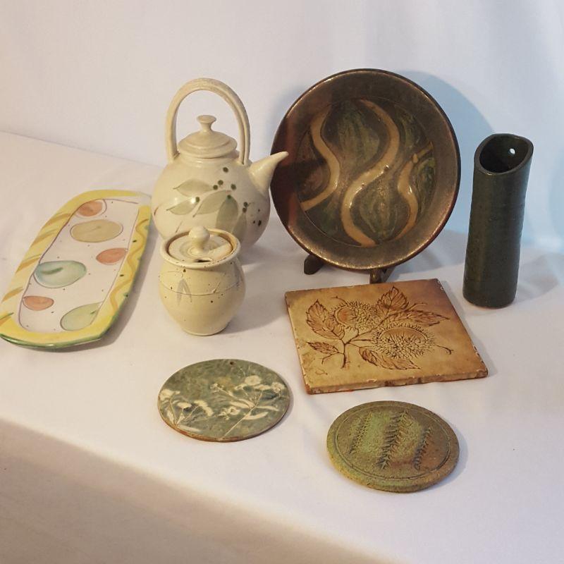 9 pieces to this handmade pottery collection. All the pieces have the artist's signature, except for the square trivet and the plate. The long yellow and circle dish measures 6x16 inches. The teapot measures 7x10 inches. All pieces appear to be in great condition.