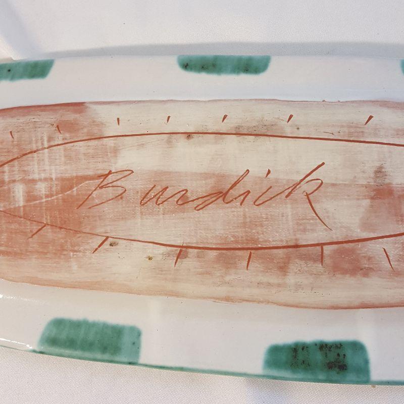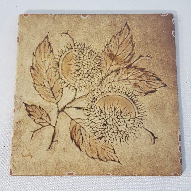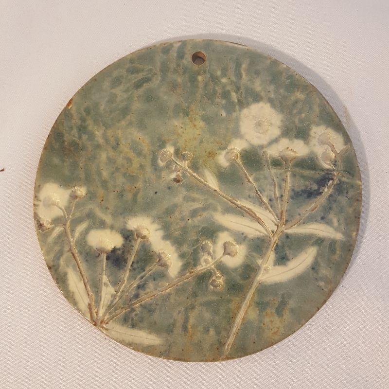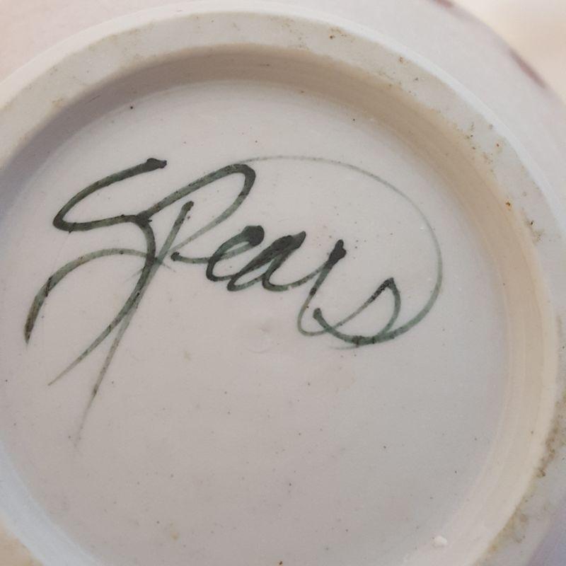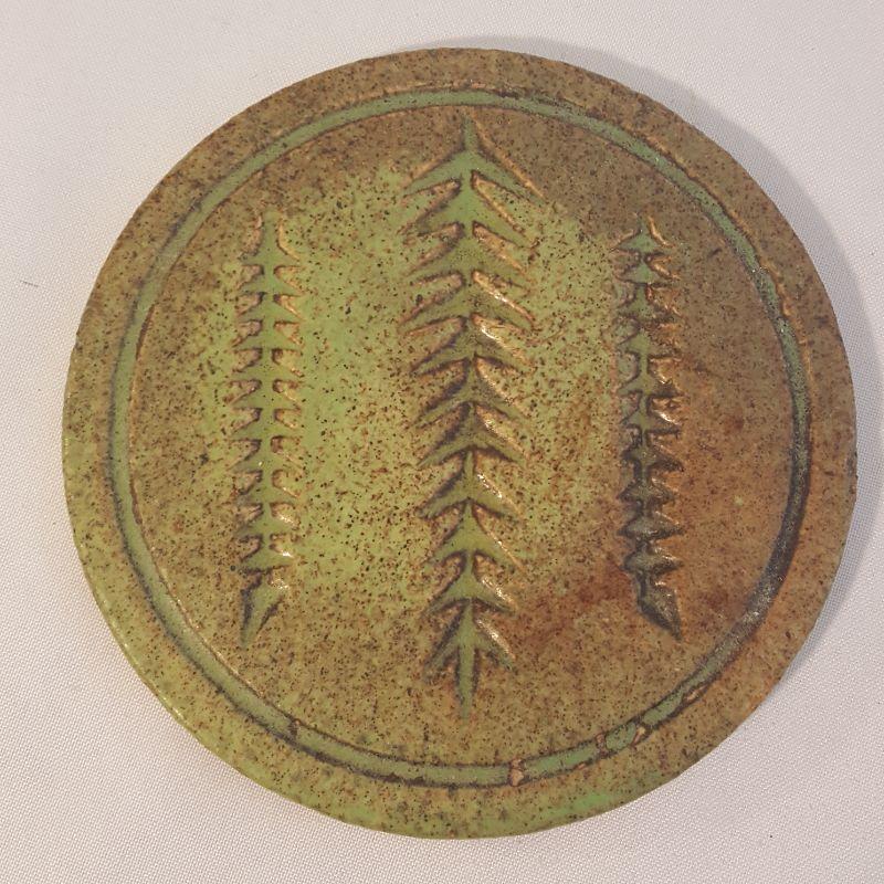 9 pieces to this handmade pottery collection. All the pieces have the artist's signature, except for the square trivet and the plate. The long yellow and circle dish measures 6x16 inches. The teapot measures 7x10 inches. All pieces appear to be in great condition.