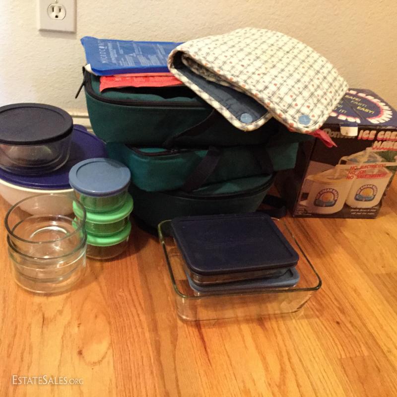 Miscellaneous lot of multiple many Pyrex Storage pieces and Pyrex Portable along with many Storage Plus pieces. Also a Mircocore Ice Cream Maker. Items available for pick up only in Columbus, NC