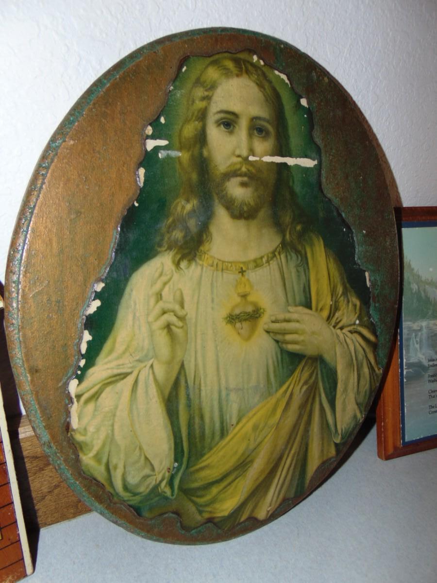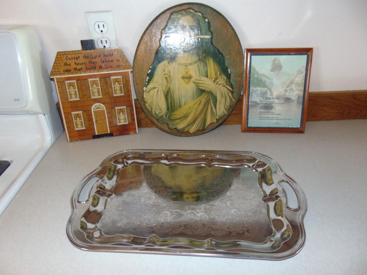 RELIGIOUS PICTURES, AND A SILVER COLORED PLATTER