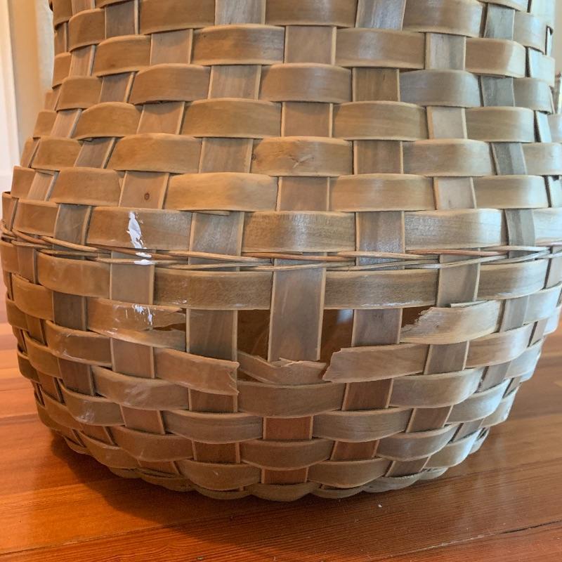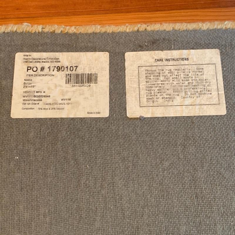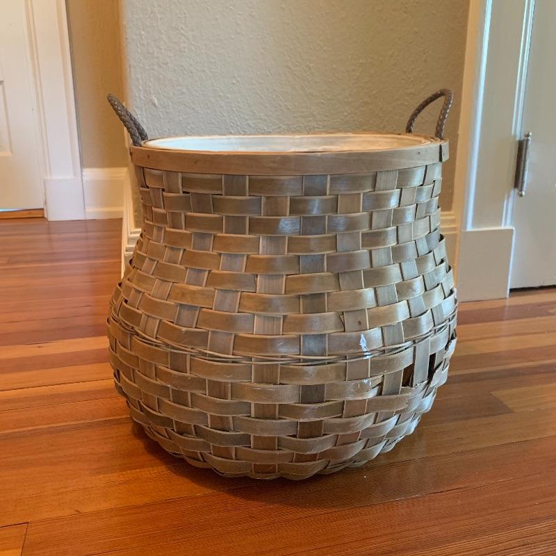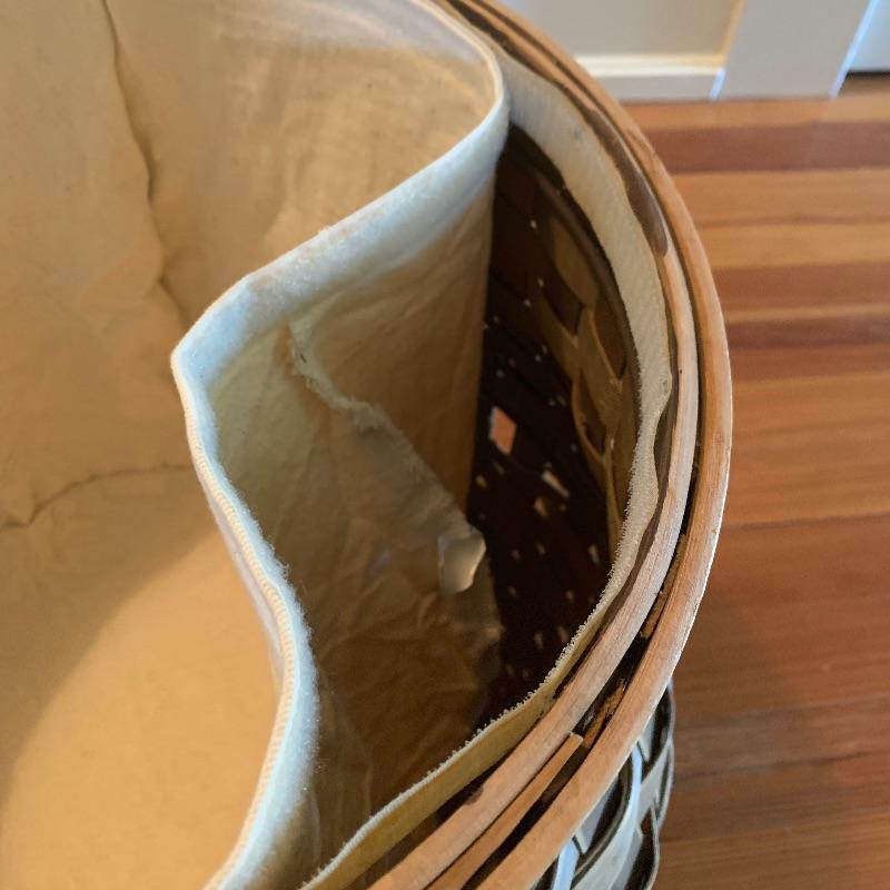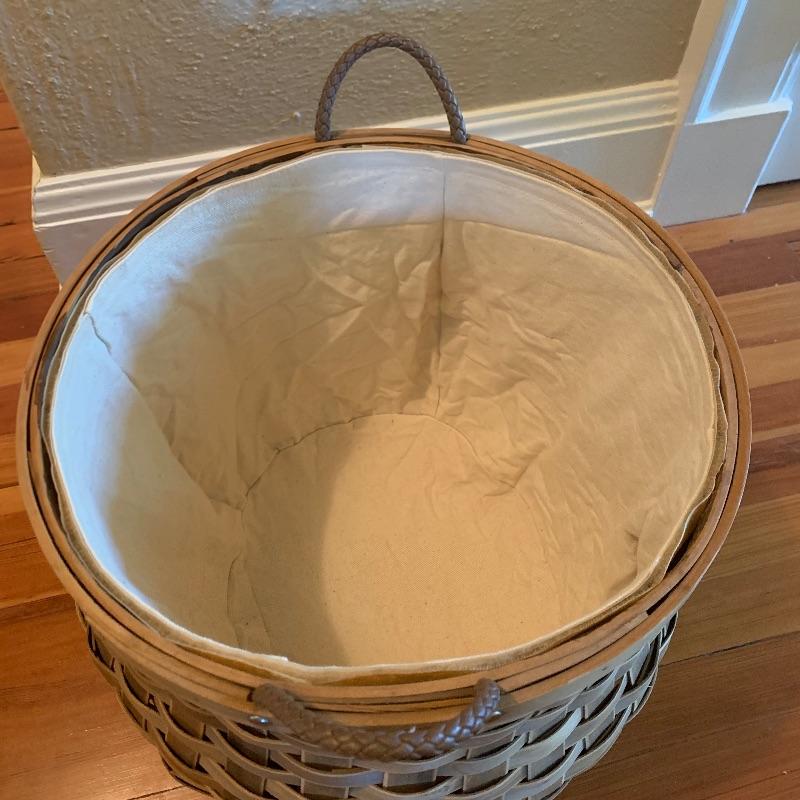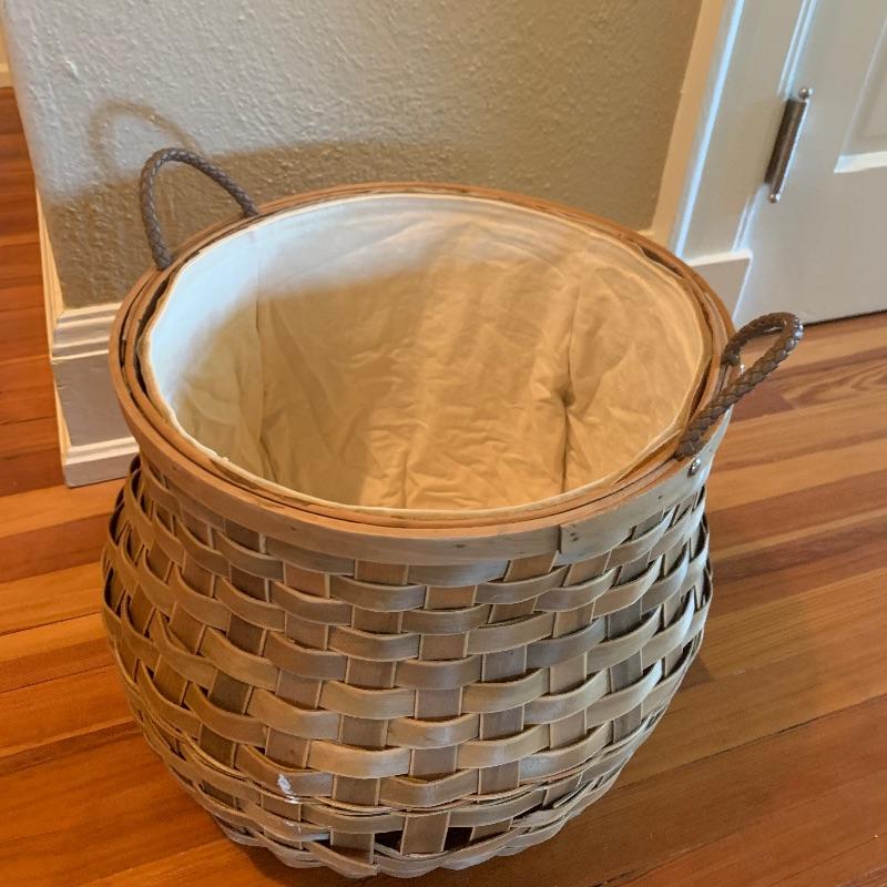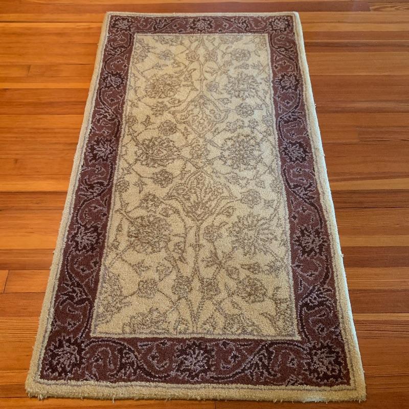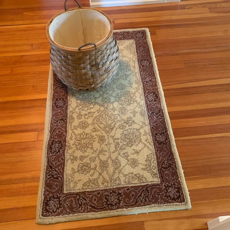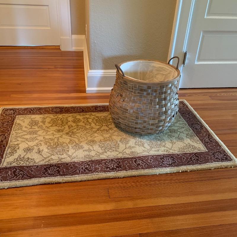 Home Decorators Collection rug, measures 30” x 55”. The rug is composed of 75% wool and 25% viscose. It is cream colored with a mauve and burgundy floral border. Slightly frayed border. Also included is a woven basket style hamper. It has two handles and a removable cotton interior lining. Some of the exterior is broken (see pictures). Local pickup only.