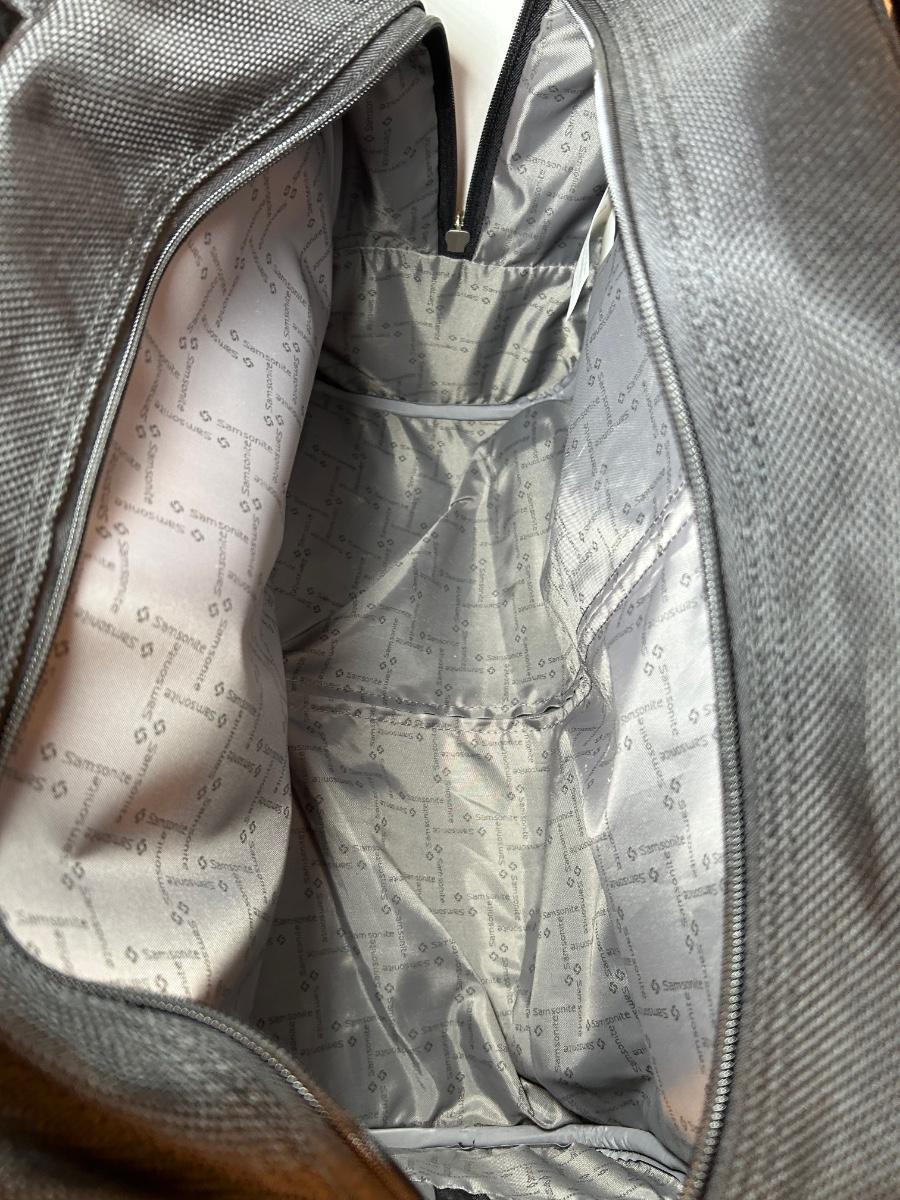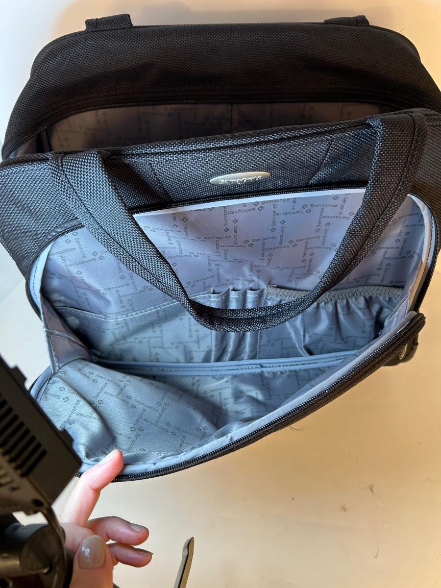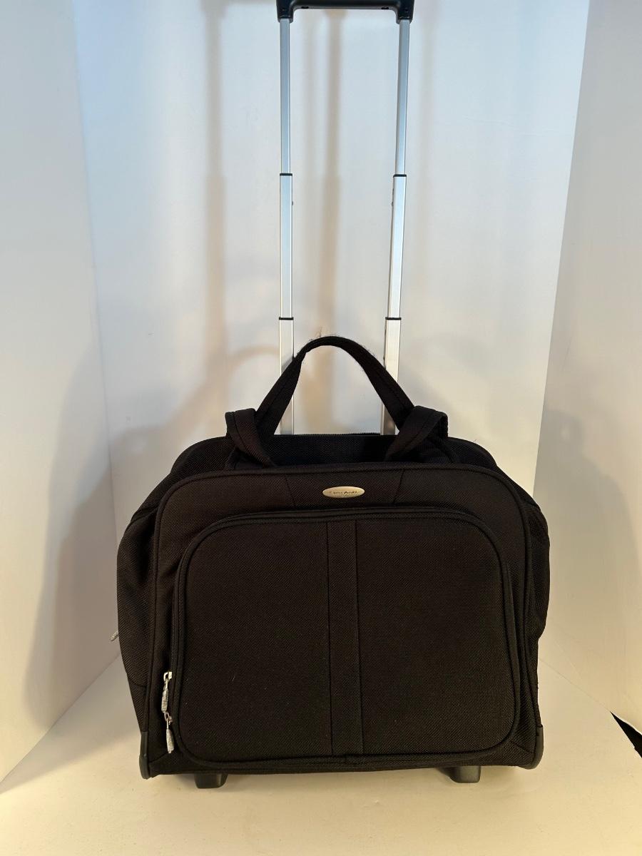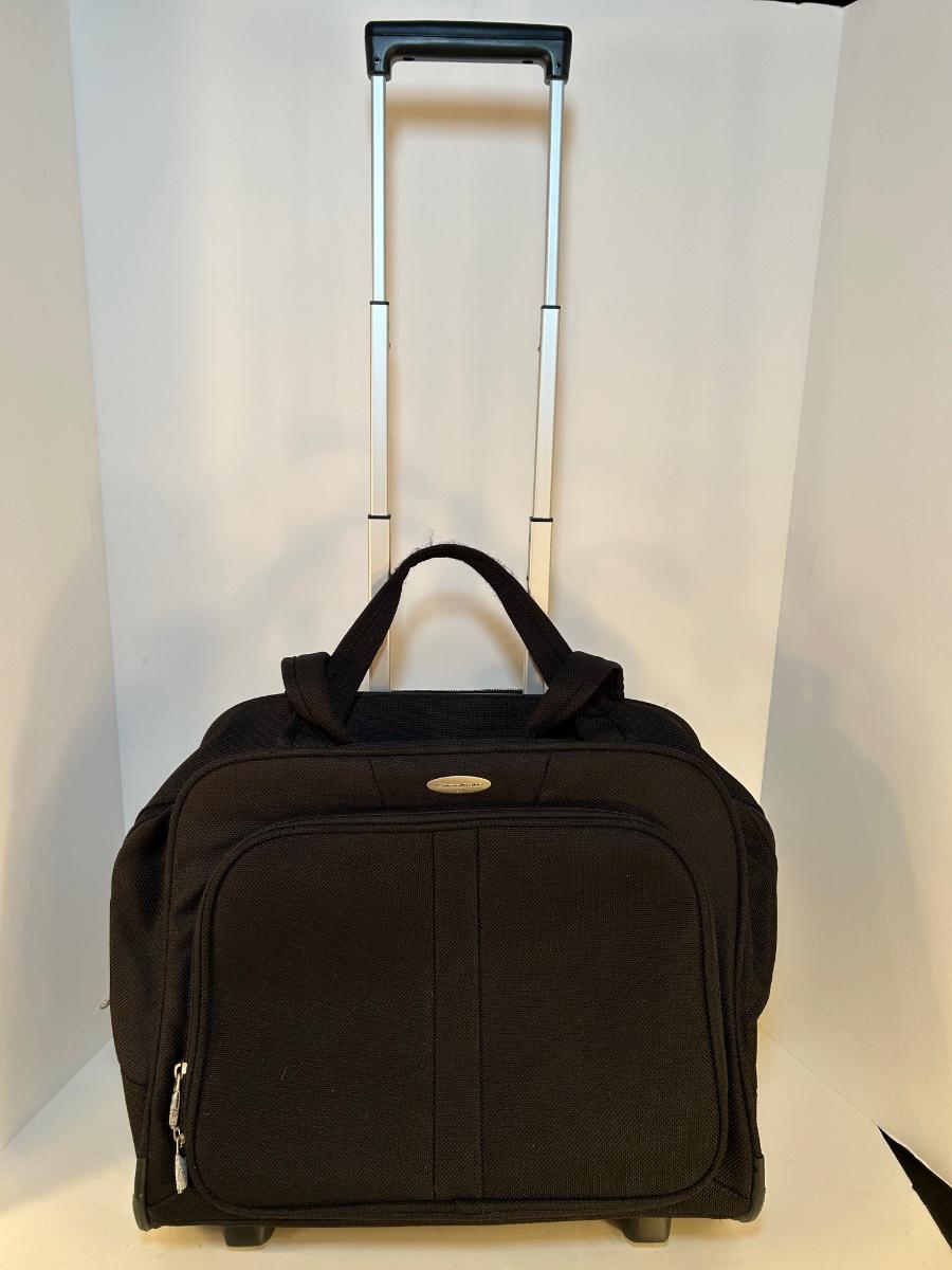 17” x 13” x 8” Samsonite black carry-on bag, rubber is coming off of the zippered handles.