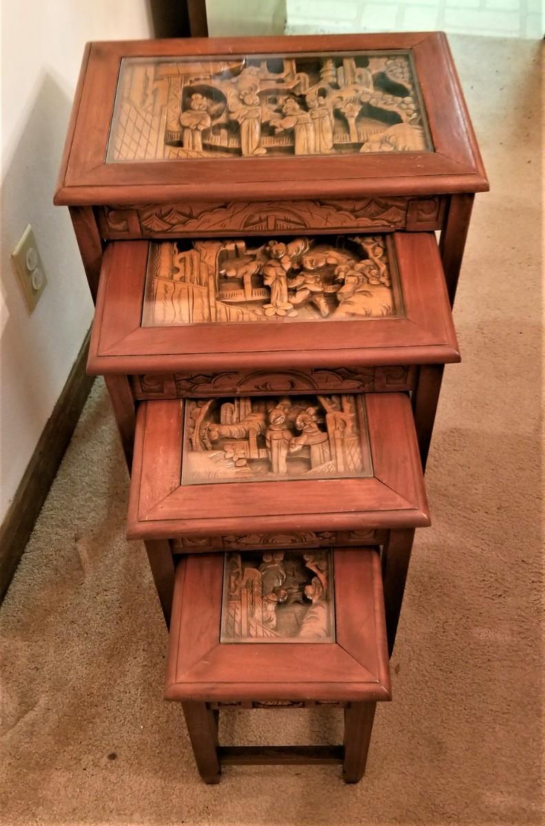 Lot #126  Set of 4 Nesting Tables with Carved Wooden Scenes