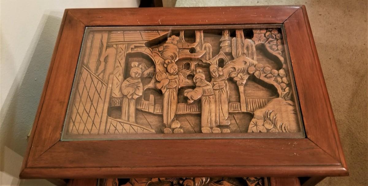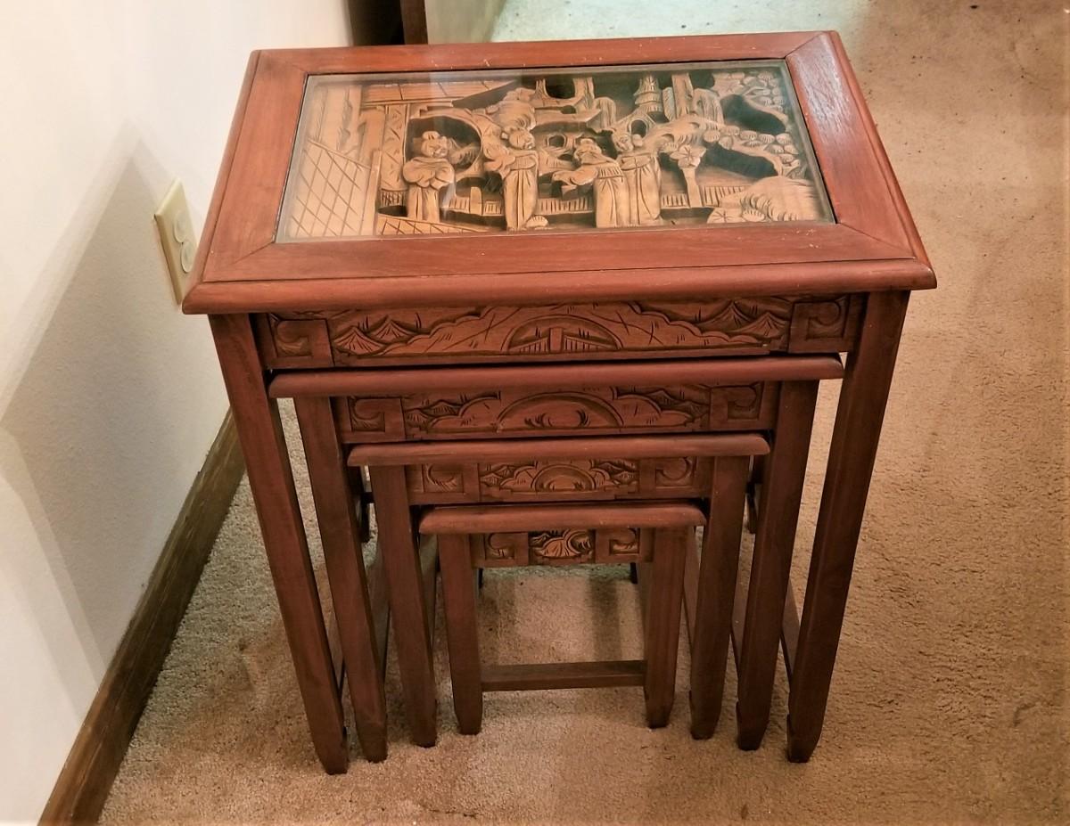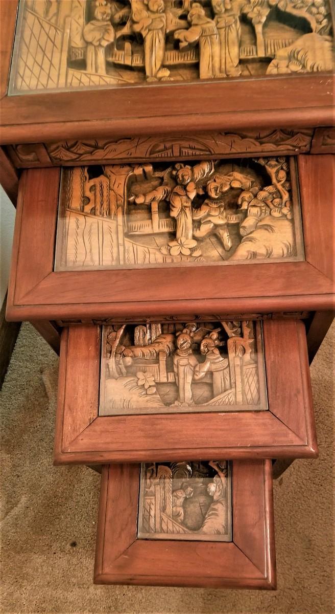 Each of these four nesting tables has a different carved Asian Scene under glass tops. For scale, the largest is 20" x 14", 23.5" tall. Good condition.