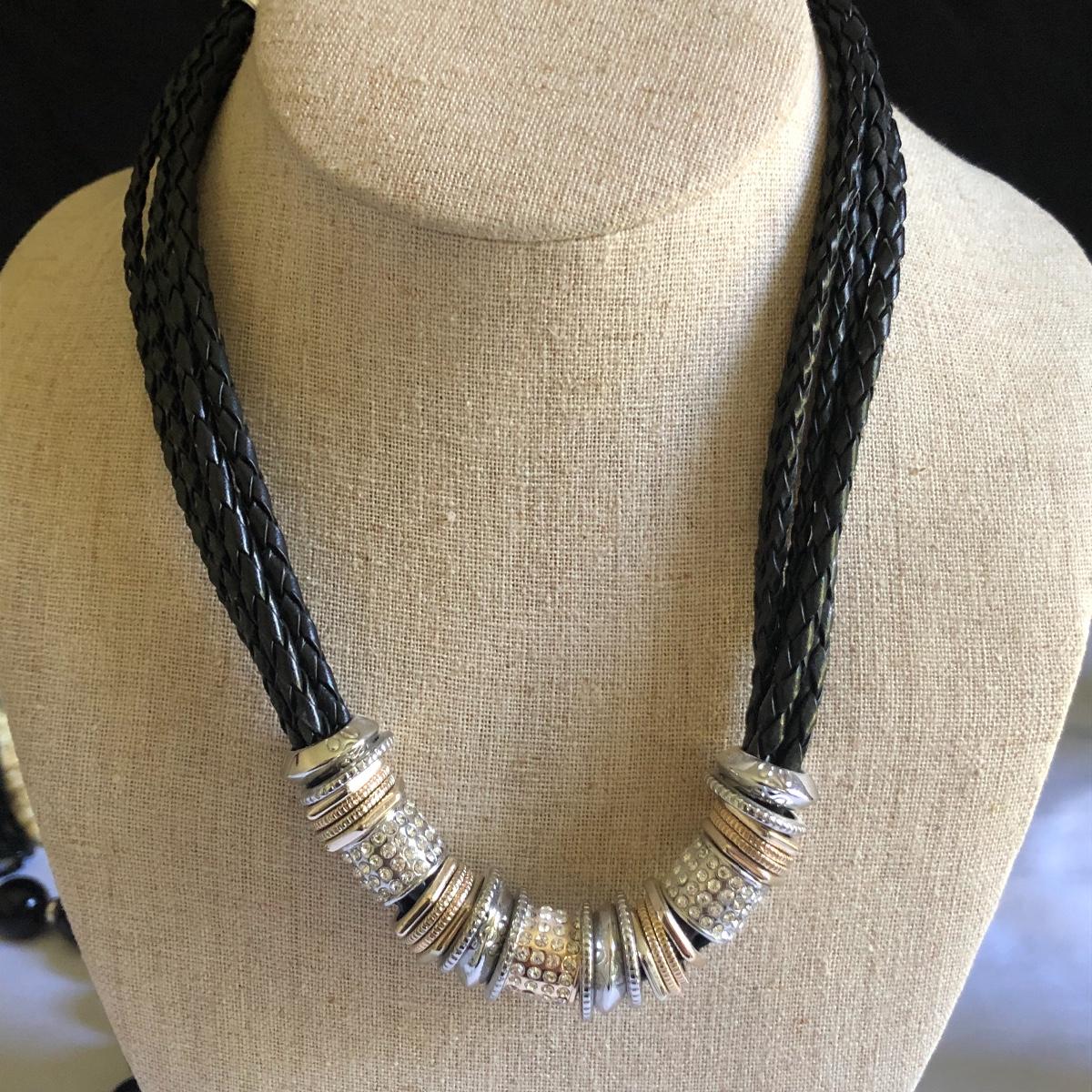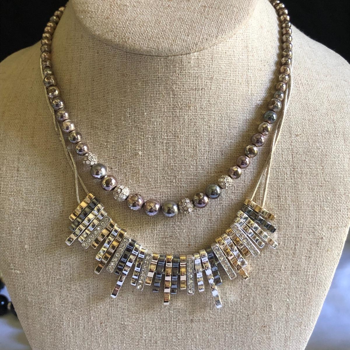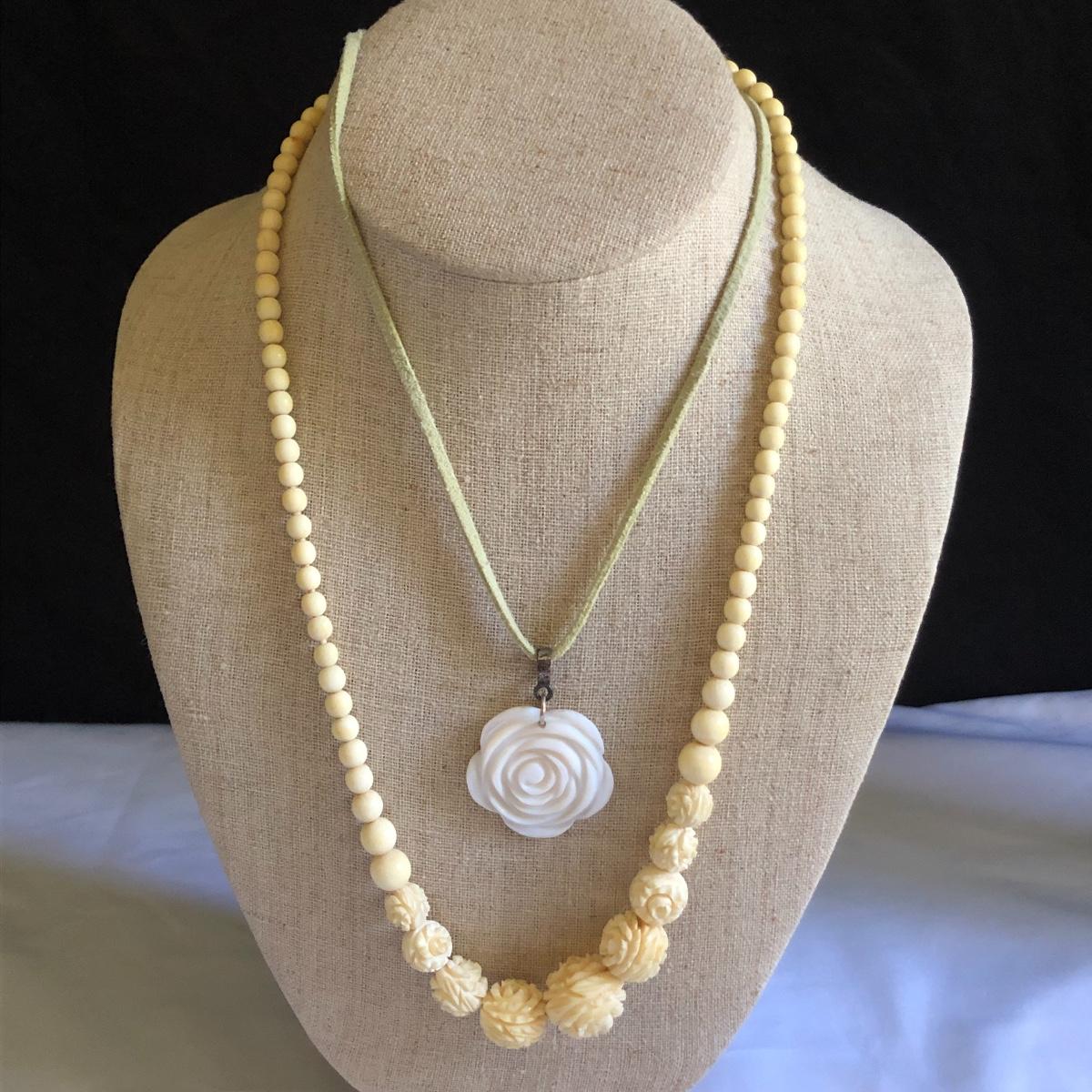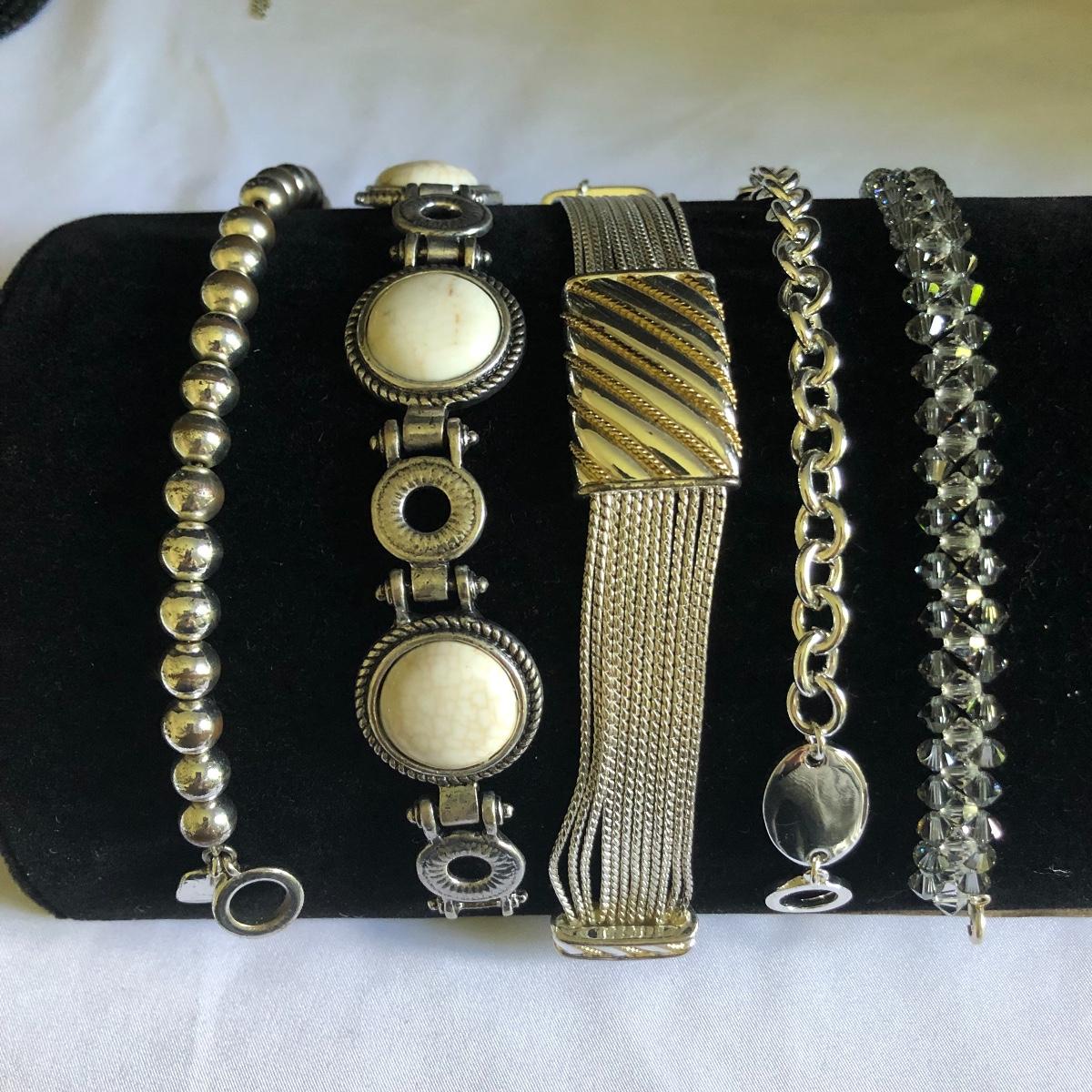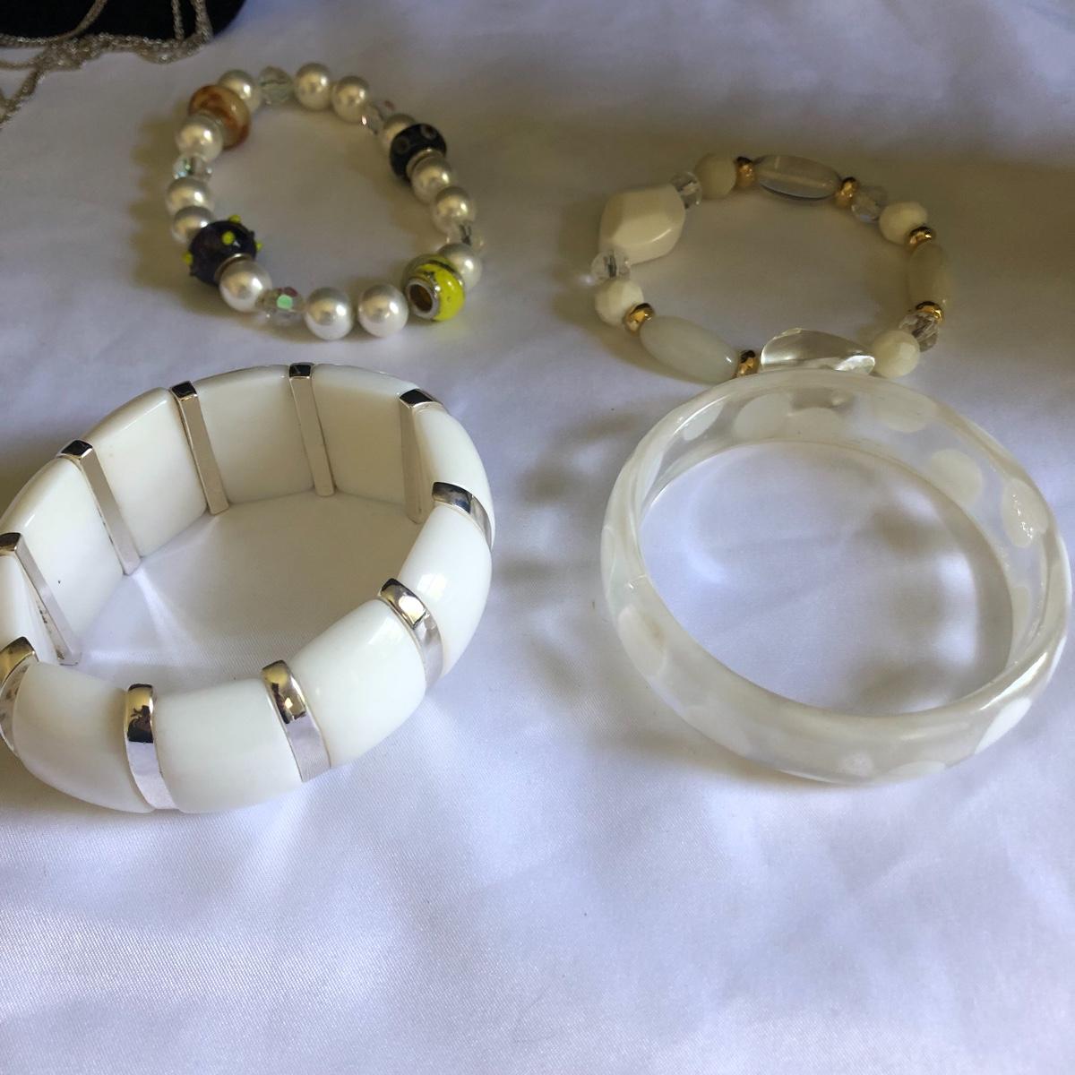 This large assortment of necklaces range from short to long, beads to chains and bling to ivory, something to put the finishing touch to any outfit! In addition to all the necklaces there are a range of bracelets from bangles to cuffs and five pairs of earrings for pierced ears. Any diamonds and the ivory pieces are faux.