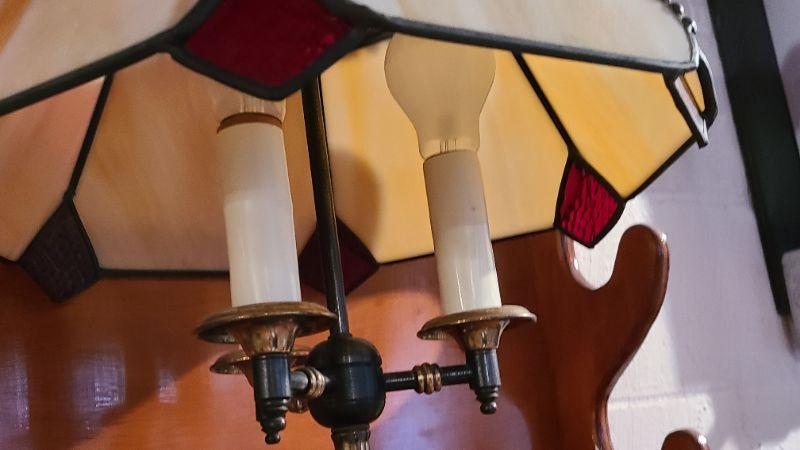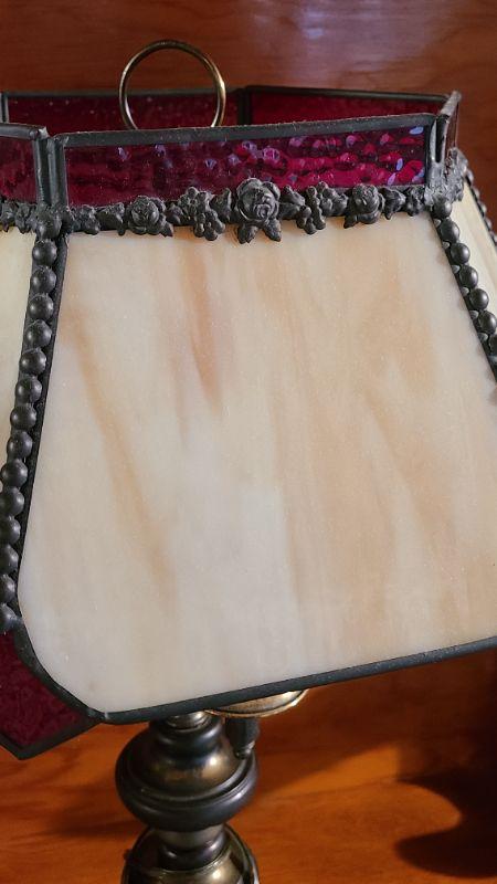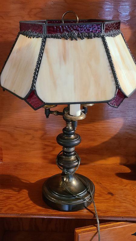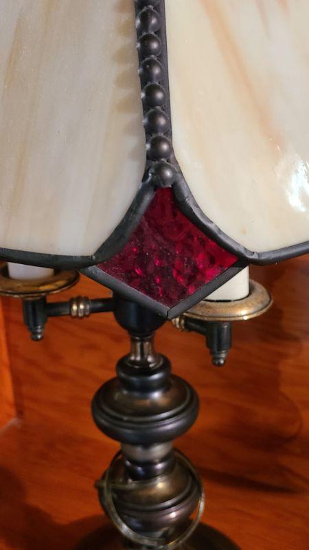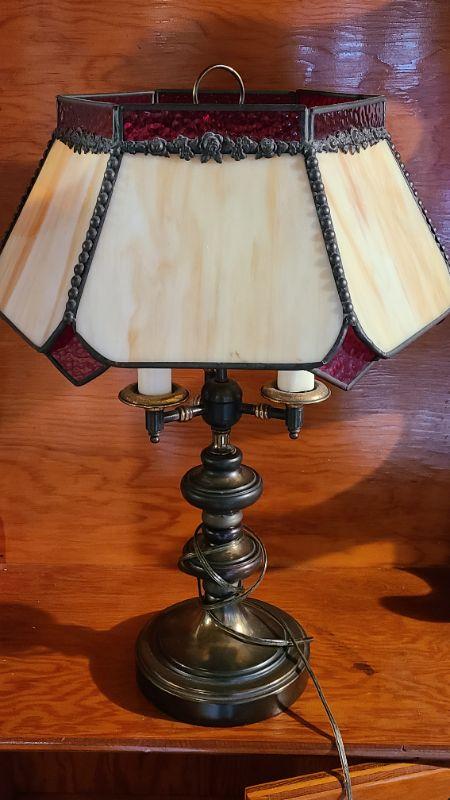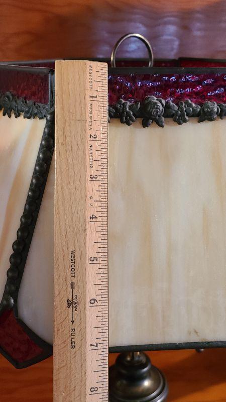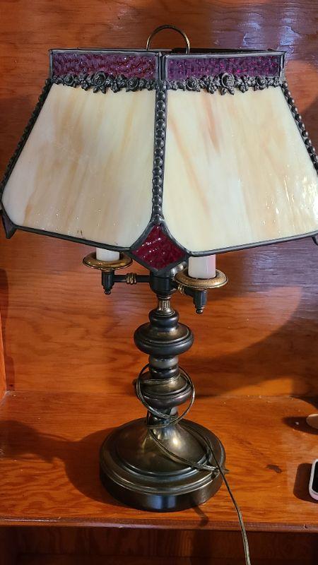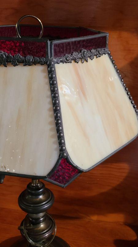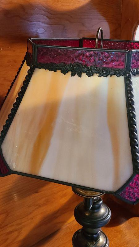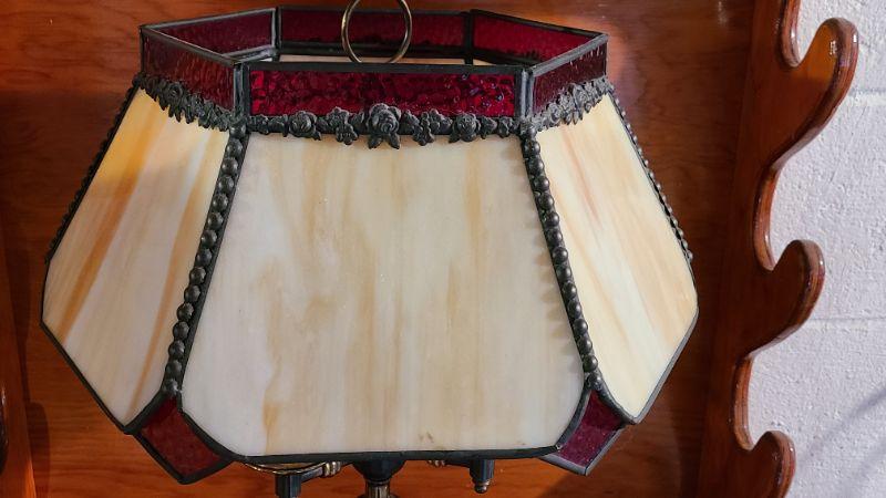 Red stained glass adornments with what looks like Slag glass. This is a three bulb light untested. CLS Please see all pictures for content of the lot, condition of the lot, and measurements if taken. Pictures are the best representation of the items listed and items are untested unless indicated in description. Thank you for looking and have fun bidding!