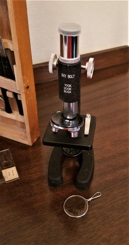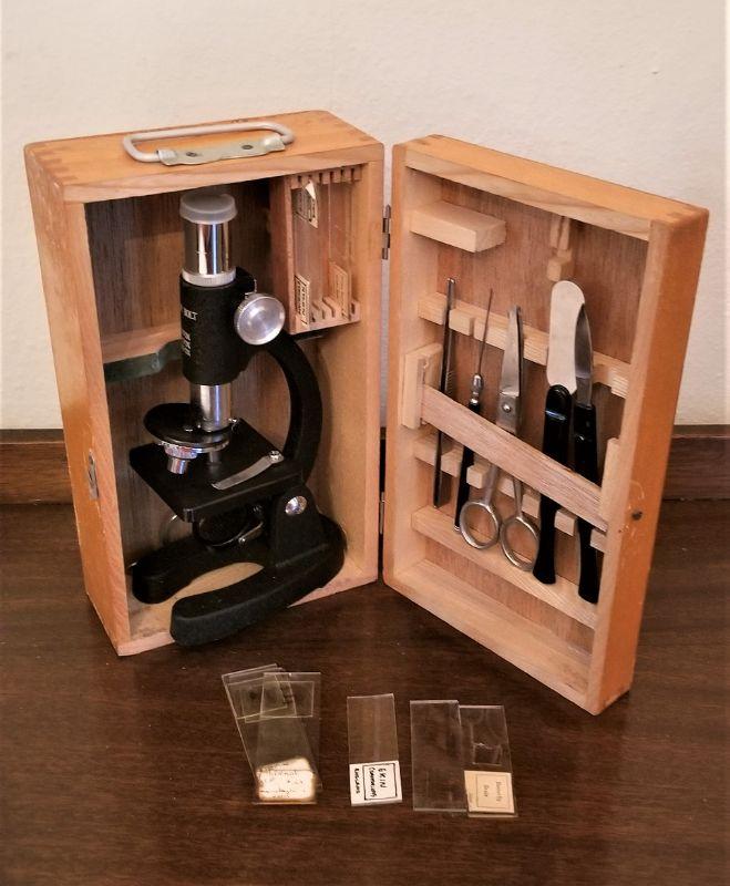 Cute student microscope with all you see here in wooden storage box. Microscope measures 8" tall.