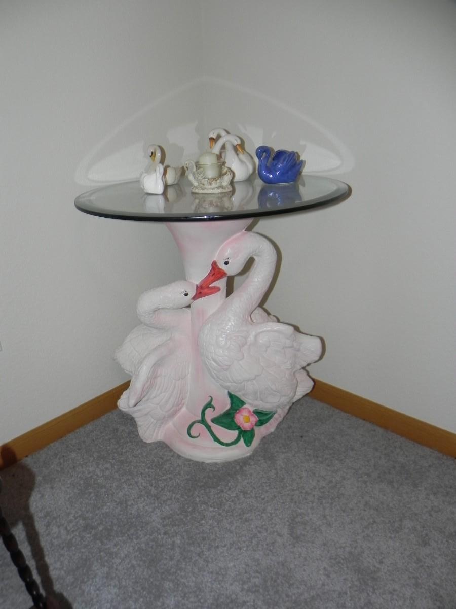 SWAN TABLE AND SWAN FIGURINES GLASS TOP MEASURES 24 ROUND STANDS 28 TALL
