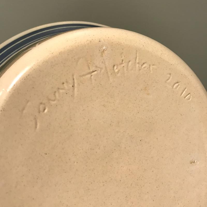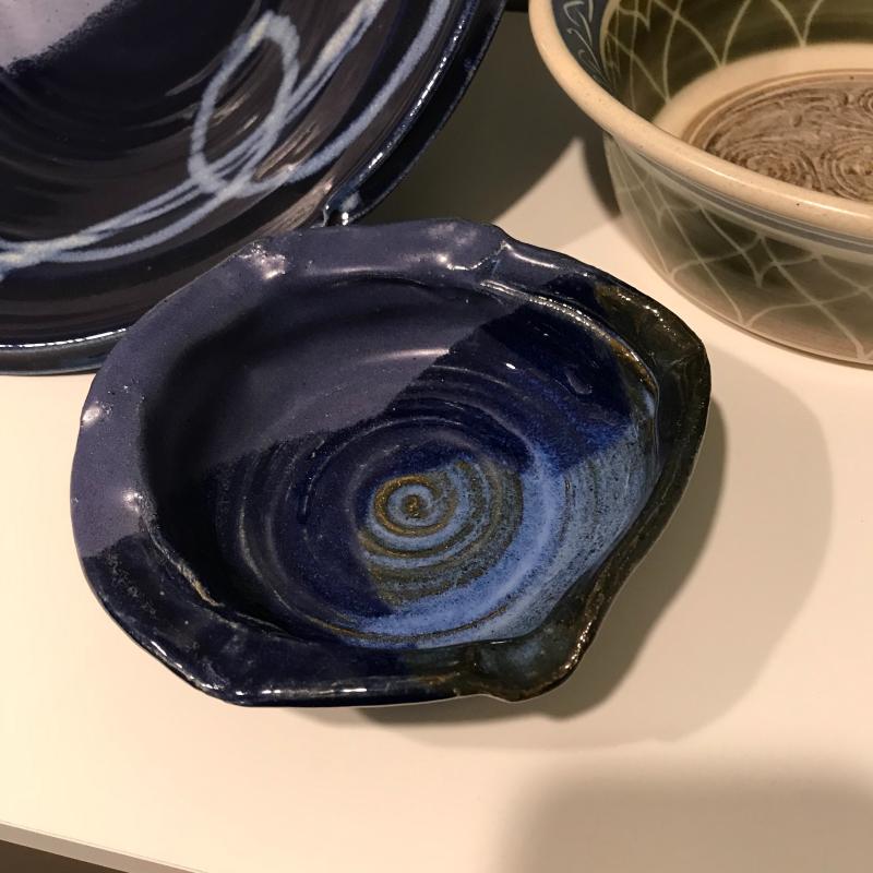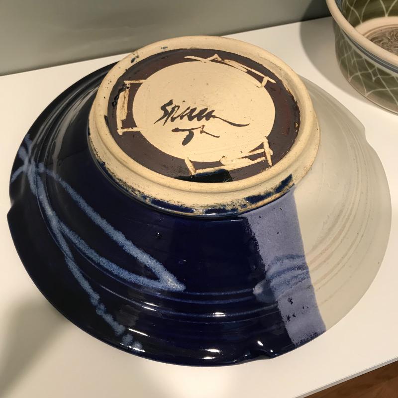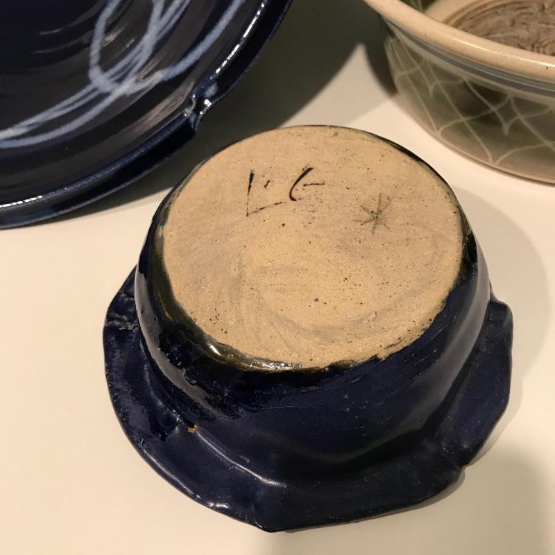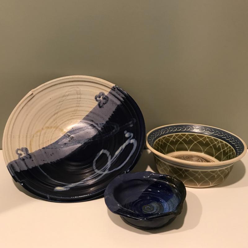 Nice blue toned trio of pottery pieces, the largest is 3.25” tall with a diameter of 12.5”. Signatures noted in photos. Local pick up or shipping available.