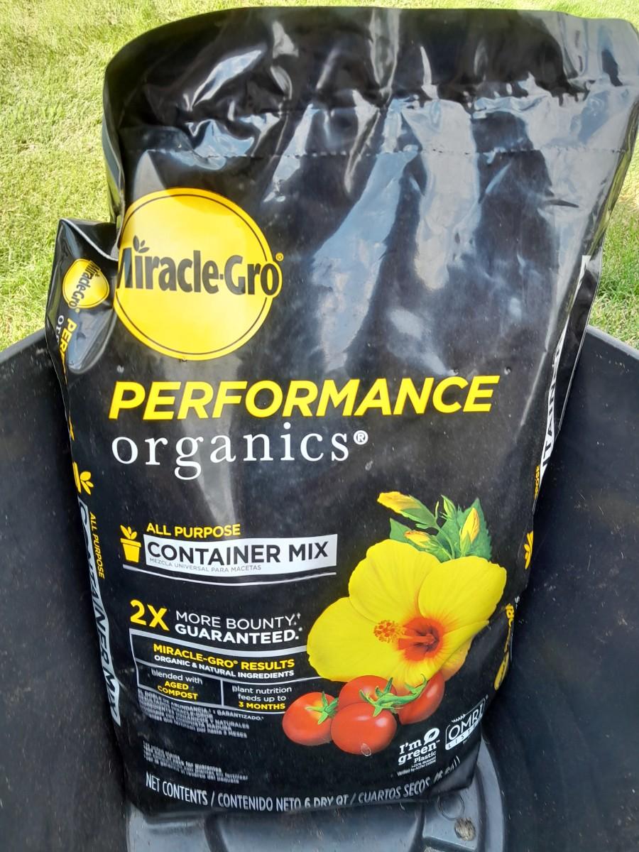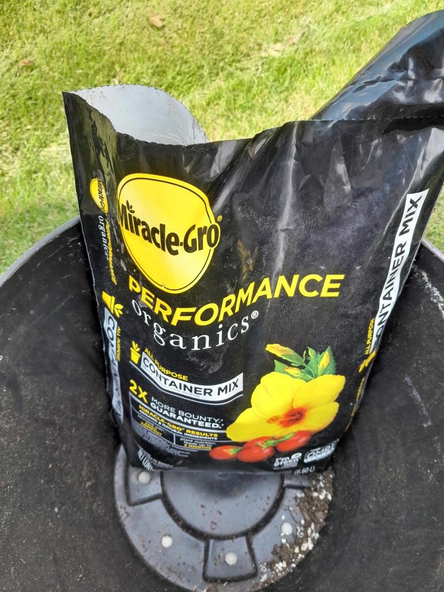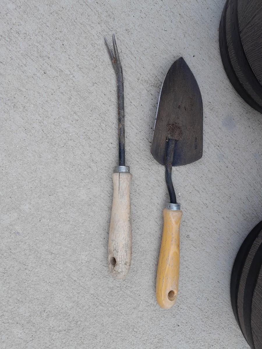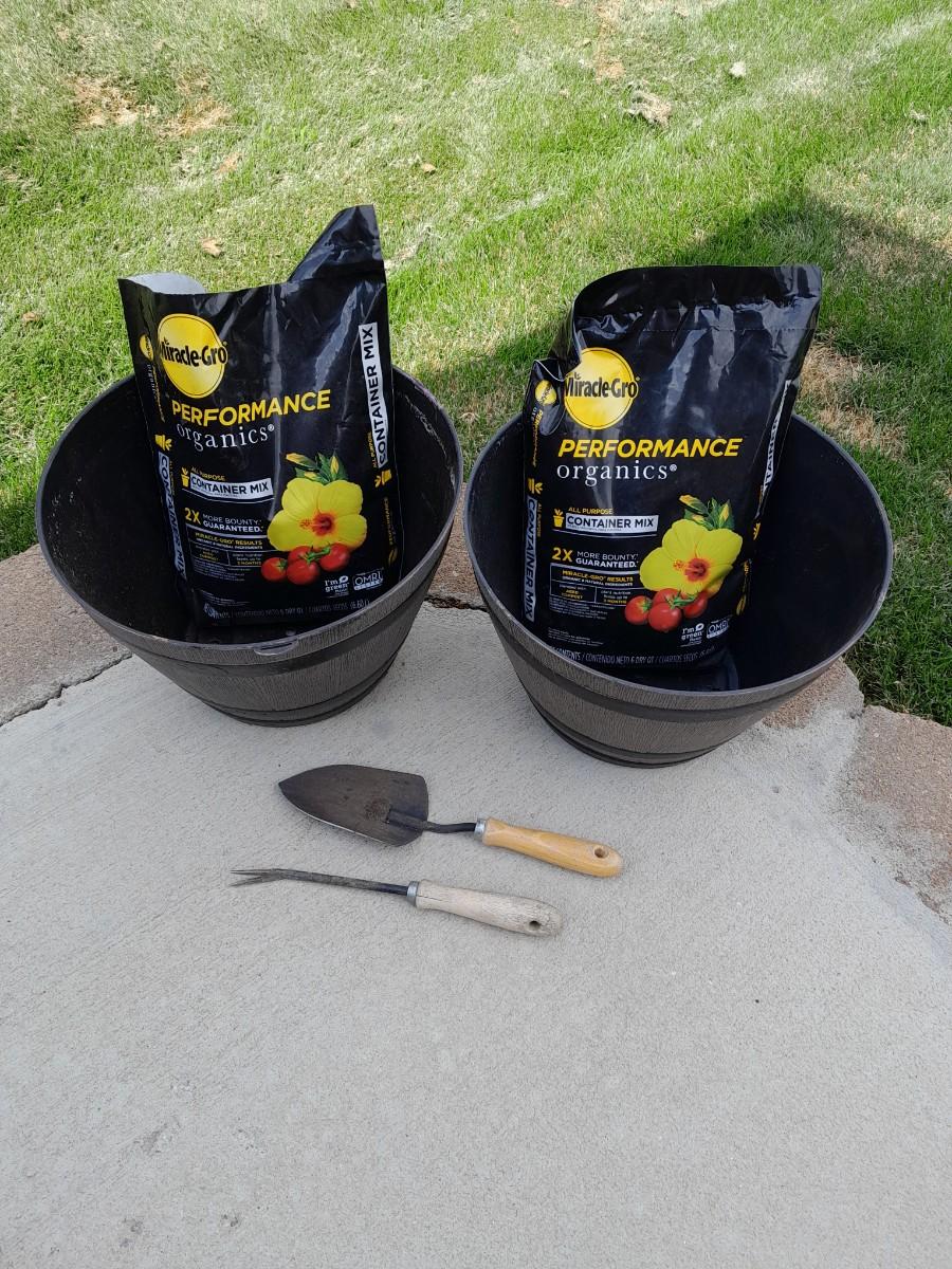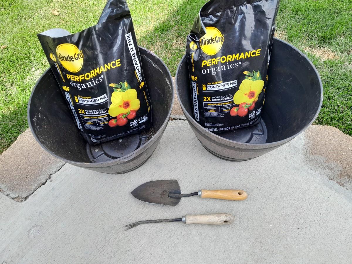 TWO SMALL PLASTIC FLOWER HALF BARRELS, ONE BAG, AND ONE PARTIAL BAG OF MIRACL GRO ORGANIC SOIL, A SHOVEL AND A WEED TOOL.