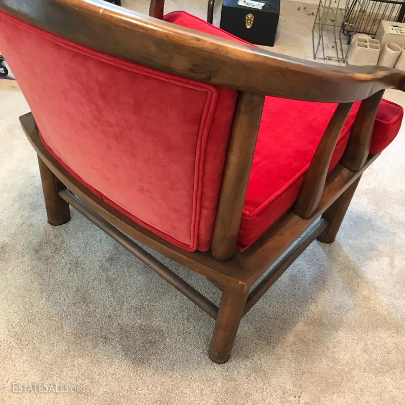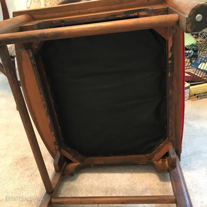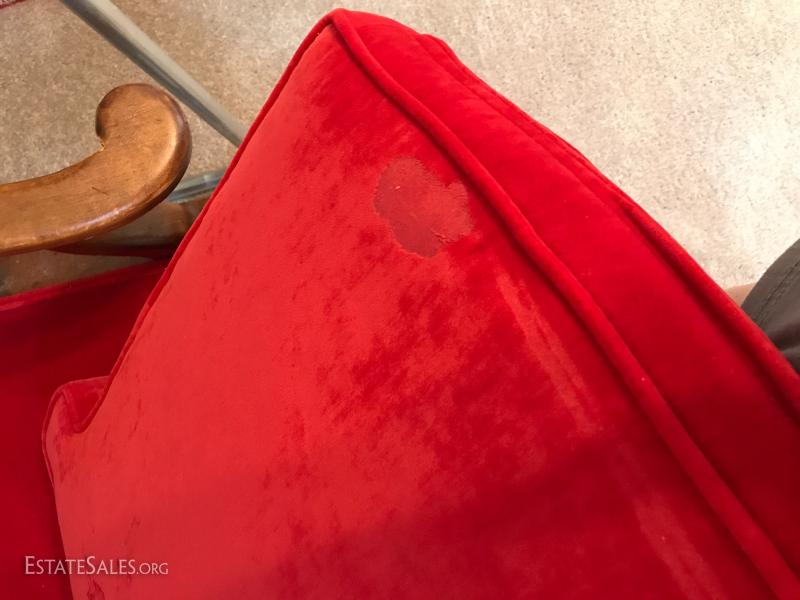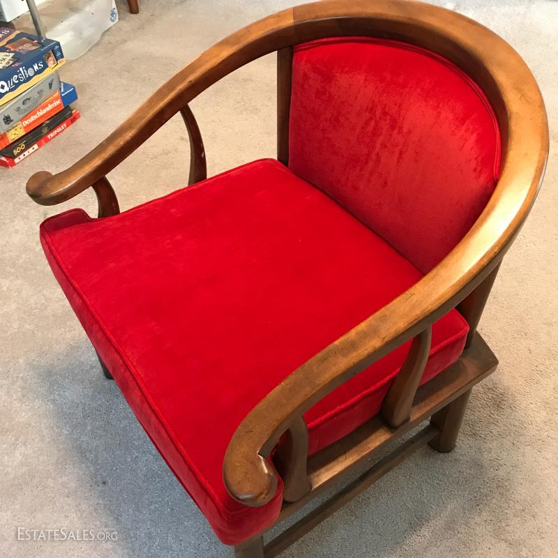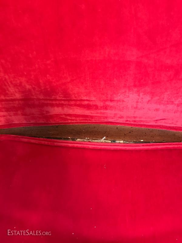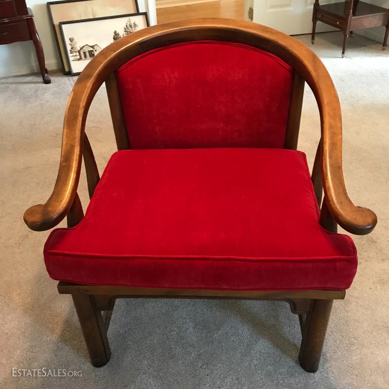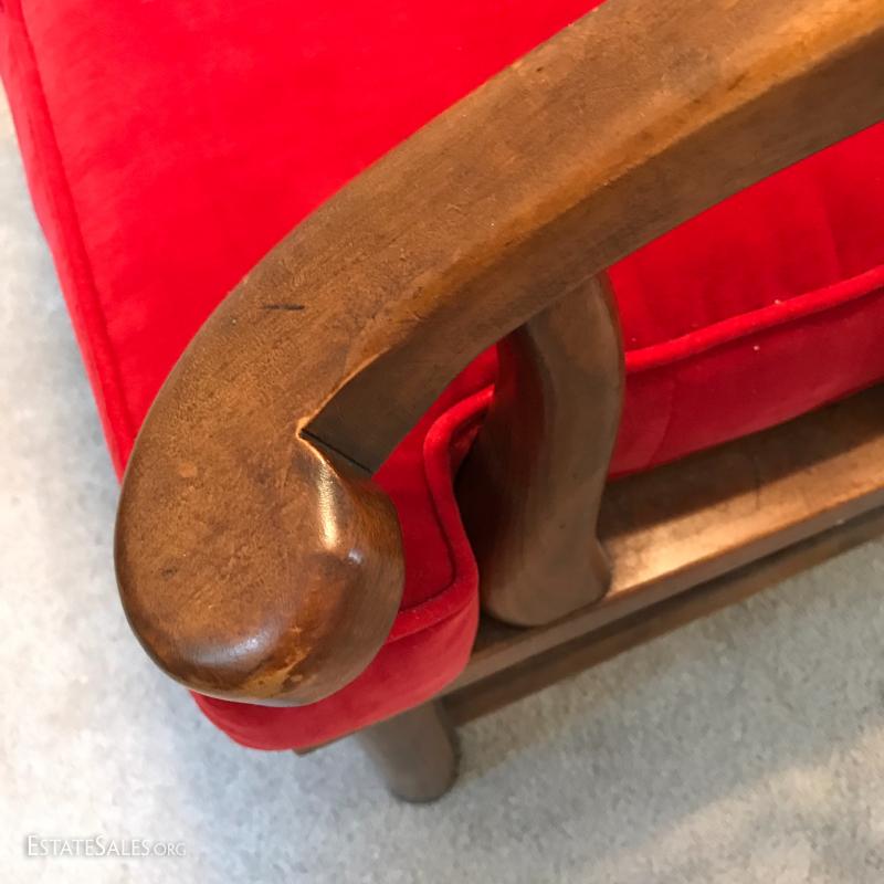 Solid, comfortable armchair with red velvet upholstery. Some scuffs on wood, small stain on underside of cushion, and fabric needs to be retacked to base in one place but otherwise in good condition. Approx. 29"l x 28"w x30"h. See photos for details.
