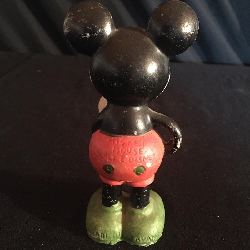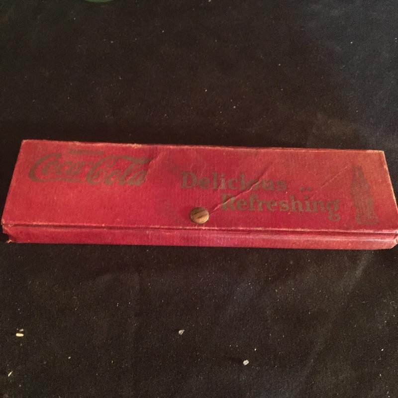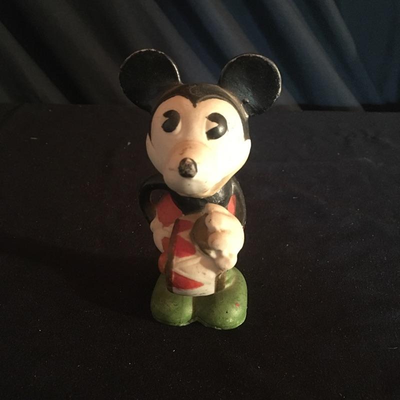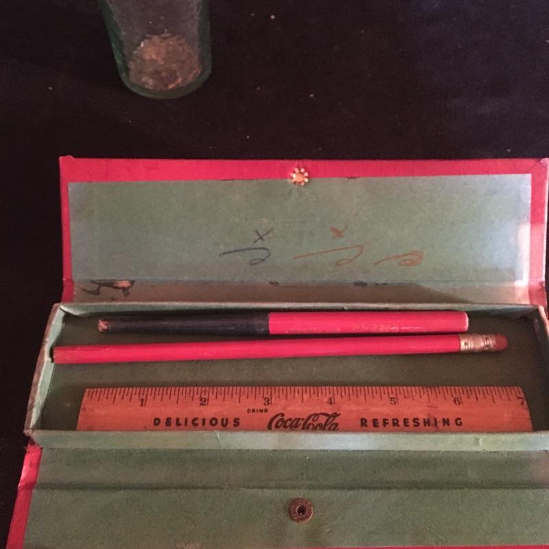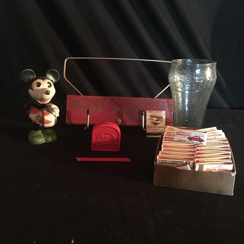 This will bring back childhood memories with this compilation of vintage items that includes Japanese made Mickey Mouse playing drum, Coca Cola pencil box with pencil wooden ruler and two colored pencil and a glass, Sears tape measure, box of Renault Dauphine matches from Jarrard Motors and a skinny pencil marked Time the weekly newsmagazine. Mickey measures 2.5” x 2.75” x 5.5”.