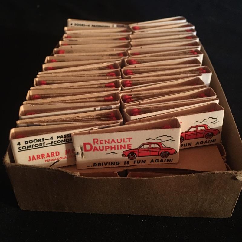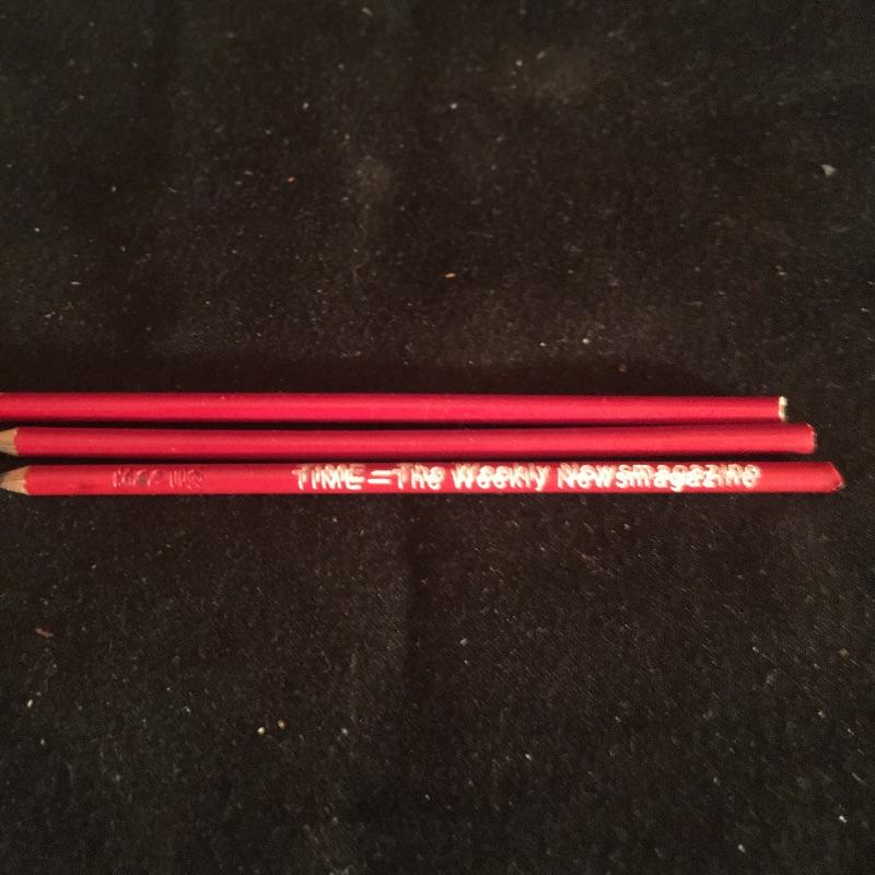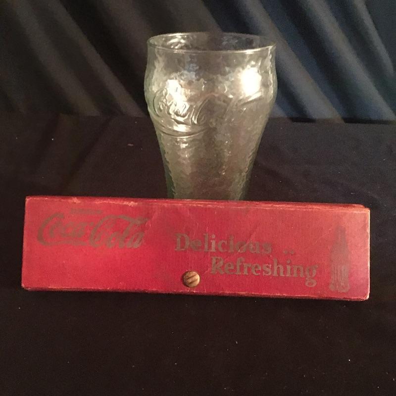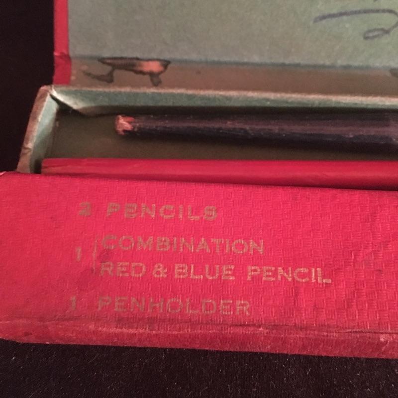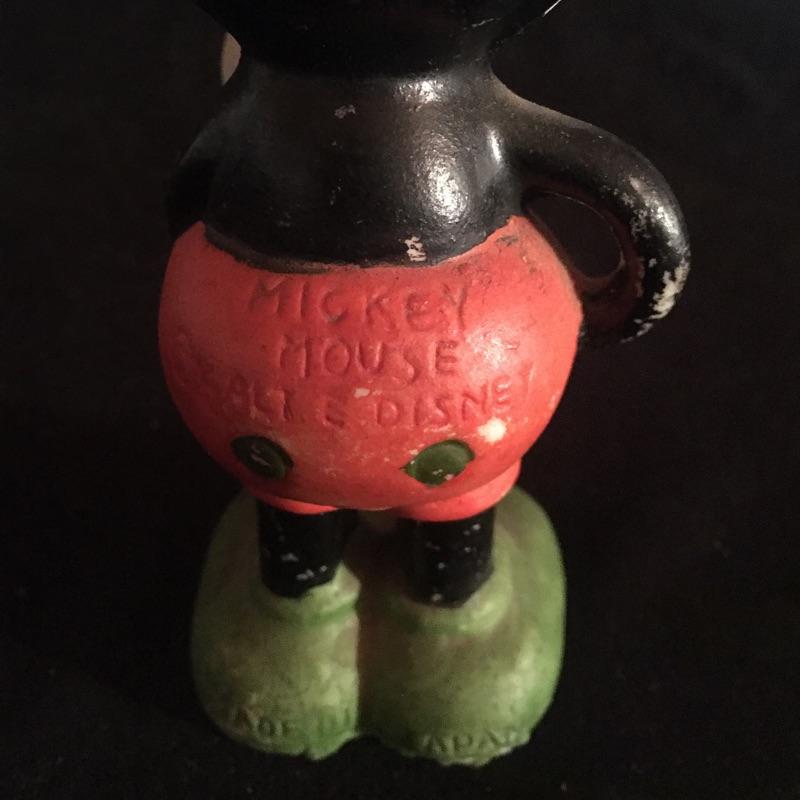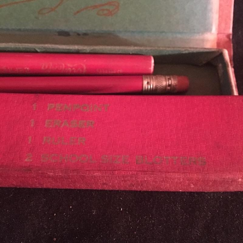 This will bring back childhood memories with this compilation of vintage items that includes Japanese made Mickey Mouse playing drum, Coca Cola pencil box with pencil wooden ruler and two colored pencil and a glass, Sears tape measure, box of Renault Dauphine matches from Jarrard Motors and a skinny pencil marked Time the weekly newsmagazine. Mickey measures 2.5” x 2.75” x 5.5”.