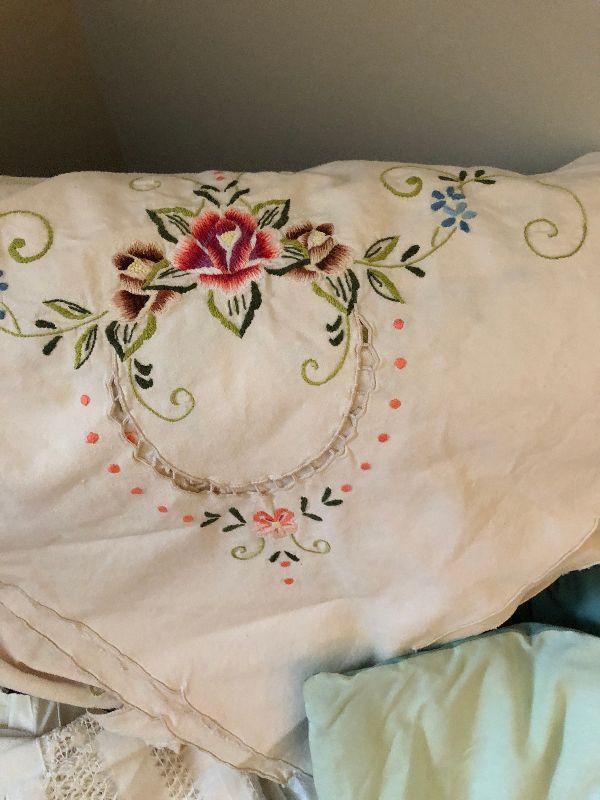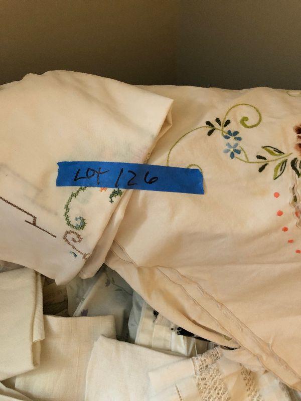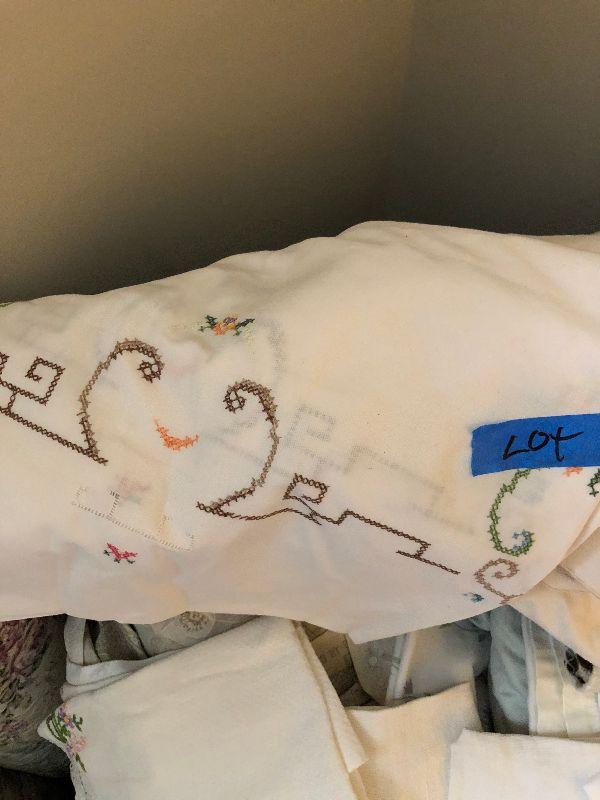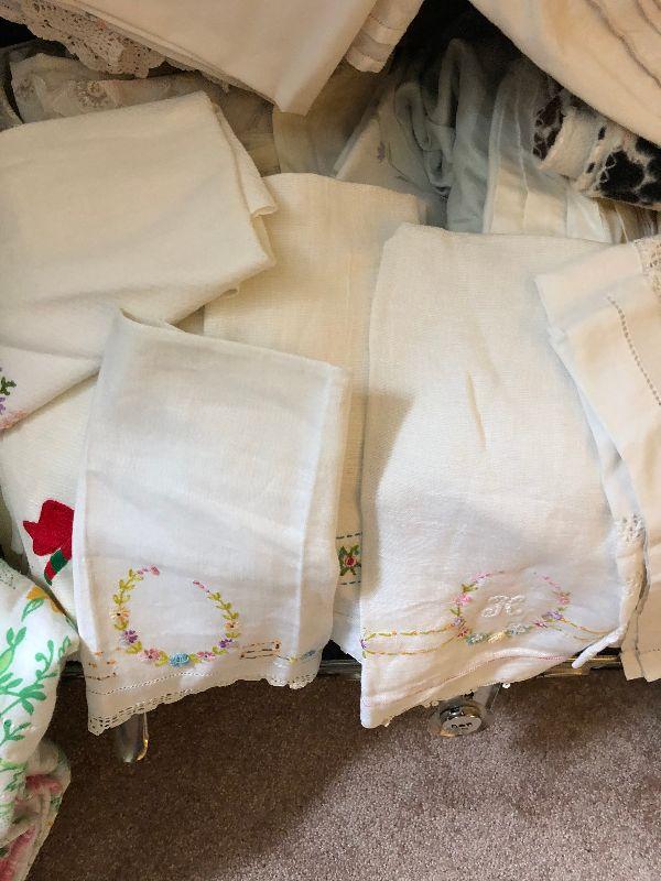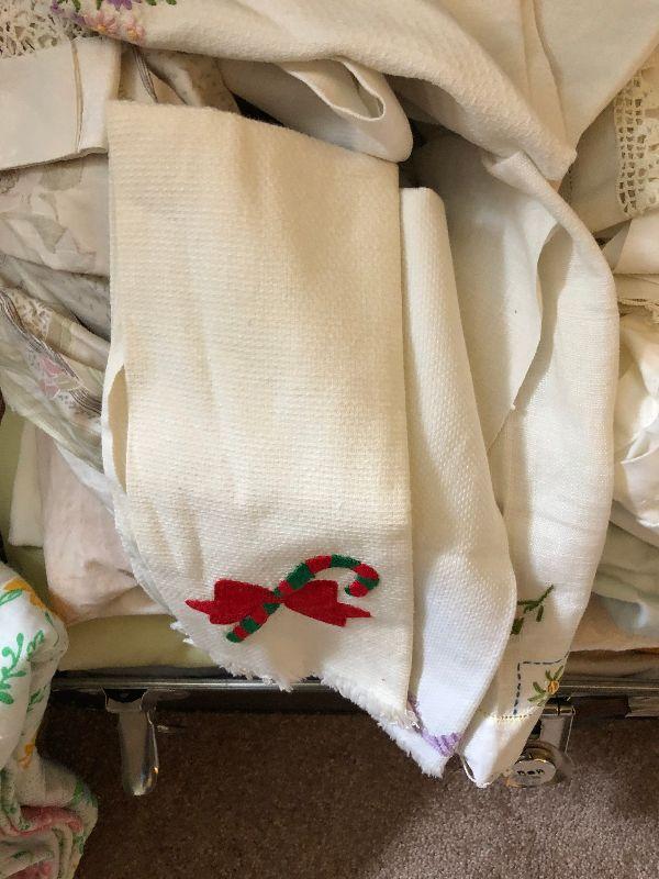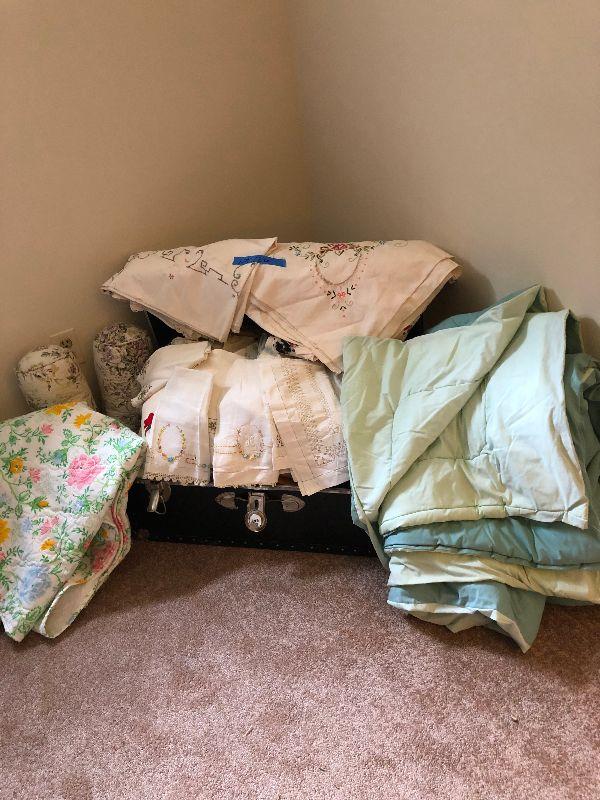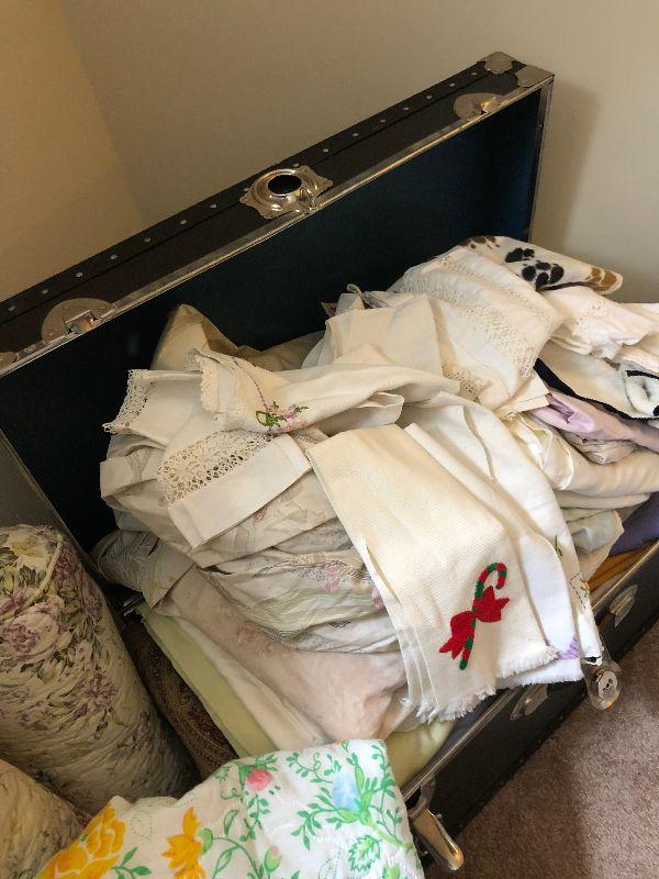 Trunk (labeled GAMP, vintage tablecloths and tea towels, bedding and other miscellaneous items.