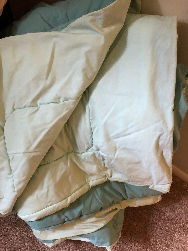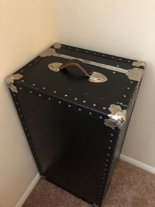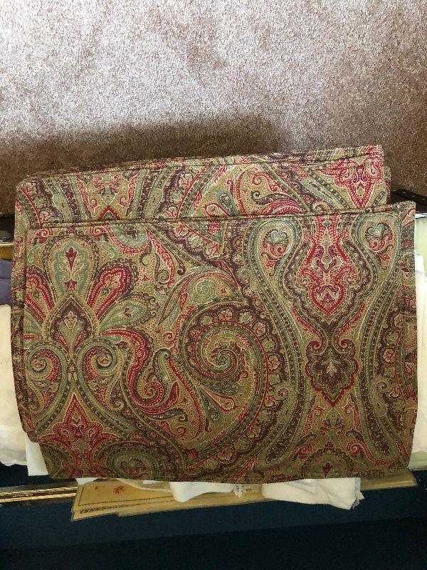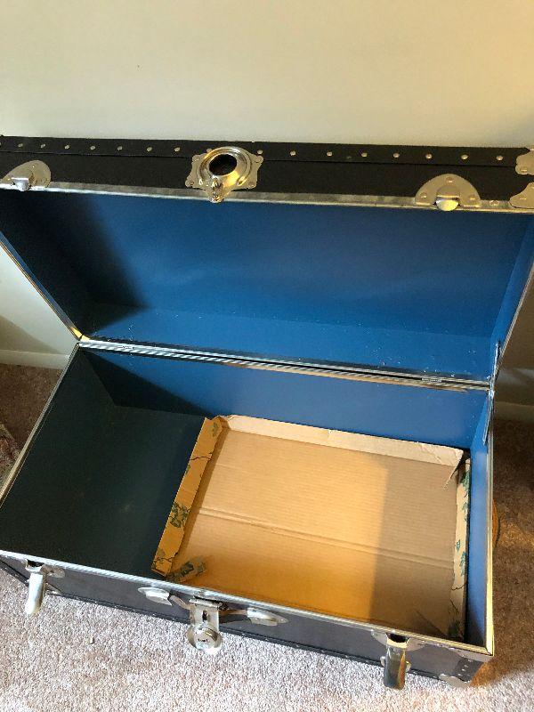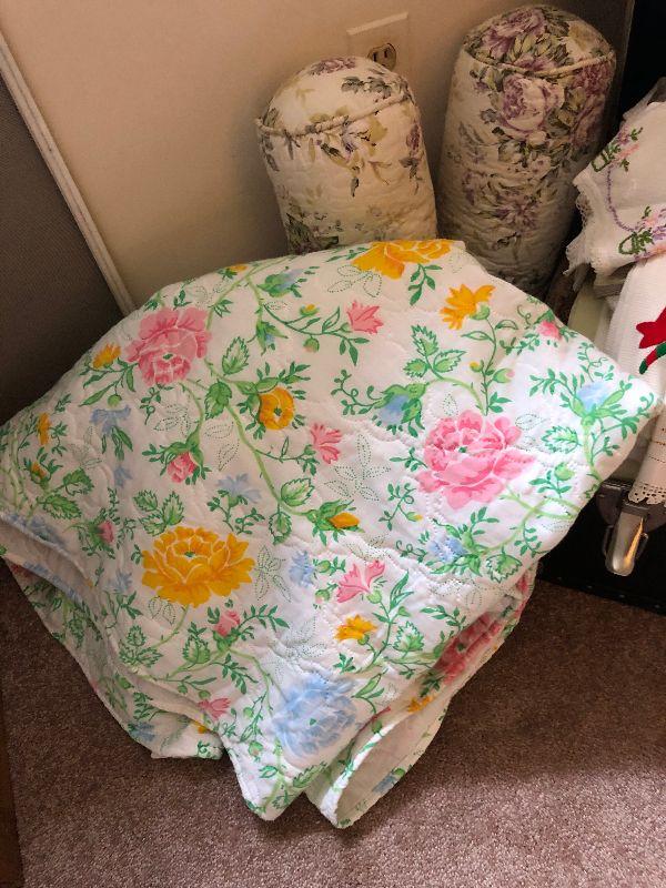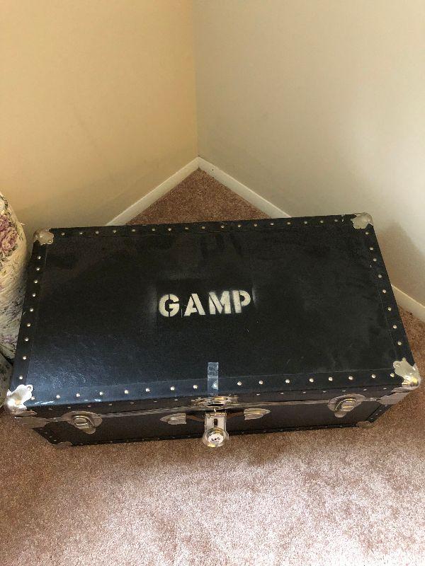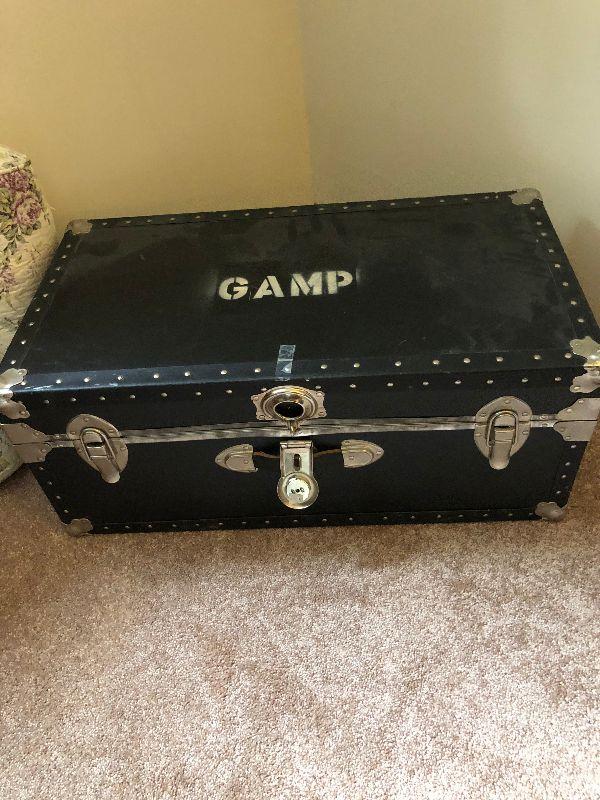Trunk (labeled GAMP, vintage tablecloths and tea towels, bedding and other miscellaneous items.