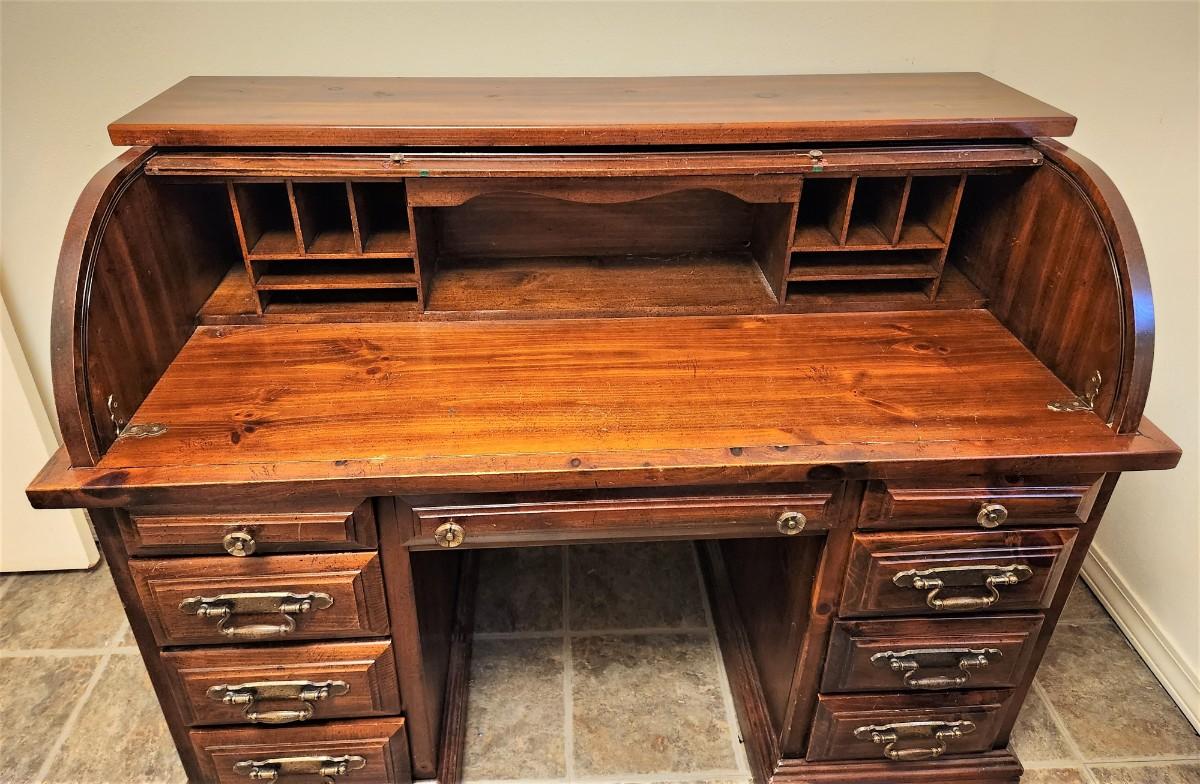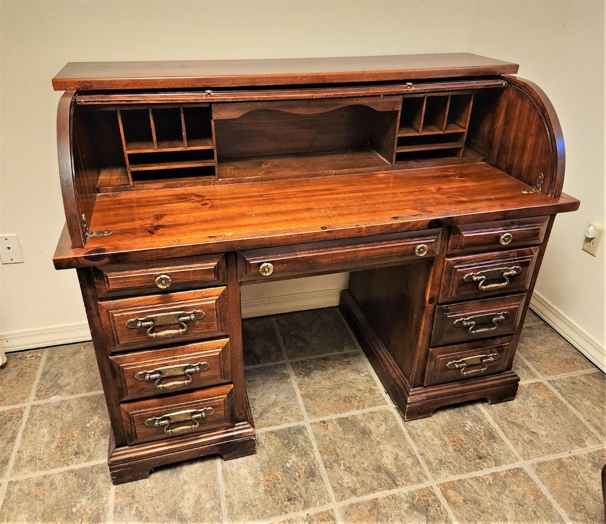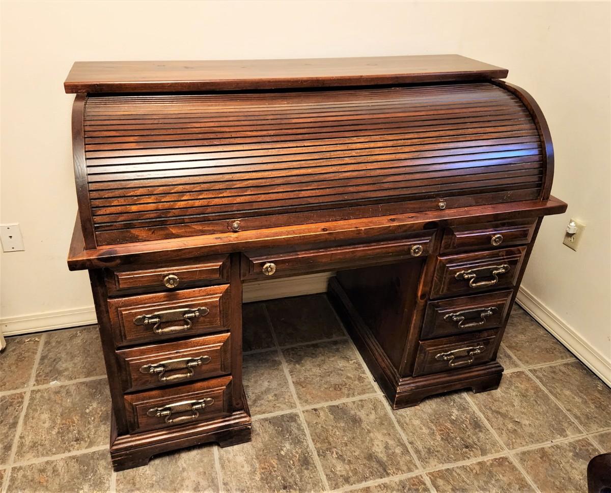 Rock Maple vintage Roll Top Desk - solid wood, heavy. If you purchase this you will need two strong guys to take it out of the house and load it - we cannot assist. Original hardware, 8 drawers (1 a file drawer). Roll top works well enough - there is one small hole punched through at the top - small, but we wanted to mention. 27" deep, 54" across, 42.5" tall. Used condition.